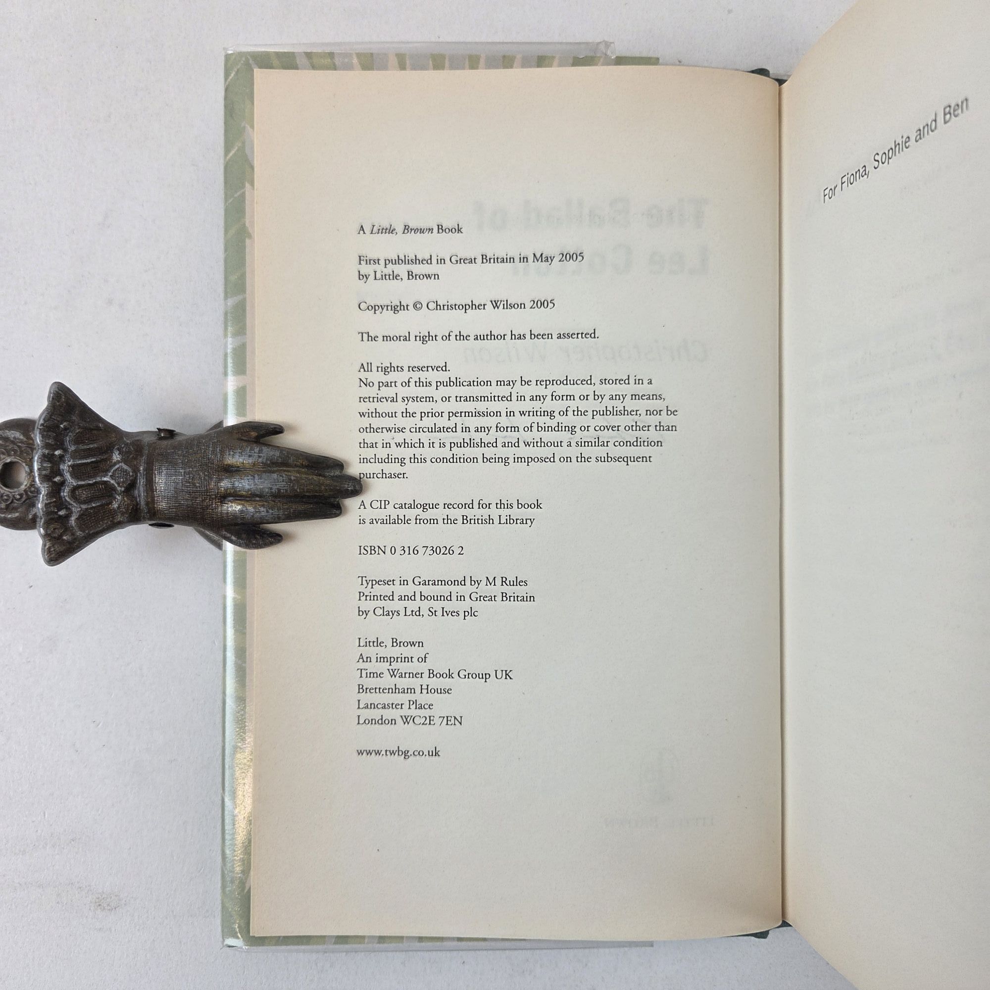London, UK: Little, Brown, 2005. First Edition, First Printing. Hardcover. Octavo, 307 pages. In Very Good condition with Very Good condition dust jacket. Spine is pale green and cream with dark red and black lettering. Dust jacket protected by mylar covering, price uncut: "£14.99" on front flap, has mild sun-fading along spine. Textblock has moderate age-toning along edges; mild toning throughout interior. Signed flat on title page by Christopher Wilson. Shelved Room C overflow. 1405031. Special Collections.