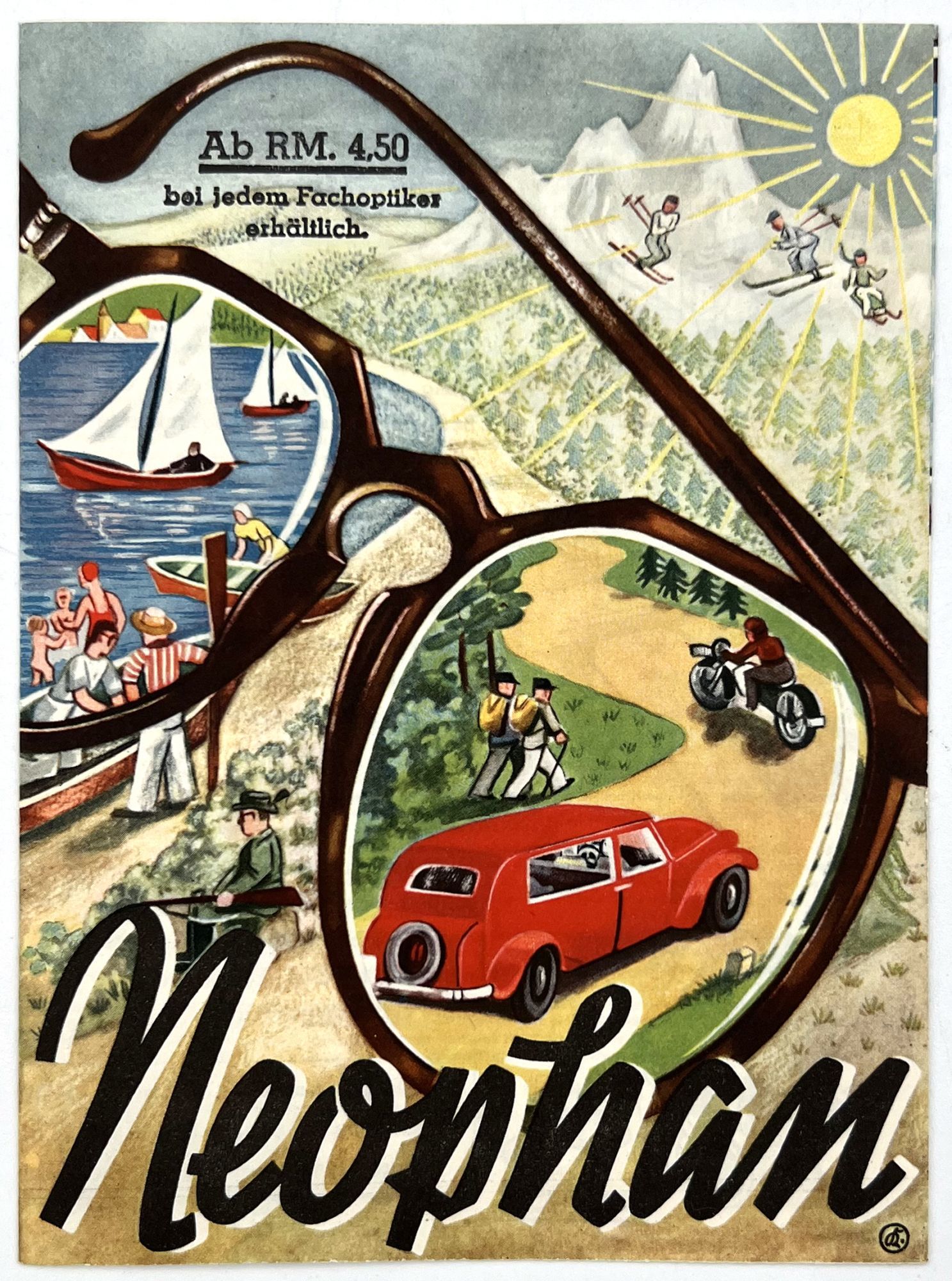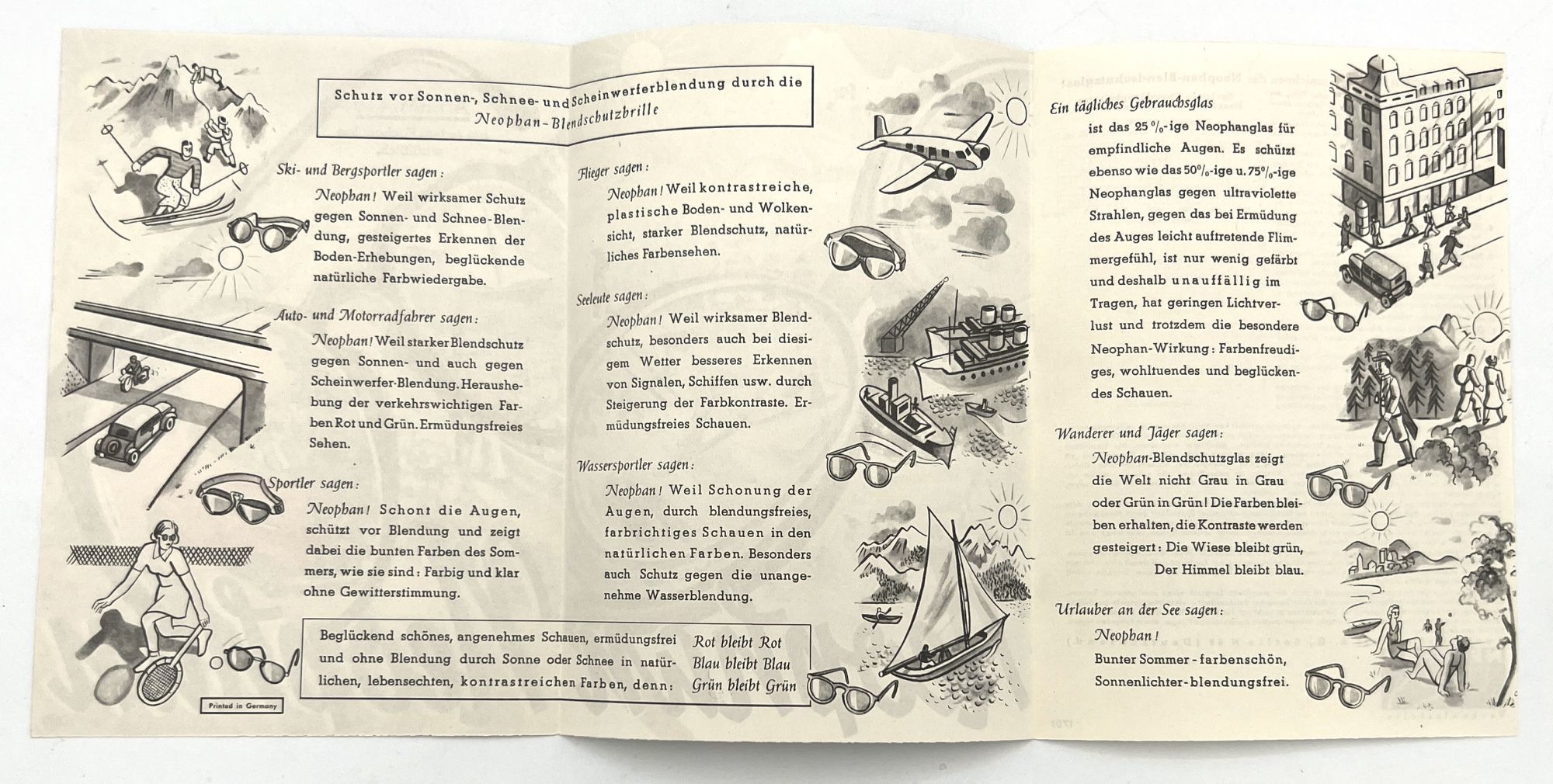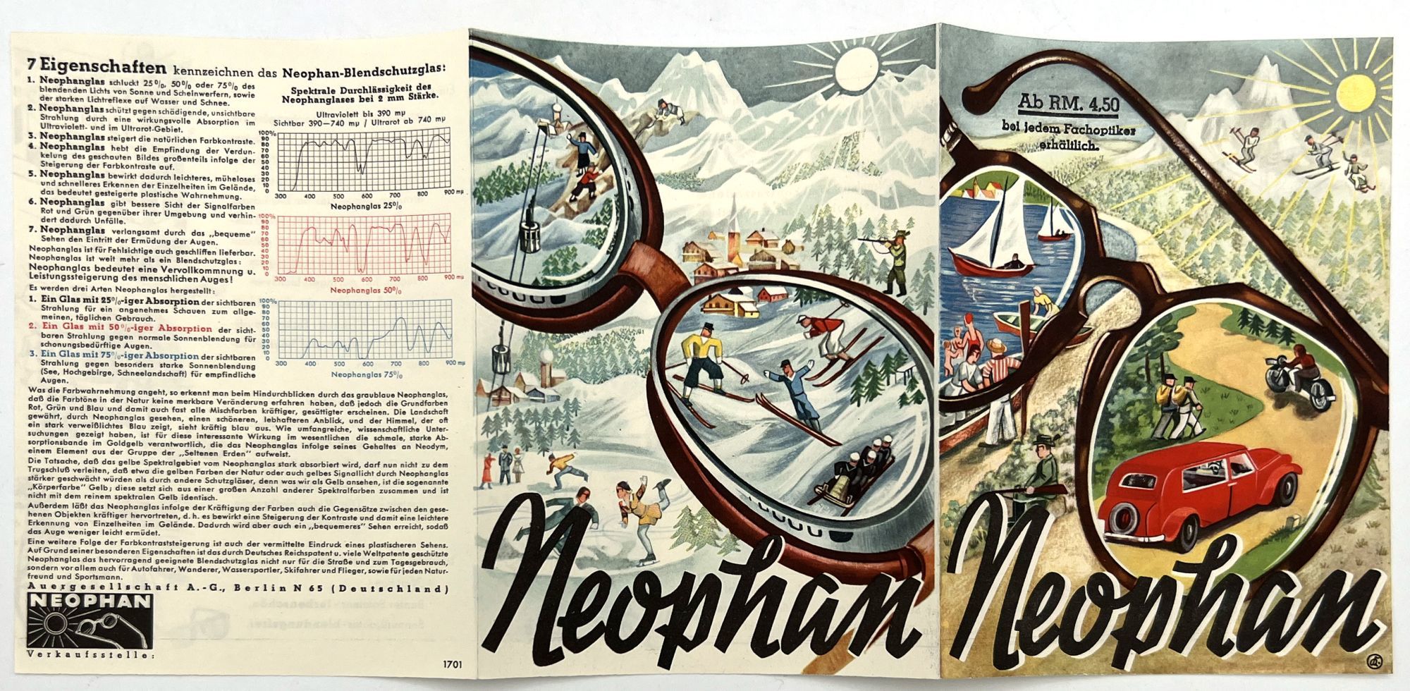 Berlin, Germany: Neophan Verkaufsstelle, 1930. Very good to near-fine.. Illustrated leaflet advertising a German brand of anti-glare glasses, developed for "Schutz vor Sonnen-, Schnee- und Scheinwerferblendung" ("Protection from sun, snow and headlight glare"). Includes illustrations of happy families skiing, hiking, relaxing on the beach, and sailing. The front and back illustrations show how the lenses can work in summer and winter recreation. Lists inside the different people who benefit from the lenses (e.g. drivers, skiers, athletes). Measures approx. 6.5" by 4.75" folded, 6.5" by 14" unfolded.