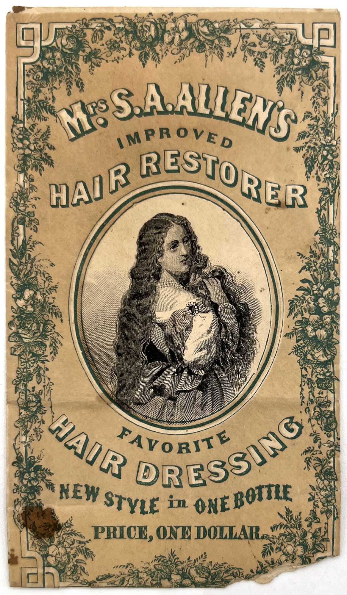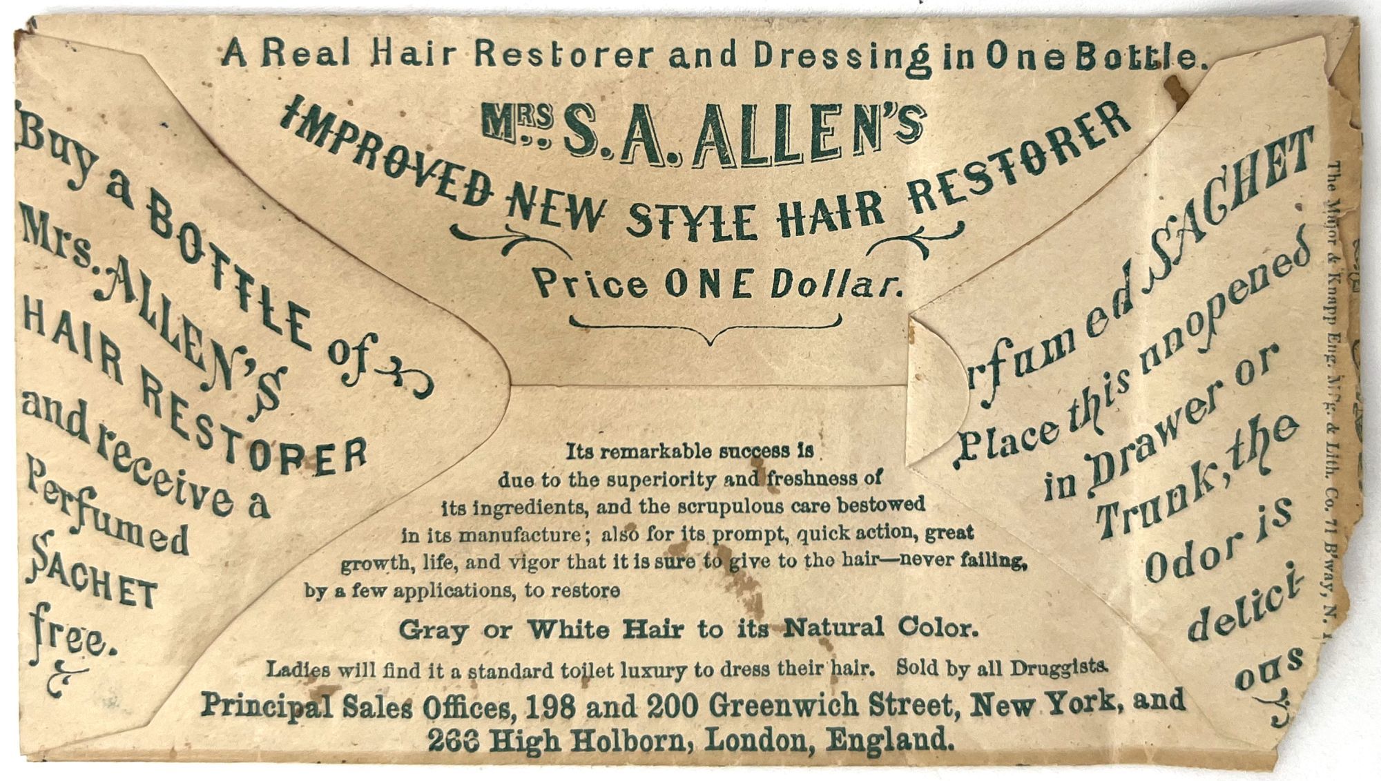 Perfumed Sachet Advertising Mrs. S.A. Allen's Improved New Style Hair Restorer