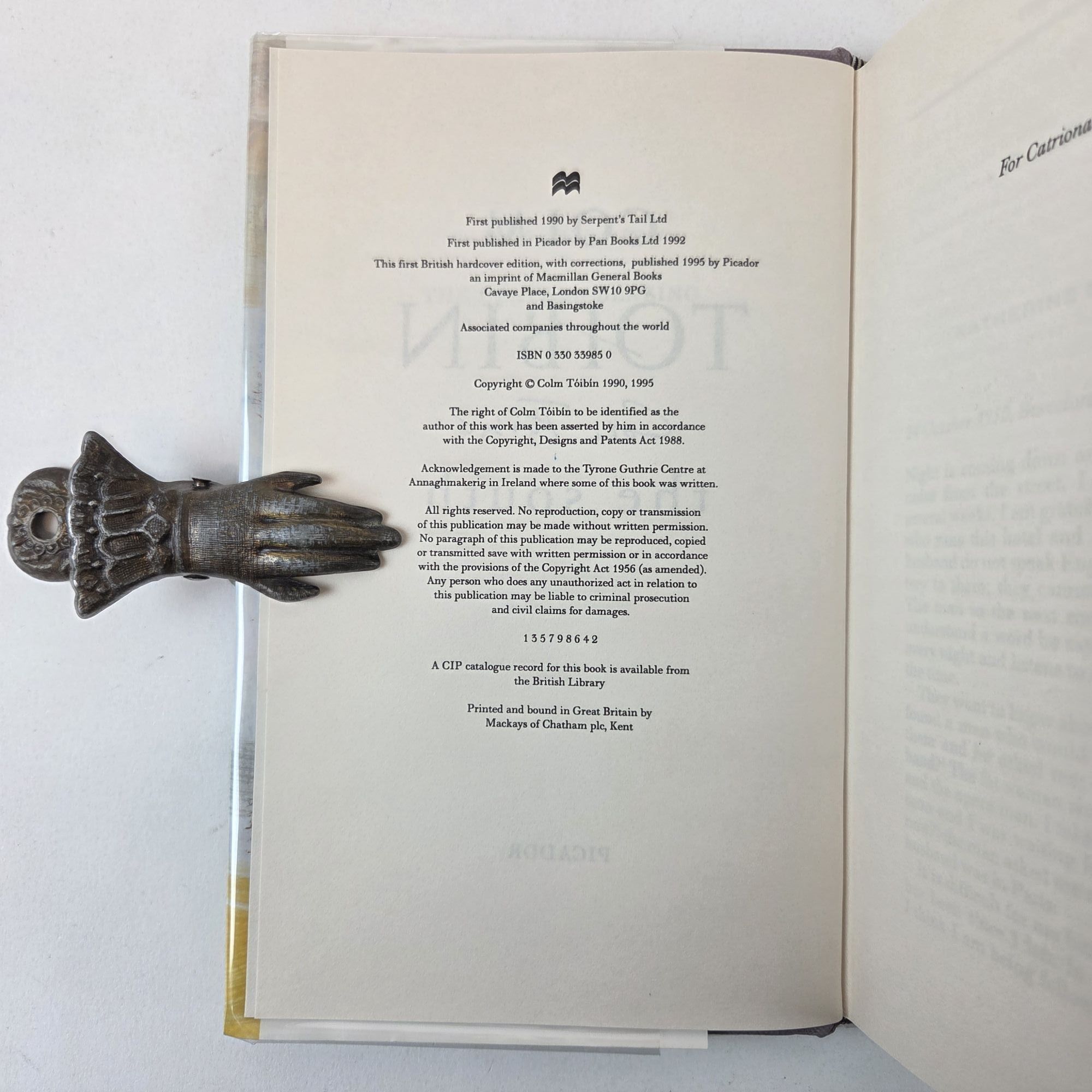 London, UK: Picador, 1995. First Edition thus, First Printing. Hardcover. Octavo, 238 pages. In Very Good minus condition with Very Good condition dust jacket. Spine is white and yellow with dark purple lettering. Dust jacket protected by mylar covering, price uncut: "£14.99" on front flap, has mild creasing along spine head and tail. Boards have mild shelving wear and creasing along spine head and tail, moderate creasing to front joints, mild discoloration along extremities and bumping to fore corners. Textblock has mild age-toning along edges and throughout interior. Signed flat on title page by Colm Tóibín. Shelved Room C overflow. 1405045. Special Collections.