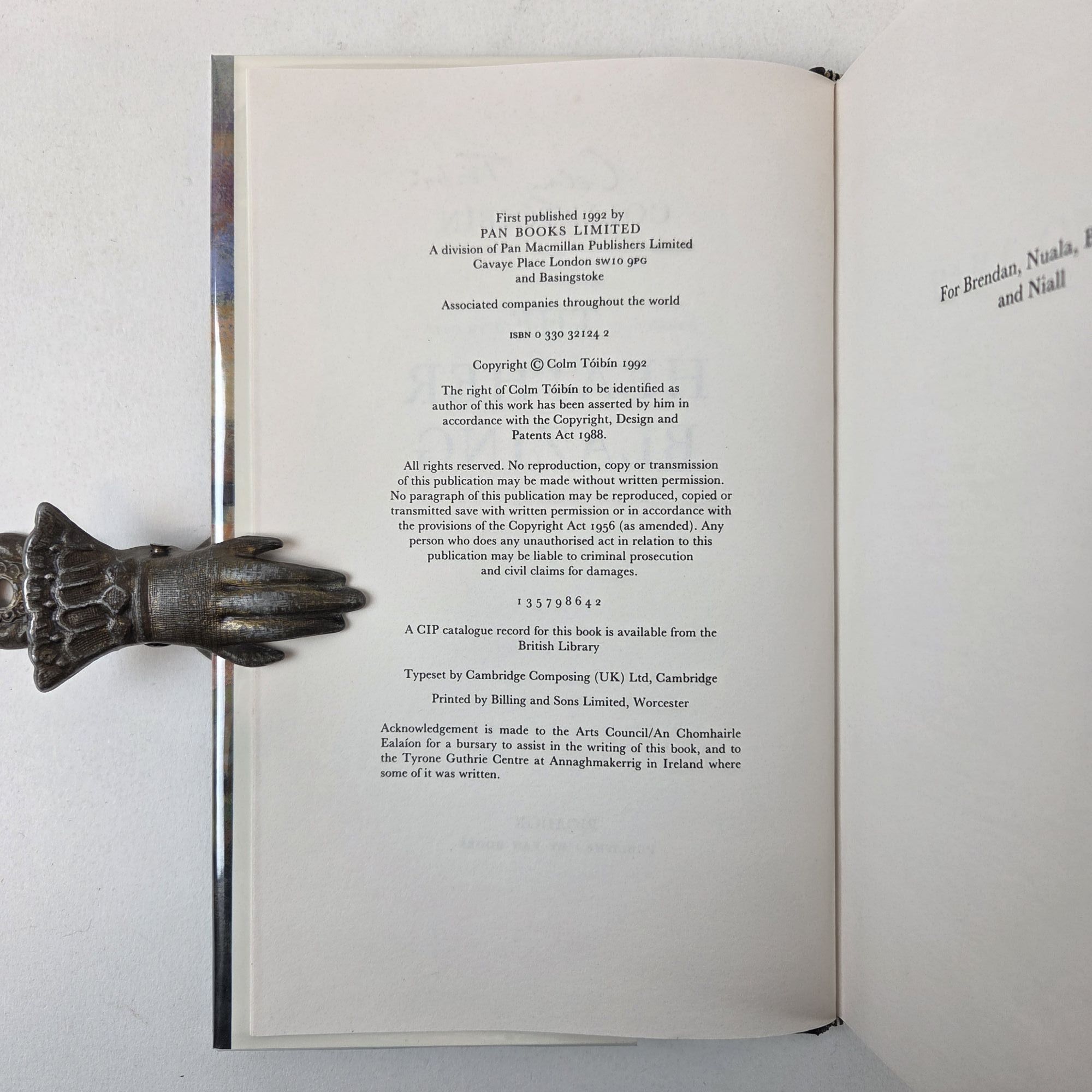 London, UK: Picador, 1992. First Edition, First Printing. Hardcover. Octavo, 245 pages. In Very Good plus condition with a Very Good plus dust jacket. Spine is blue with red and black lettering. Dust jacket protected by mylar covering, price uncut: "£14.99" on front flap. Textblock fore edge has faint black scuff mark. Signed flat on title page by Colm Tóibín. Shelved Room C overflow. 1405050. Special Collections.