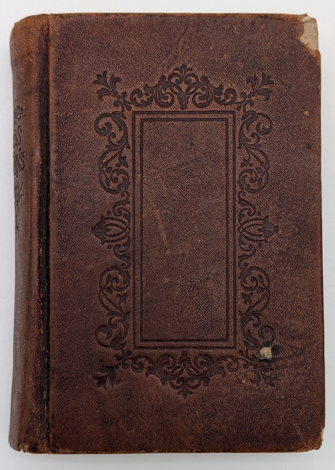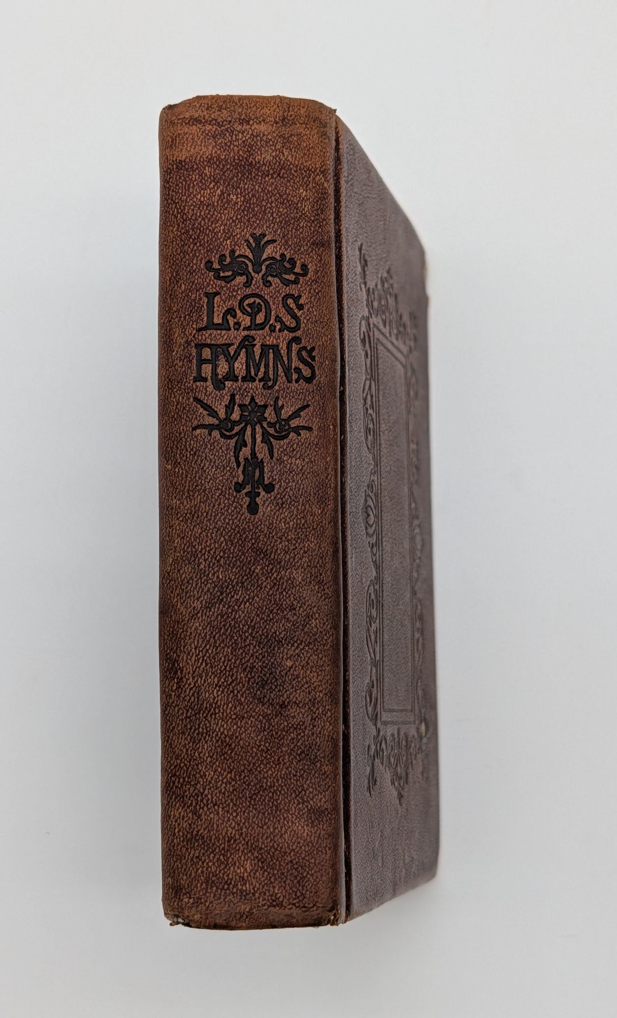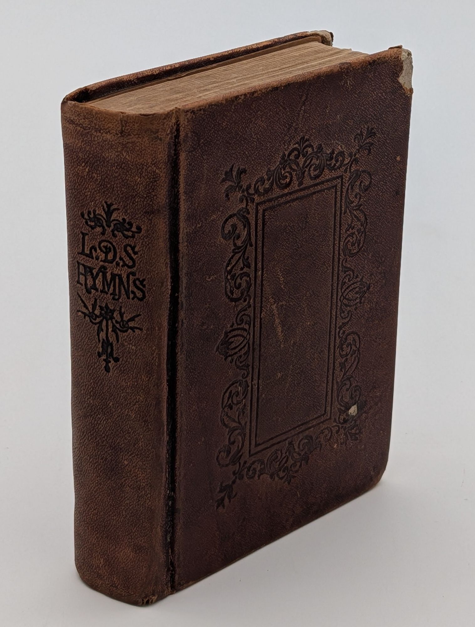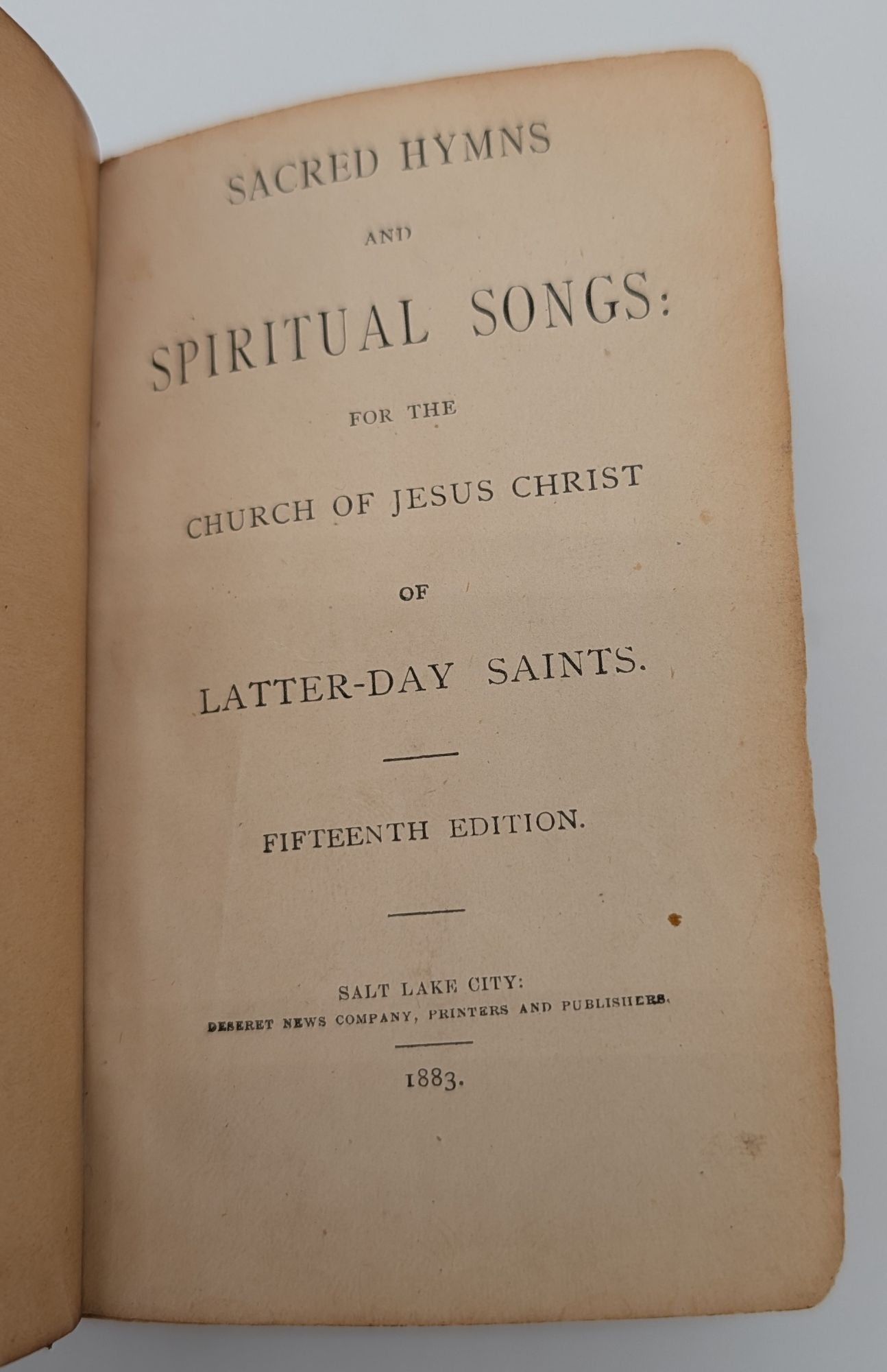 Salt Lake City, UT: Deseret News Company, 1883. Fifteenth Edition. Leather Bound. Good. ***Missing pp. 417/18 and pp. 431/32 of the index. Twenty-fourmo [12.5 cm] Full brown leather with blind stamped ornamental designs and ruled borders on the spine and covers, "L.D.S. Hymns" stamped in blind on the spine. Spine prominently rolled. Underlying boards exposed at the corners. Contemporary owner's name on front free endpaper. Pencil notations on rear flyleaf. Pp. 18-32 are brighter than the other pages. Small loss from the top fore-edge corner of p. 241/42, with no loss from text. Flake 1776. Flake states that this edition is the same as 1871, Salt Lake City, fourteenth edition. The Salt Lake City editions continue numbering with the 1883 edition. "Series continues from the Salt Lake City fourteenth edition." - Flake.
