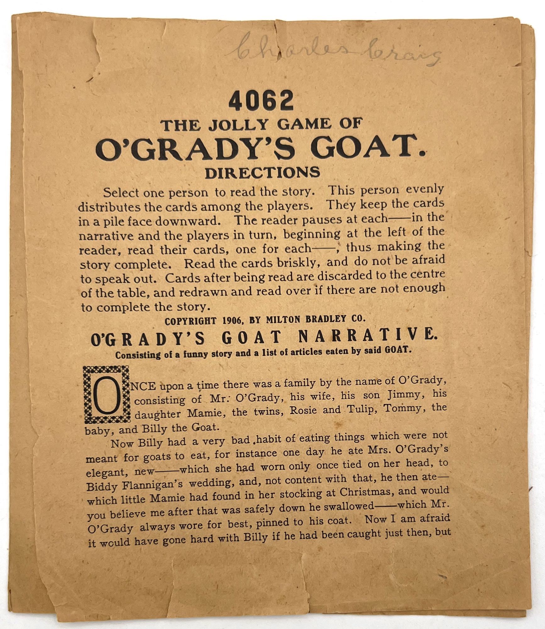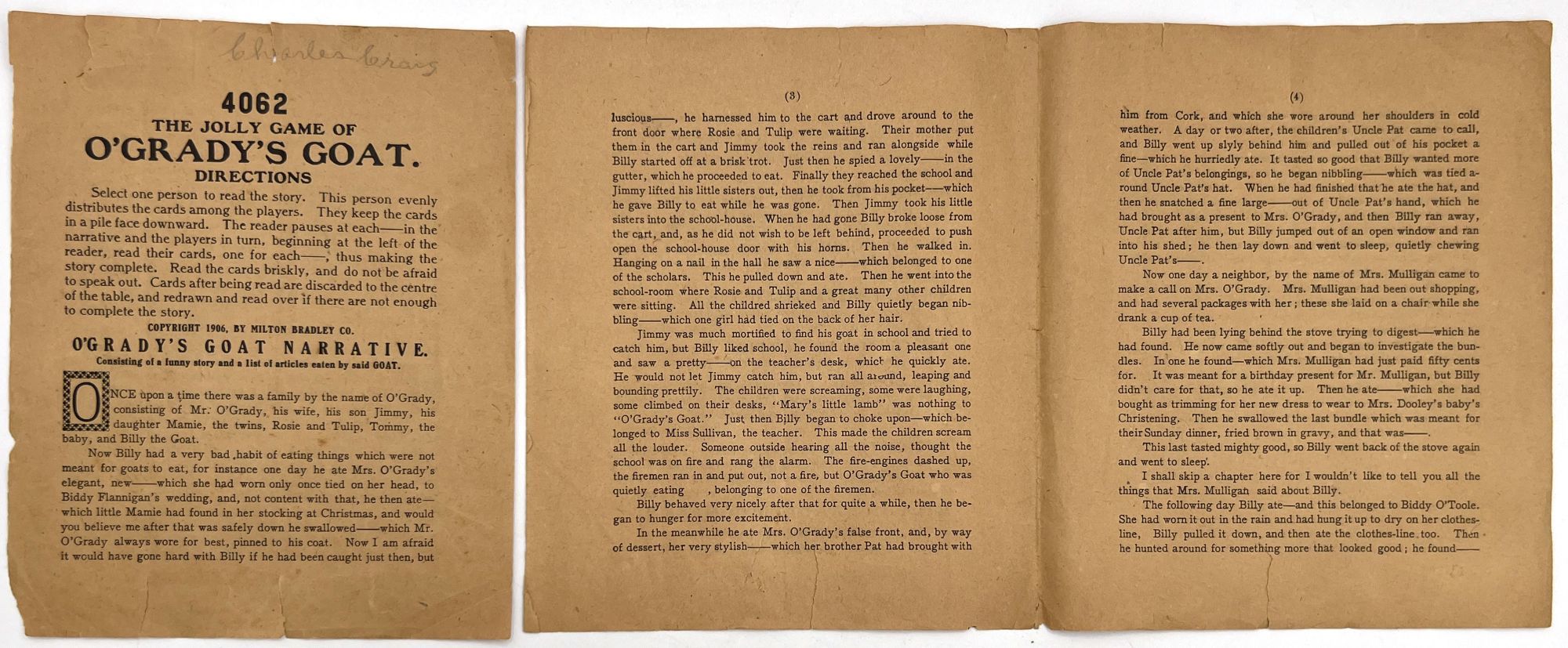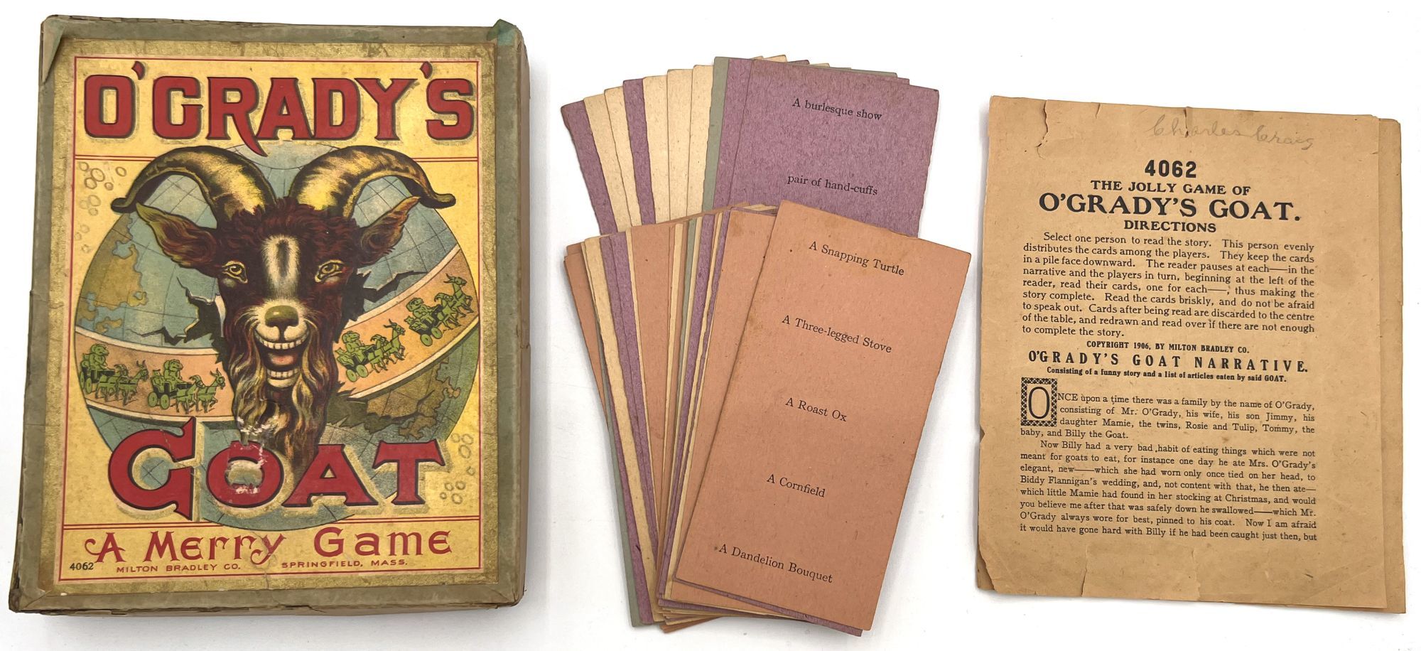 Springfield, Massachusetts: Milton Bradley Co, 1906. Very good. Toning, short tears, rubbing/wear, leaf detached form folding instructions sheet but still present.. A boxed game from Milton Bradley comprised of strips of uncut playing cards and a printed story. To play, one person distributes the cards among the players in piles face down. Then the player begins reading the printed story. For each blank in the story, the next player reads a word off of their card (all appear to be nouns to fit the syntax). One can imagine the endless combinations possible; the nouns include everything from "A Three-legged Stove" to "A fat bull dog" and "A bunion plaster". This set is incomplete. It includes the original folding instructions sheet and approx. forty-two (42) cards, about half of the amount called for (89). Box measures approx. 7.5" by 6.25" by 1" with chromolitho illustration of a smiling goat on the lid. Penciled child's name to instructions sheet.