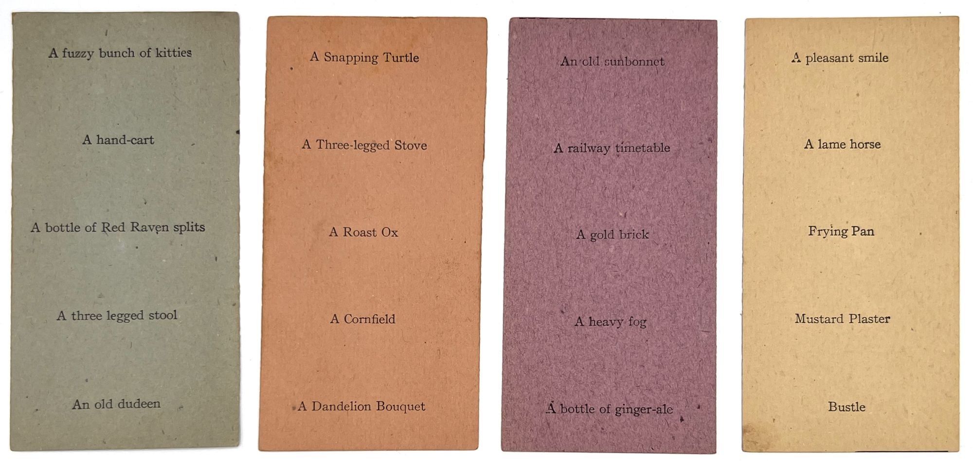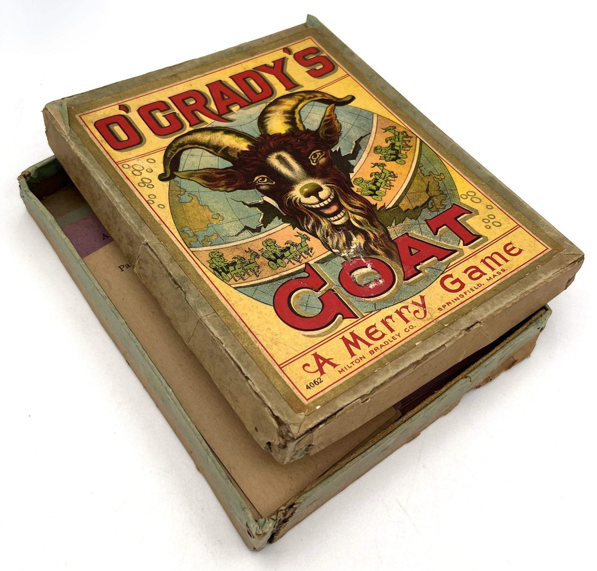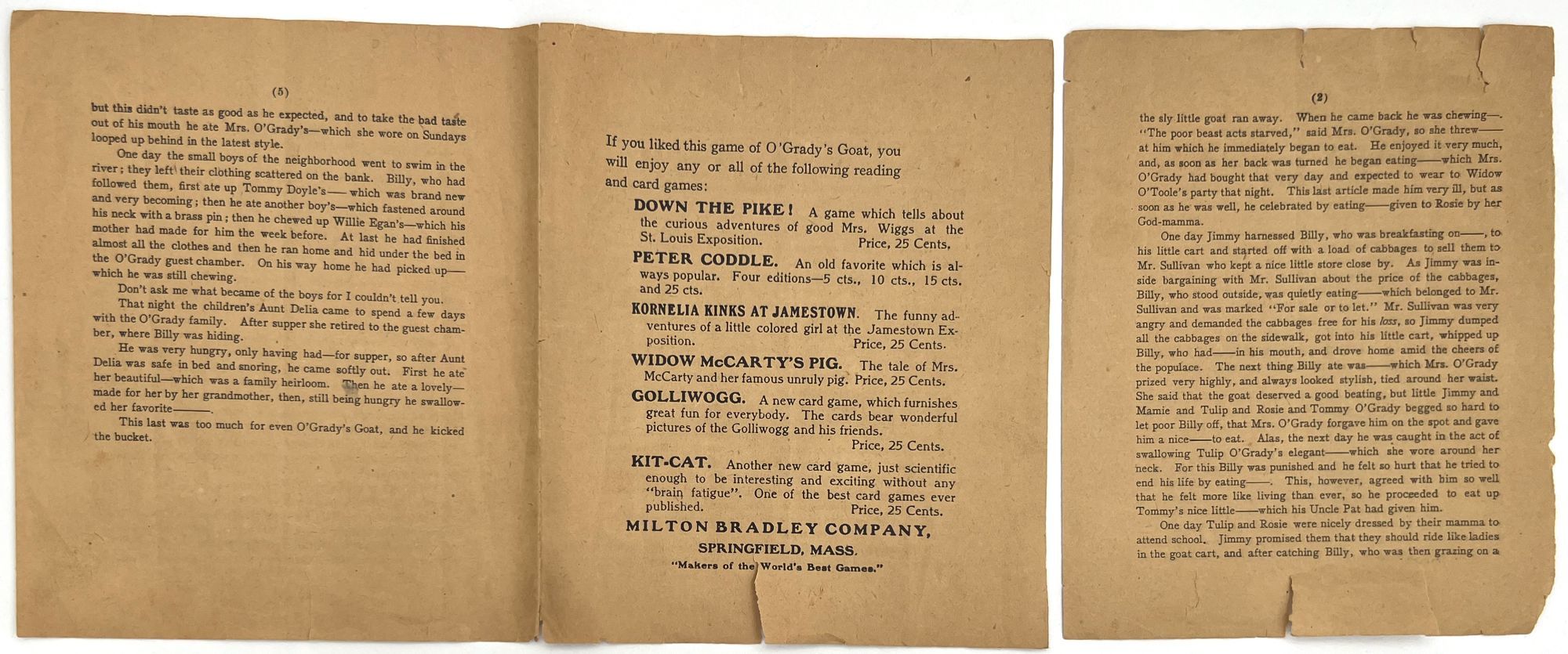 Springfield, Massachusetts: Milton Bradley Co, 1906. Very good. Toning, short tears, rubbing/wear, leaf detached form folding instructions sheet but still present.. A boxed game from Milton Bradley comprised of strips of uncut playing cards and a printed story. To play, one person distributes the cards among the players in piles face down. Then the player begins reading the printed story. For each blank in the story, the next player reads a word off of their card (all appear to be nouns to fit the syntax). One can imagine the endless combinations possible; the nouns include everything from "A Three-legged Stove" to "A fat bull dog" and "A bunion plaster". This set is incomplete. It includes the original folding instructions sheet and approx. forty-two (42) cards, about half of the amount called for (89). Box measures approx. 7.5" by 6.25" by 1" with chromolitho illustration of a smiling goat on the lid. Penciled child's name to instructions sheet.