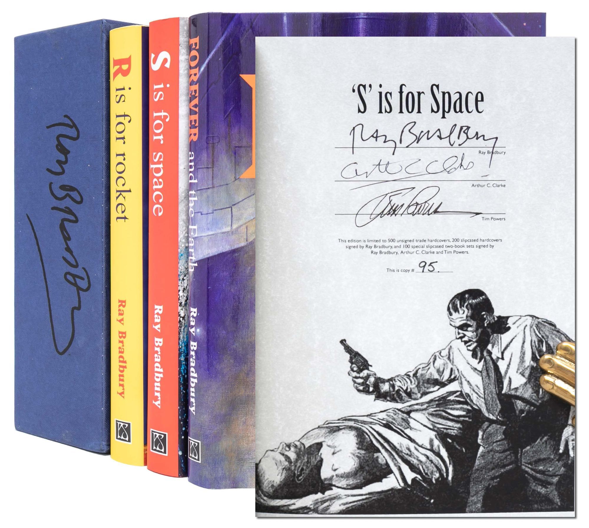 [Hornsea, East Yorkshire]: PS Publishing, 2005. Signed limited editions. Fine/Fine. One of a hundred slipcased sets, with both R Is for Rocket and S Is for Space signed by Ray Bradbury and the editors (Ray Harryhausen and Michael Marshall Smith signed R Is for Rocket; Arthur C. Clarke and Tim Powers signed S Is for Space). Forever and the Earth: Yesterday and Tomorrow Tales is a first edition and unsigned, as issued. A Fine set in like dust jackets, housed in the Fine publisher's slipcase.