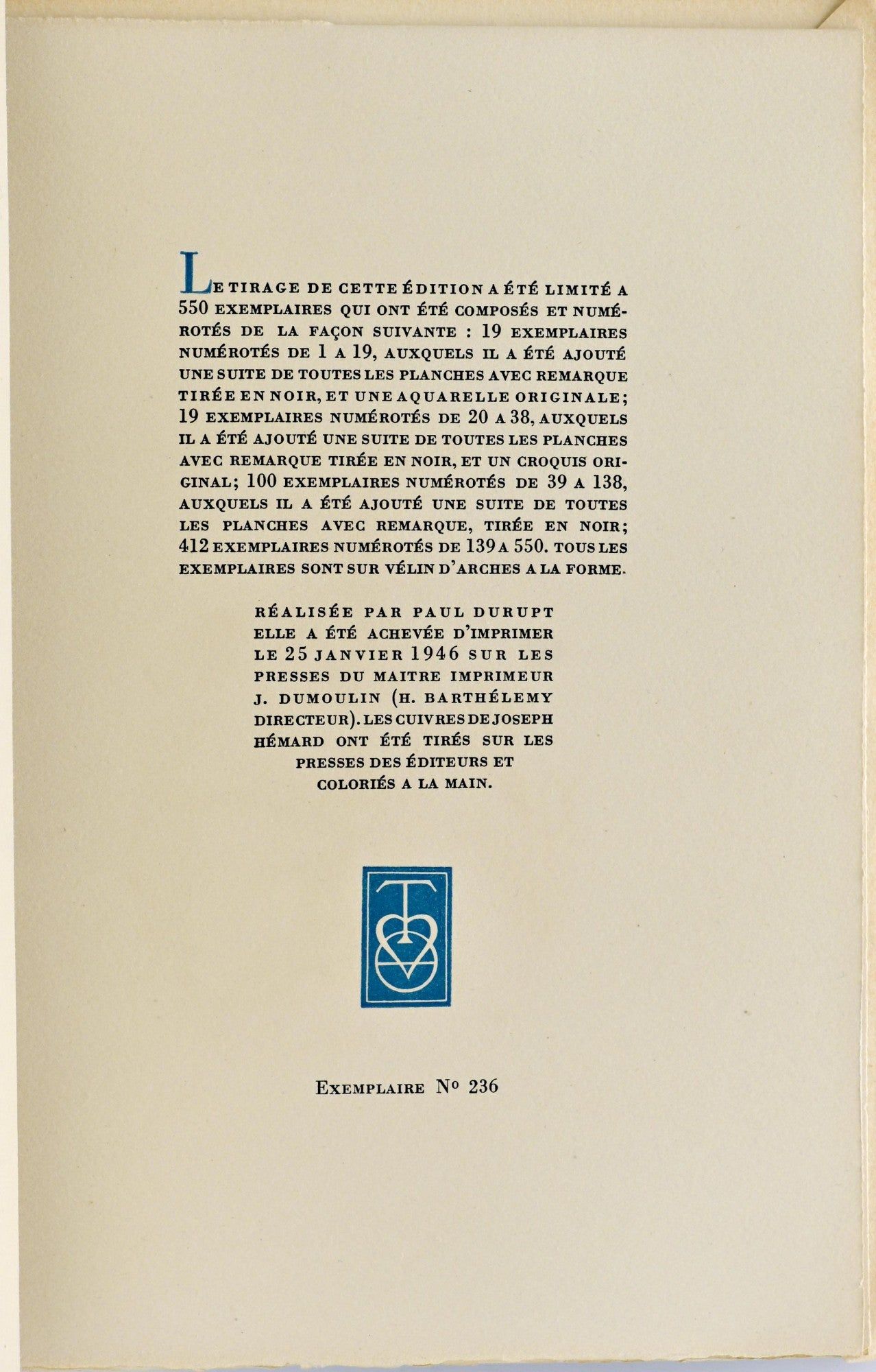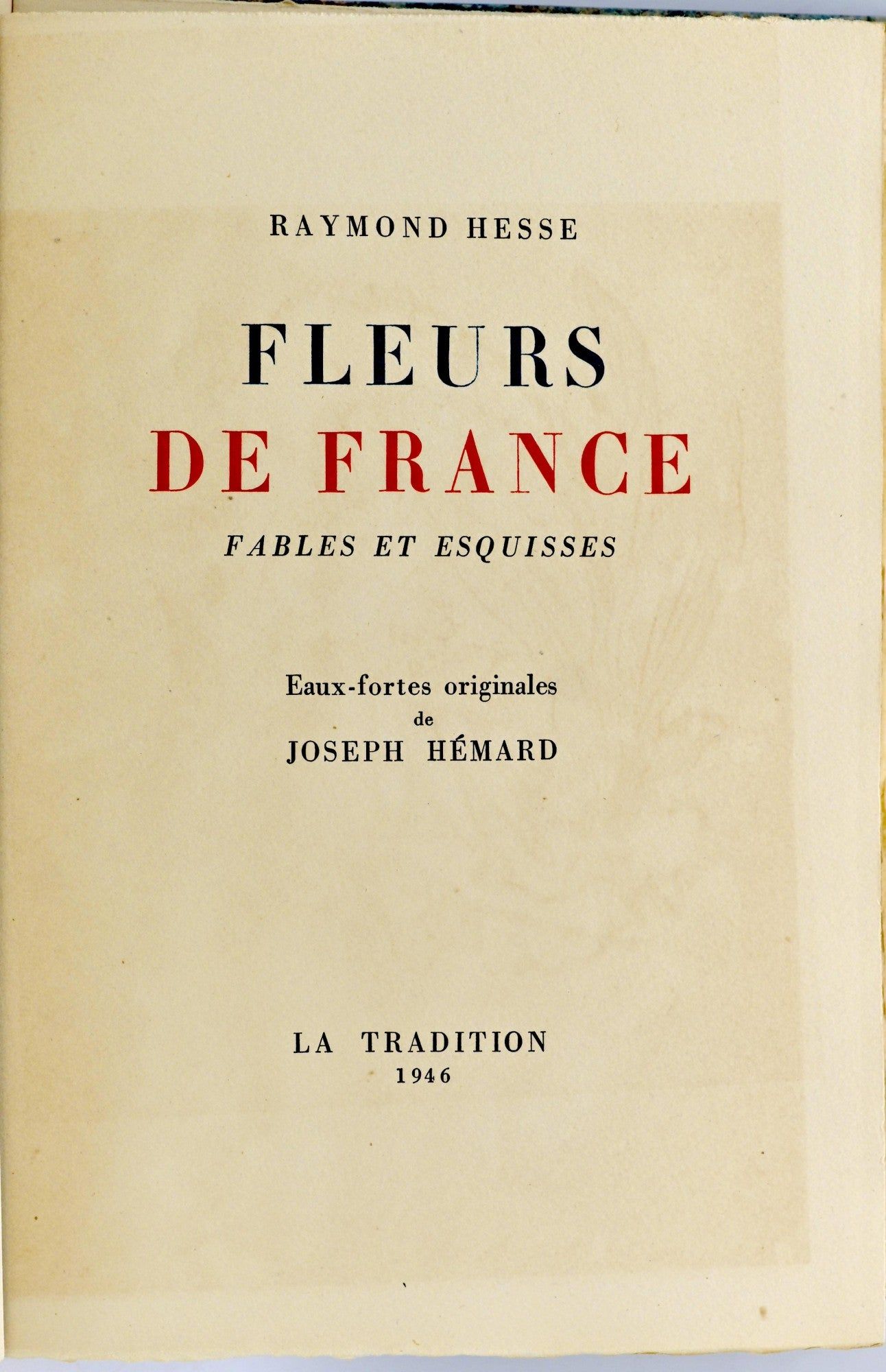 [SPECIAL PRESS] FLEURS DE FRANCE. FABLES ET EQUISSES La Traditions, 1946 By Raymond Hesse | Joseph Hemard [Eaux-fortees] La Traditions, 1946. In an edition of 550 copiie; 16 lovelycolor plates folded in portfolio; this is example #236.