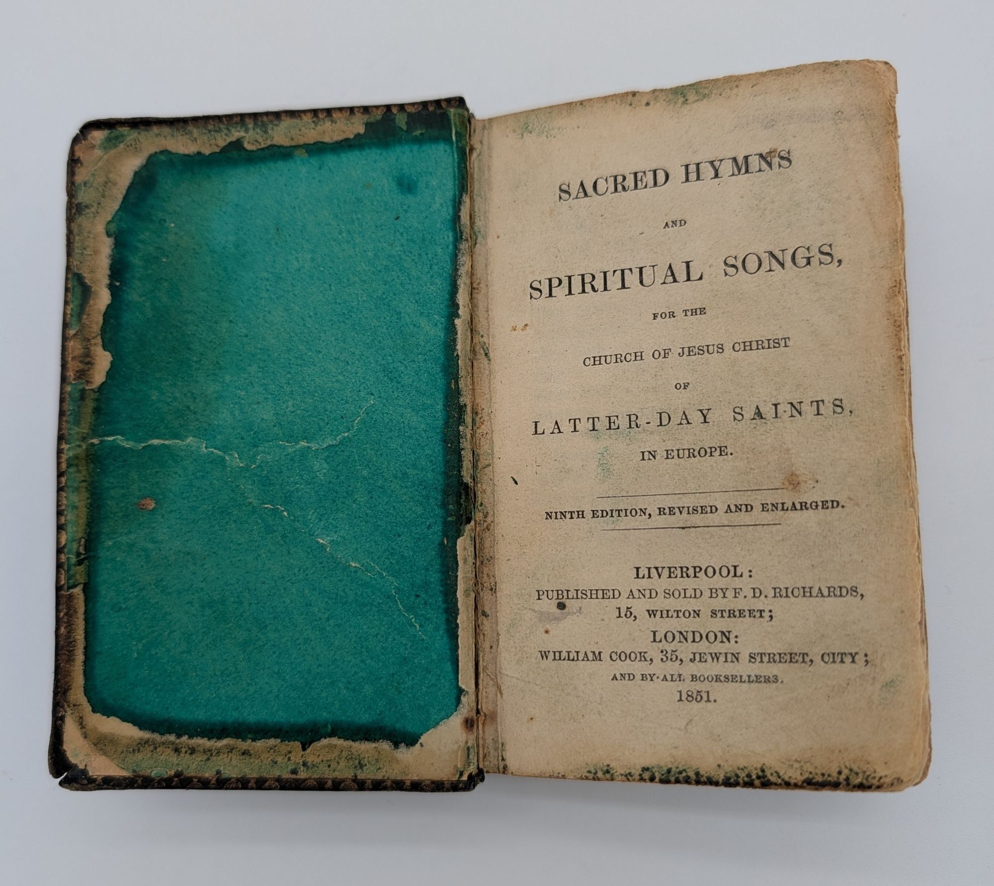 Liverpool and London: F. D. Richards; William Cook, 1851. Ninth edition, revised and enlarged. Leather bound. Good. 379pp. Vigesimoquarto (24mo) [11.5 cm] Full black leather with ruled borders and decorative diamond-patterned blind stamping to the boards and backstrip. Title (L.D.S. Hymns) gilt stamped on the backstrip (partially rubbed away). Gilt turn-ins. With the errata at the rear. Light 3" ripple in leather of front board. 1/4" crack to foot of front joint. Underlying boards exposed at the corners. Front free endpaper missing, however the edges of the once-present free endpaper are adhered to the front pastedown. Rear free endpaper (with pencil notes) adhered to rear pastedown. Thread repairs to text block that run from the head to foot of spine along a handful of the inside margins. Periodic light soiling and minor spots and thin moisture stains to the pages. Top fore-edge corners with sporadic light fold creases. Small loss from bottom fore-edge corner of p. 19/20. Pp. 334/35 just a touch adhered along the inside margins. Flake/Draper 1767. Crawley 604. Chism 55. The second major revision of the European hymnal. Produced during Franklin D. Richards's first term as president of the British Mission.