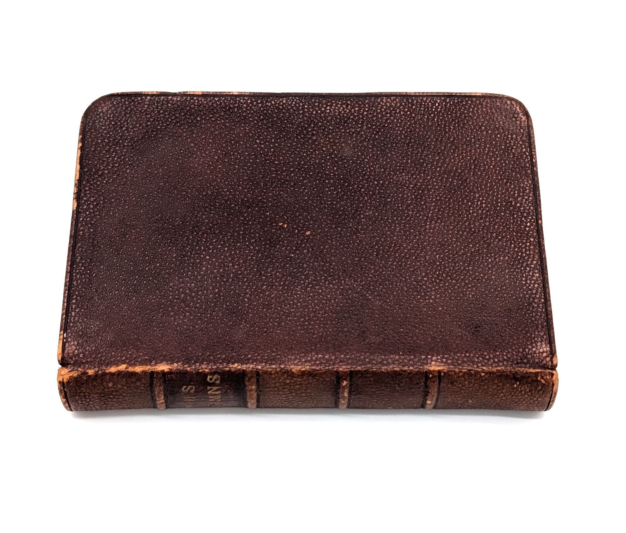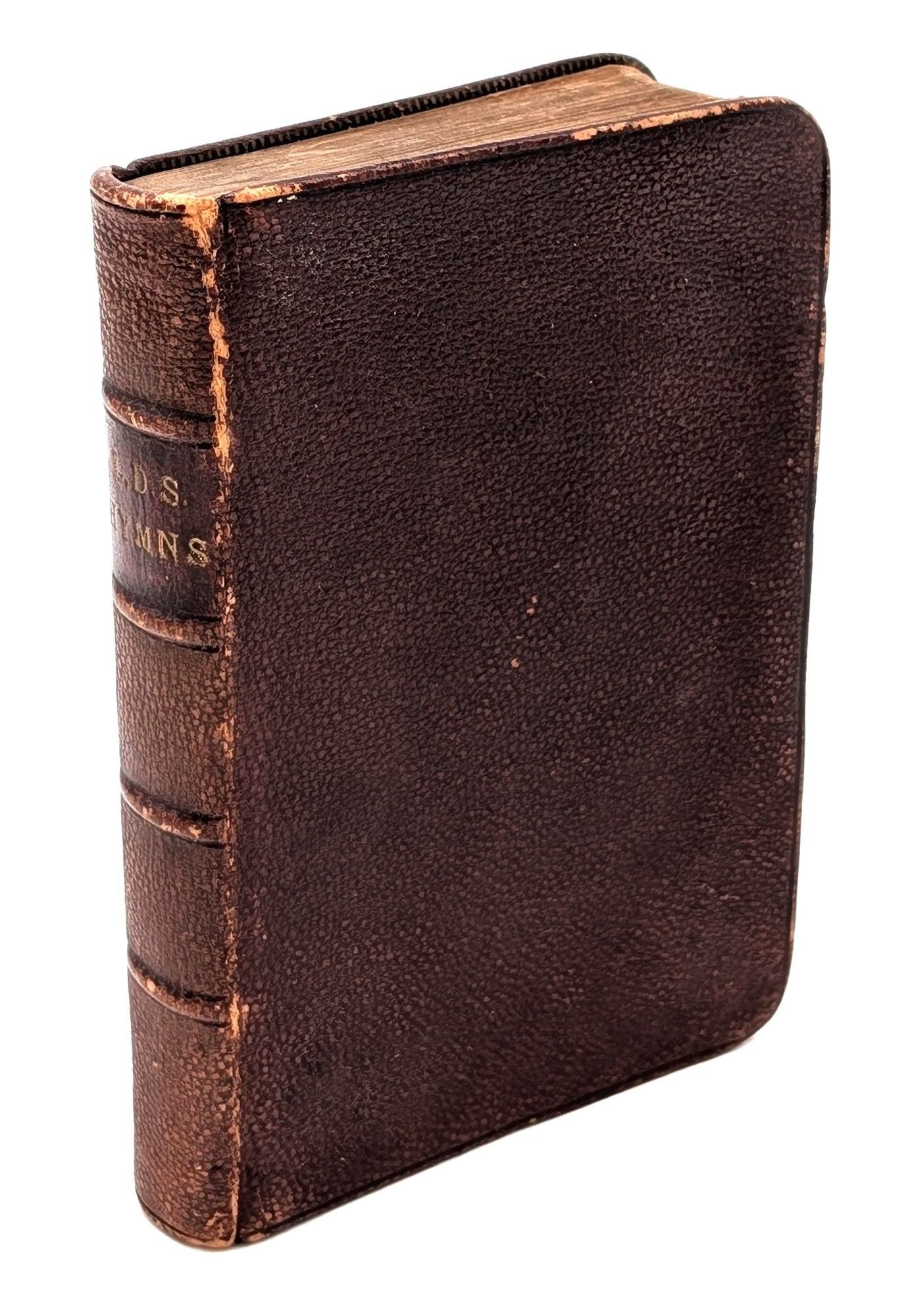 Salt Lake City, UT: The Deseret News Company, Printers and Publishers, 1905. Twenty-fourth edition. Leather bound. Very Good. 480pp. Twenty-fourmo [12 cm] Full brown leather over thin card boards. Raised spine bands. All edges gilt. "L.D.S. Hymns" stamped in gilt on the spine. Black endpapers. Light rubbing to the extremities. Faint ink stamps and pencil notations on preliminary pages. Stitching visible in the inside margins of the preliminary and terminal leaves. Light moisture staining to edges of title page, first twenty pages or so, and pp. 478-480. Title page lightly chipped at the edges. A lovely copy in leather of the 24th edition of the LDS hymnal, first published in 1835 by Emma Smith, wife of LDS Church founder, Joseph Smith. 383 hymns contained in this edition. Flake 1785.