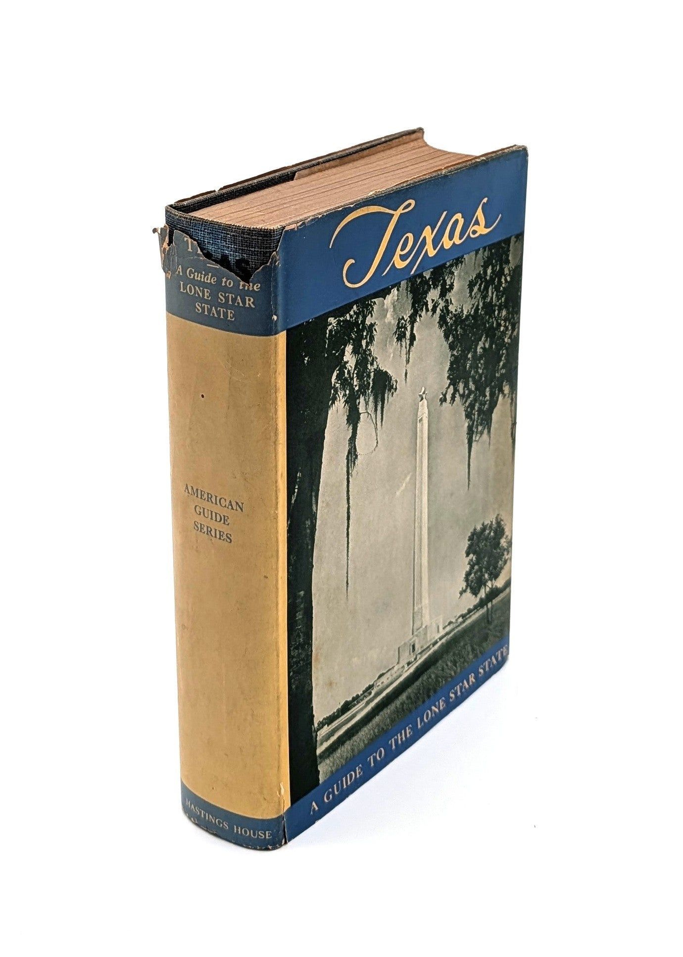New York: Hastings House, 1940. First edition. Hardcover. Very Good/Very Good. 718pp. Octavo [21 cm] Blue thickly woven cloth covered boards with dark blue ink stamped titles on the spine and front cover. White and blue endpapers illustrated with a Historical Pictorial Map of Texas. Numerous illustrated sections. Half-title page tipped in. Spine sunned. Previous owner's name with the date "Sept - 1940" on the half title. In the dust jacket, with a loss from the top edge of the spine, and periodic light rubbing and chipping to the edges. Compiled by Workers of the Writers' Program of the Work Projects Administration in the State of Texas. Sponsored by the Texas State Highway Commission.