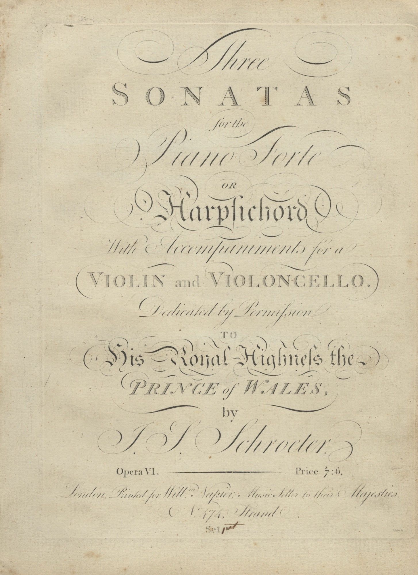 Schroeter, a German pianist and composer, "received his earliest musical instruction from his father, and studied with J.A. Hiller in Leipzig from about 1763. Early chroniclers suggested he studied with C.P.E. Bach, but there is no evidence to support this. ... Through the intervention of J.C. Bach, Schroeter gained the protection and interest of the English court, where he made a great impression. On Bach’s death in 1782 he was promptly named music master to Queen Charlotte. His public career was cut short, however, when he eloped to Scotland with one of his students. Her wealthy family, apparently distraught by the marriage, settled a yearly allowance of £500 on Schroeter with the proviso that he abandon his career as a public performer. Nevertheless, he subsequently held an appointment with the Prince of Wales (later George IV), regularly performing in his semi-private concerts, as well as in occasional benefits or concerts of the nobility. Schroeter’s health, apparently never robust, deteriorated rapidly so that he lost his voice altogether and died of a lung disease while still young. His widow, Rebecca Schroeter, later became a student and admirer of Haydn during his first London visit. Her affectionate letters were carefully kept by the composer, who dedicated to her his piano trios hXV:24–6.