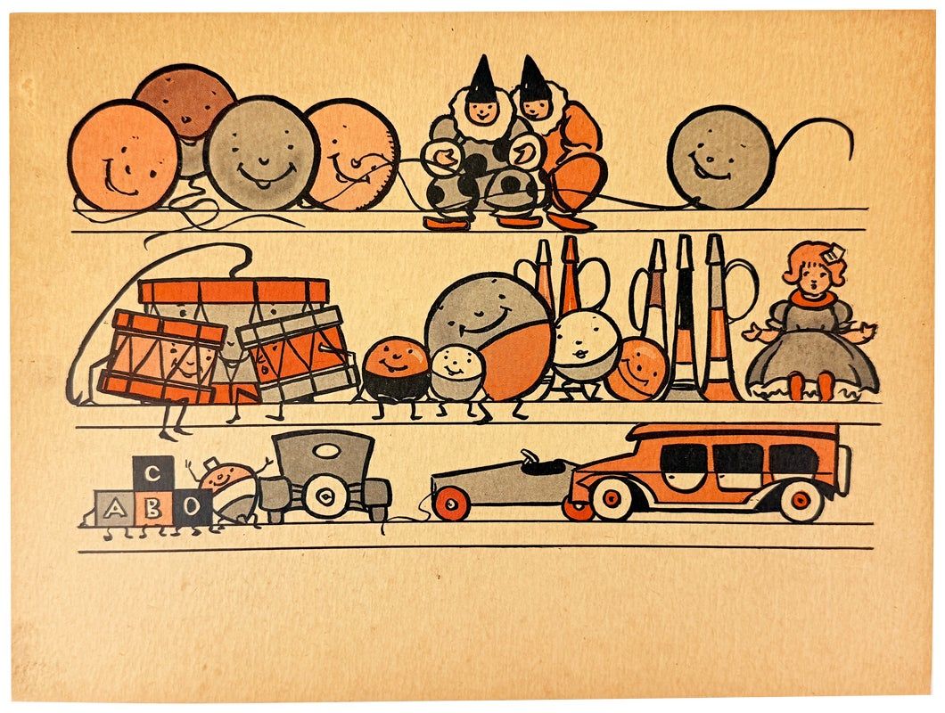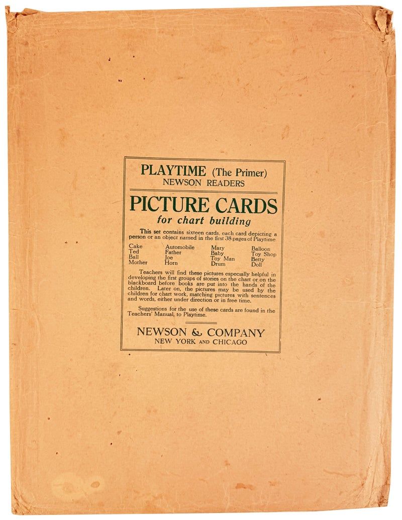 Complete set of teacher's picture cards to accompany the Newson reader "Playtime," the illustrations (a cake, a balloon, a drum, an automobile, etc) all appearing in the book's first 38 pages. Instructions to the teacher are usefully printed on the envelope, "Teachers will find these pictures especially helpful in developing the first groups of stories on the chart or on the blackboard before books are put into the hands of the children. Later on, the pictures may be used by the children for chart work, matching pictures with sentences and words, either under direction or in free time."