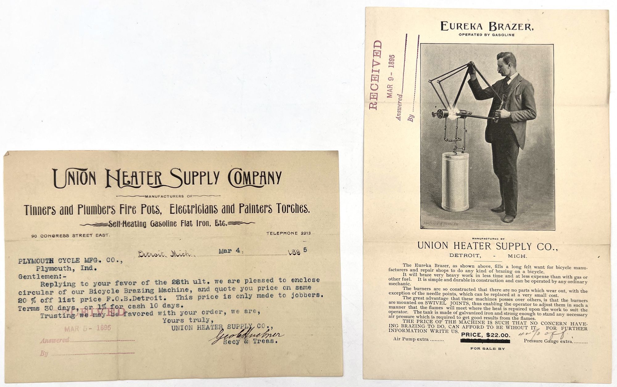 Detroit, Michigan: Union Heater Supply Company, 1895. Very good. Toning, letter folds.. A printed flyer with brief typewritten letter on company letterhead, promoting the Union Heater Supply Company's "Brazing Heater". Described on the flyer as filling a "long felt want for bicycle manufacturers and repair shops to do any kind of brazing on a bicycle". Brazing is a type of soldering. Features a large photograph of a man operating the machine at the head of the flyer. Original price blacked out and replaced with new price, and pencil annotation ("40% off"). Measures approx. 9" by 5.75". Typewritten on letterhead measures approx. 5.5" by 7.75", signed in ink by company's Secretary/Treasurer. Pink ink stamp to both items marking them as "received