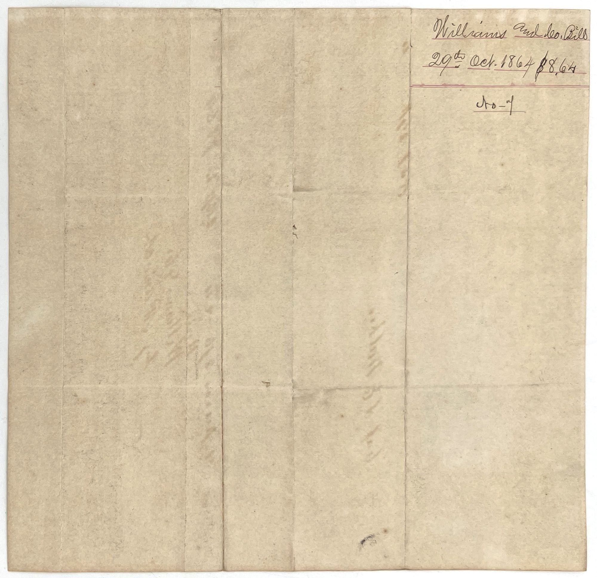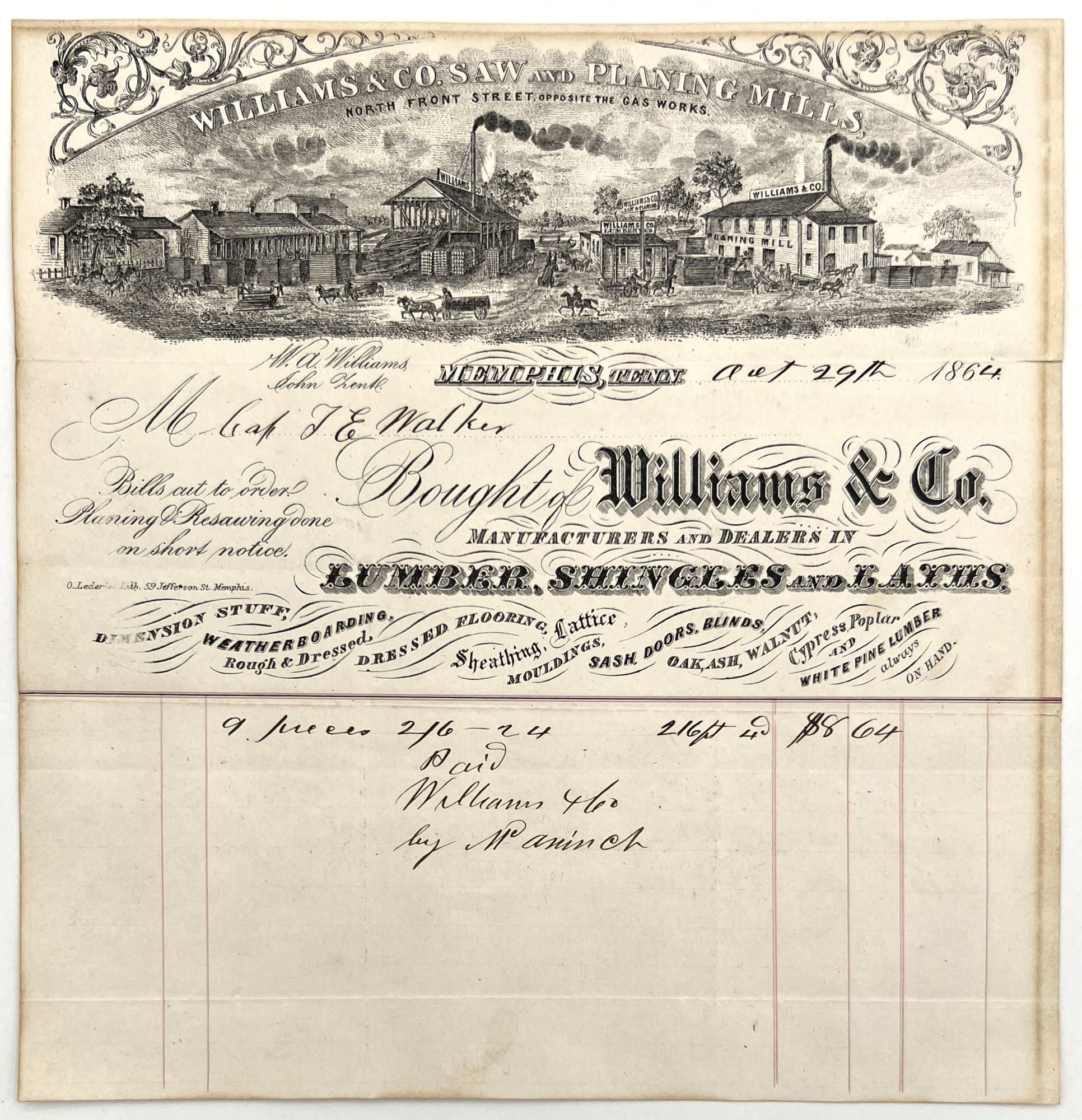 Memphis, Tennessee: Williams & Co, 1864. Very good, some toning/dust soiling around edges.. An attractive illustrated billhead for Williams & Co. Saw and Planing Mills, featuring an elaborate illustration at the head of the companies building bustling with workers and activity. Finished in contemporary ink and dated Oct 29, 1864, recording a sale of "9 pieces", perhaps of lumber, to "Cap. J.E. Walker". Measures approx. 9" by 8.5". Lists products sold by company including lumber, shingles, dressed flooring, moldings, and sashes.