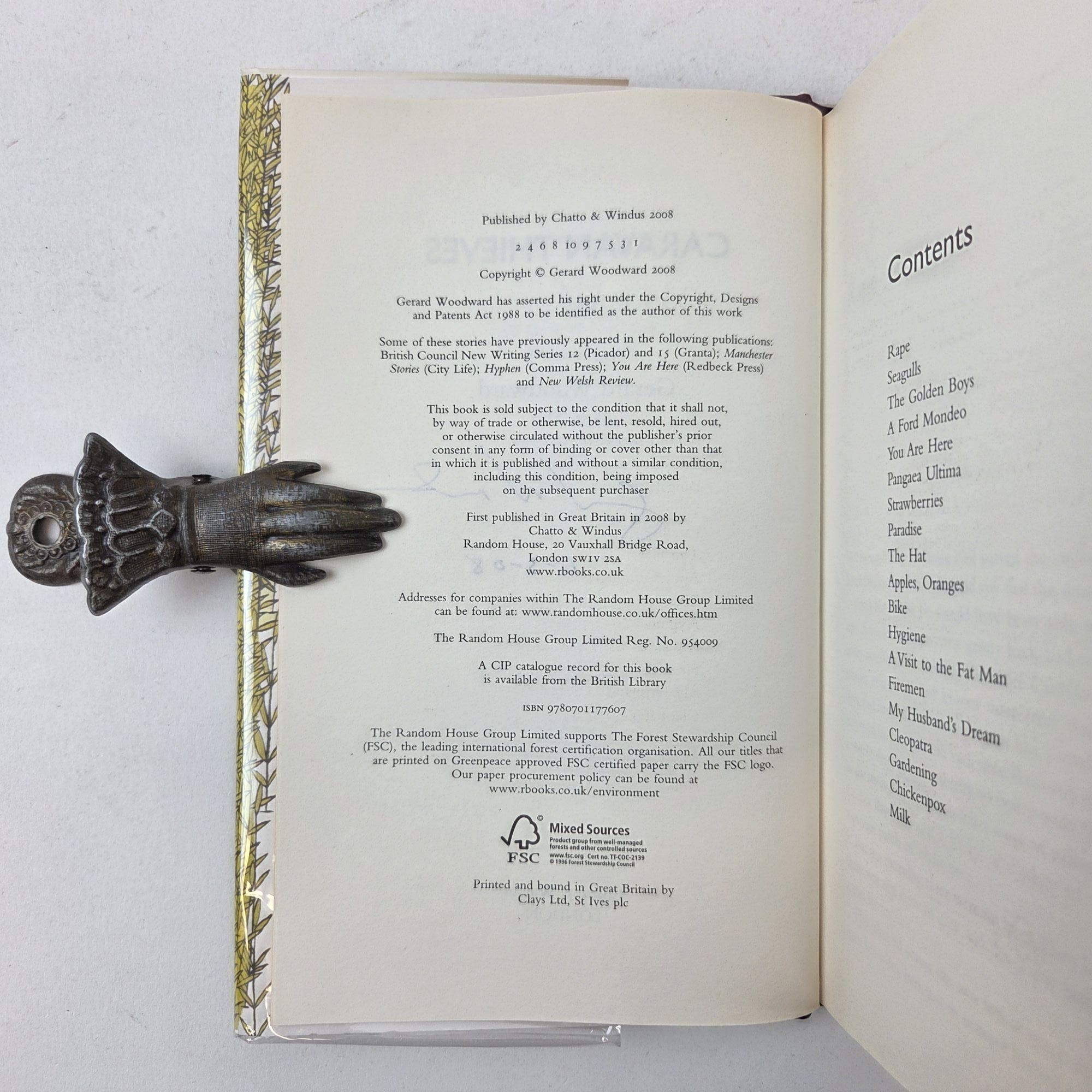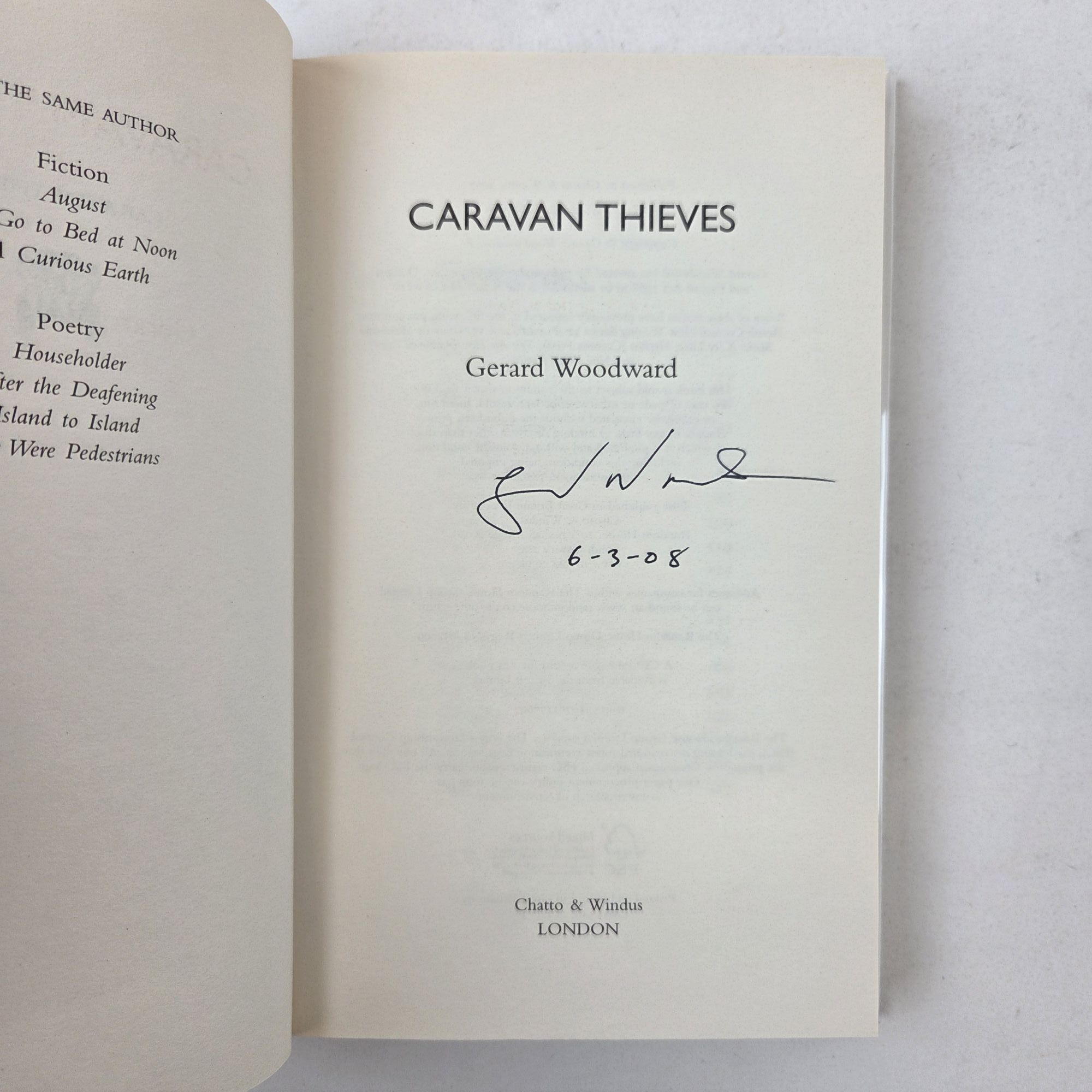 London, UK: Chatto & Windus, 2008. First Edition, First Printing. Hardcover. Octavo, 246 pages. In Very Good condition with Very Good condition dust jacket. Spine is white with dark gray and red lettering. Dust jacket protected by mylar covering, price uncut: "£15.99" on front flap. Signed flat and dated "6-3-08" on title page by Gerard Woodward. Shelved Room C overflow. 1405396. Special Collections.
