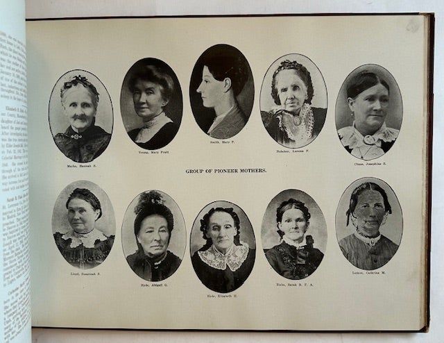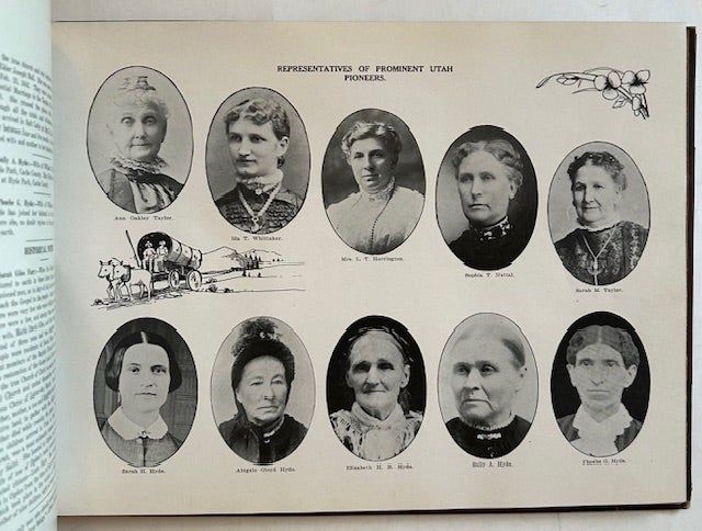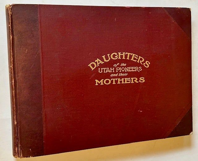 Salt Lake City: The Western Album Publishing Company, 1915. 1/4 leather. Very Good. The very scarce 1915 1st edition. Oblong quarto in its 1/4 burgundy (or wine-red) leather over matching cloth. Bright gilt-titling at the front panel, decorative floral endpapers and pastedowns. Corners of the covers gently rubbed, small losses from ends of leather backstrip; still though, solidly VG, attractive and very presentable. Richly illustrated work on the pioneer women of Utah in the epic Mormon migration, containing close to 450 biographical sketches and portraits. The Western Album Publishing Company was incorporated for the sole purpose of publishing this work, which would be the only book they would produce. The album echoes the style and aesthetic of Frank J. Esshom's "Pioneers and Prominent Men", published 2 years before and seemingly more common than "Daughters of the Utah Pioneers and Their Mothers". (Flake/Draper 4311). (From the 6th paragraph of his Introduction, Jas. T. Jakeman wrote: "Others have sounded the praises of the men of the pioneer bands, let it be ours to tell of the glorious pioneer mothers. Men can brave the wilderness. Their natures are rougher, and their desires less refined. Their lives have been spent in the open, and thus the wastes do not appeal. With women, the desire is for the sheltered place of life, for the firesides, and the thousands of refinements, that make their lives worthwhile. Yet there were women in those bands that crossed the trackless plains, as we have said before, and their voices rose as clear by the campfire, singing the songs of Zion, as they did in those Eastern homes that were now so far away. They put aside the discomforts and the dangers of the joiurney; the desires of their natures were stilled, and buoyed up by love and hope they stood by the men of their families, as fearless, and as devoted as they.
