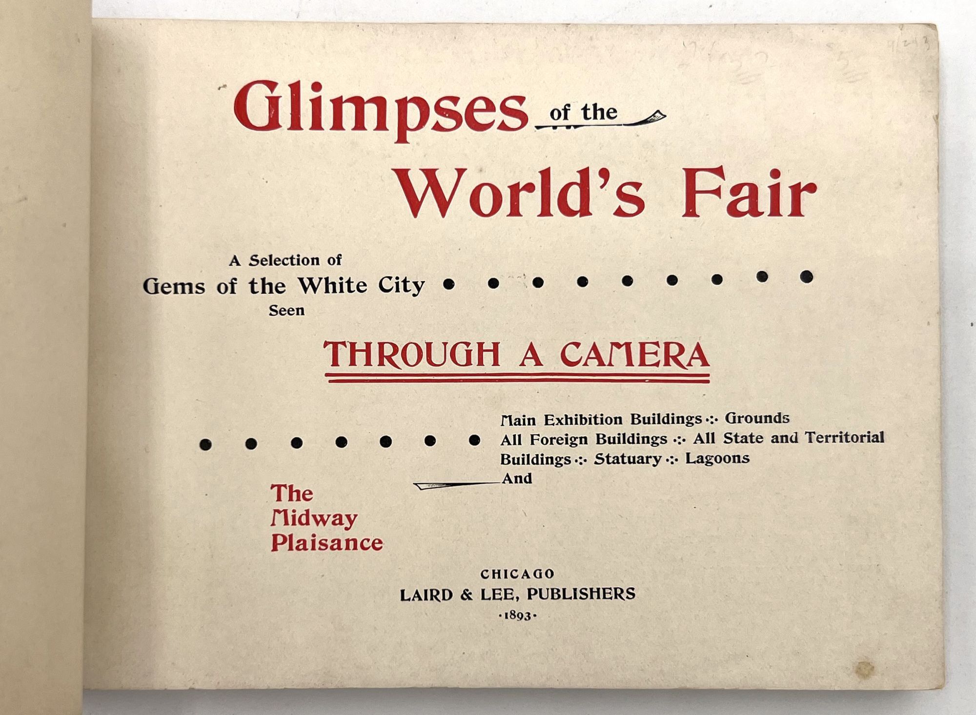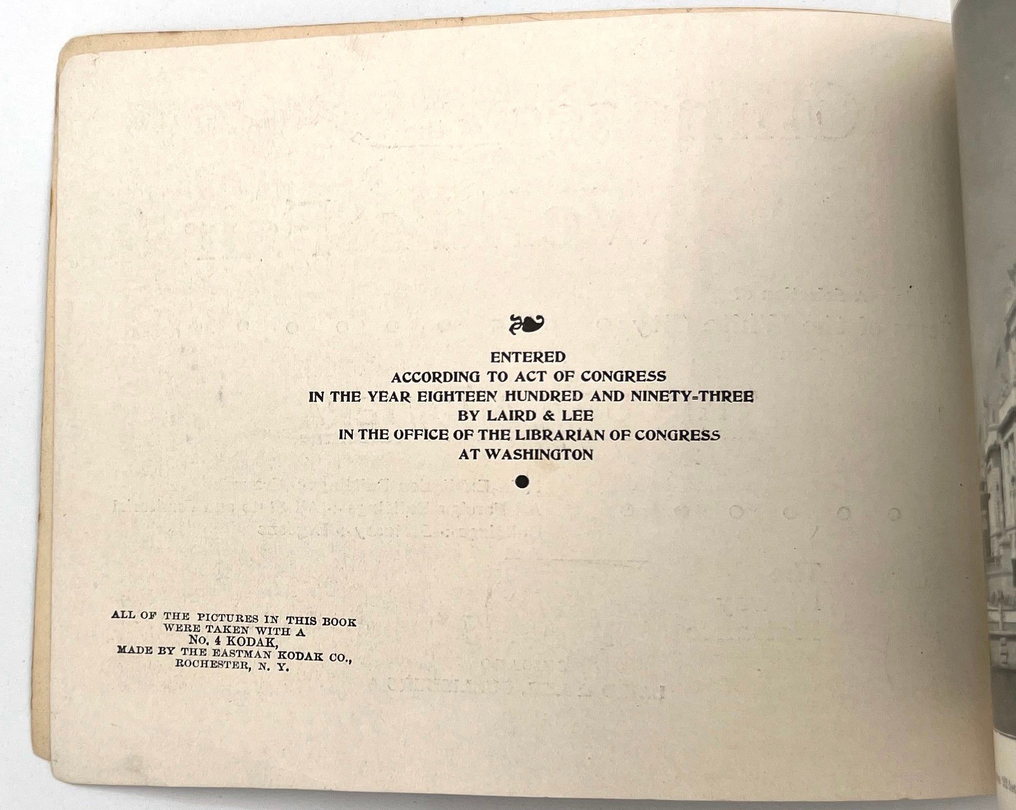 Chicago, Illinois: Laird & Lee, Publishers, 1893. Very good. Dust soiling and spotting with a couple small chips to extremities.. Seventh edition of a charming book of photos commemorating the 1893 Columbian Exposition. Published by Laird & Lee of Chicago, it features reproductions of original photographs "taken with a No. 4 Kodak". Includes over 175 photos of the Exposition's main exhibition buildings, foreign buildings, state and territorial buildings, the grounds, statuary, lagoons, and the grand Midway Plaisance. Provides a wide-ranging, completist photo portrait of the Exposition that shares the palpable excitement from the crowds. Single vol. (5" by 6.75"), approx. 190 pp., each with full-page photo reproduction with caption/subtitle.