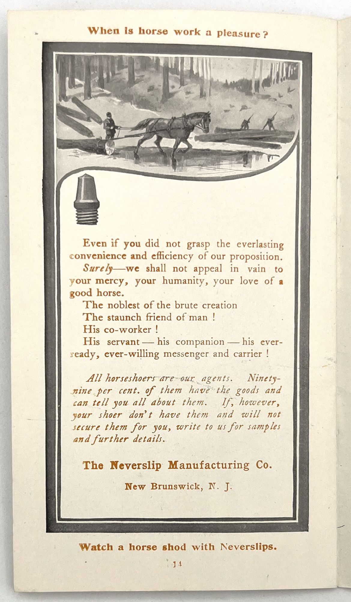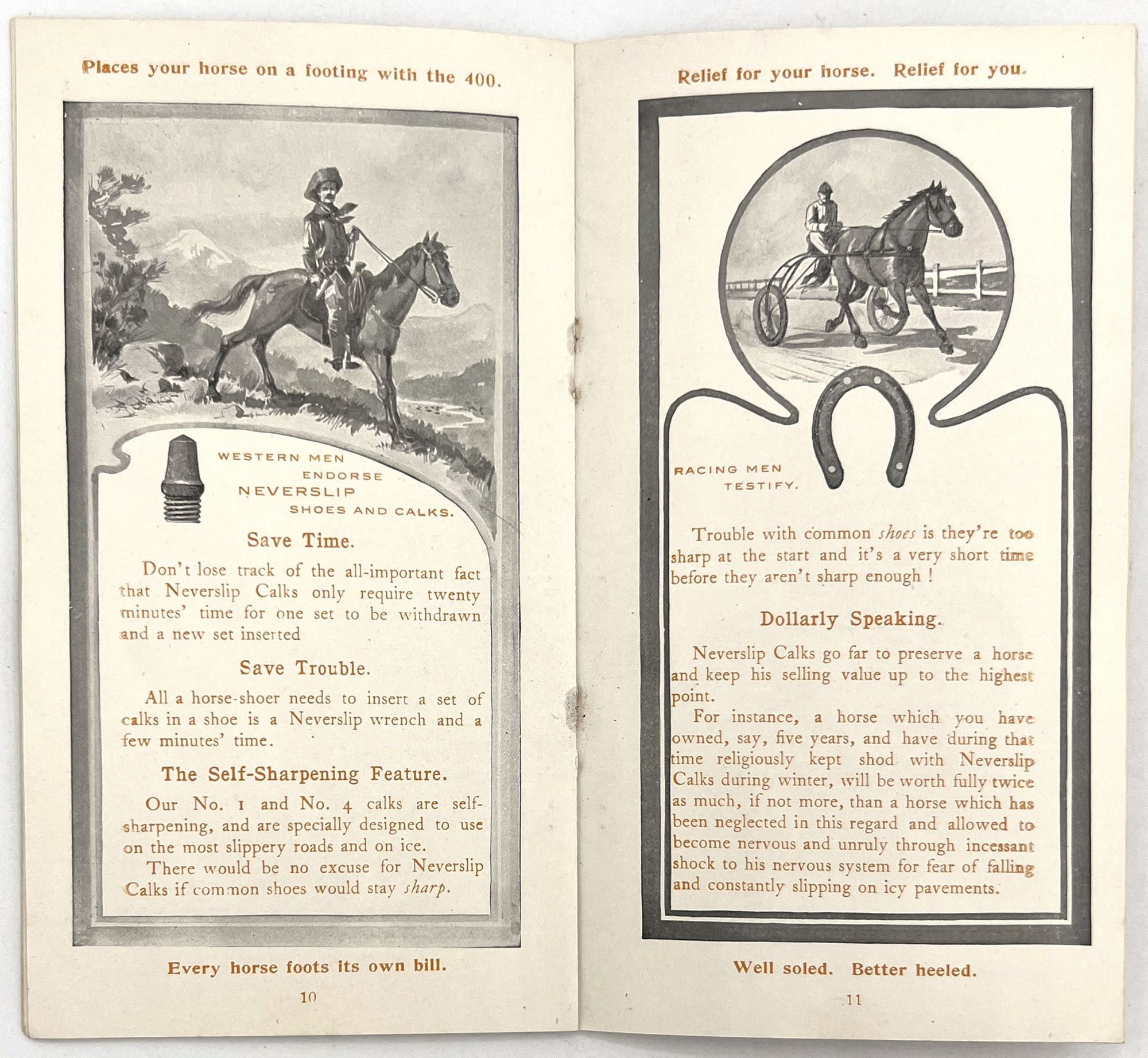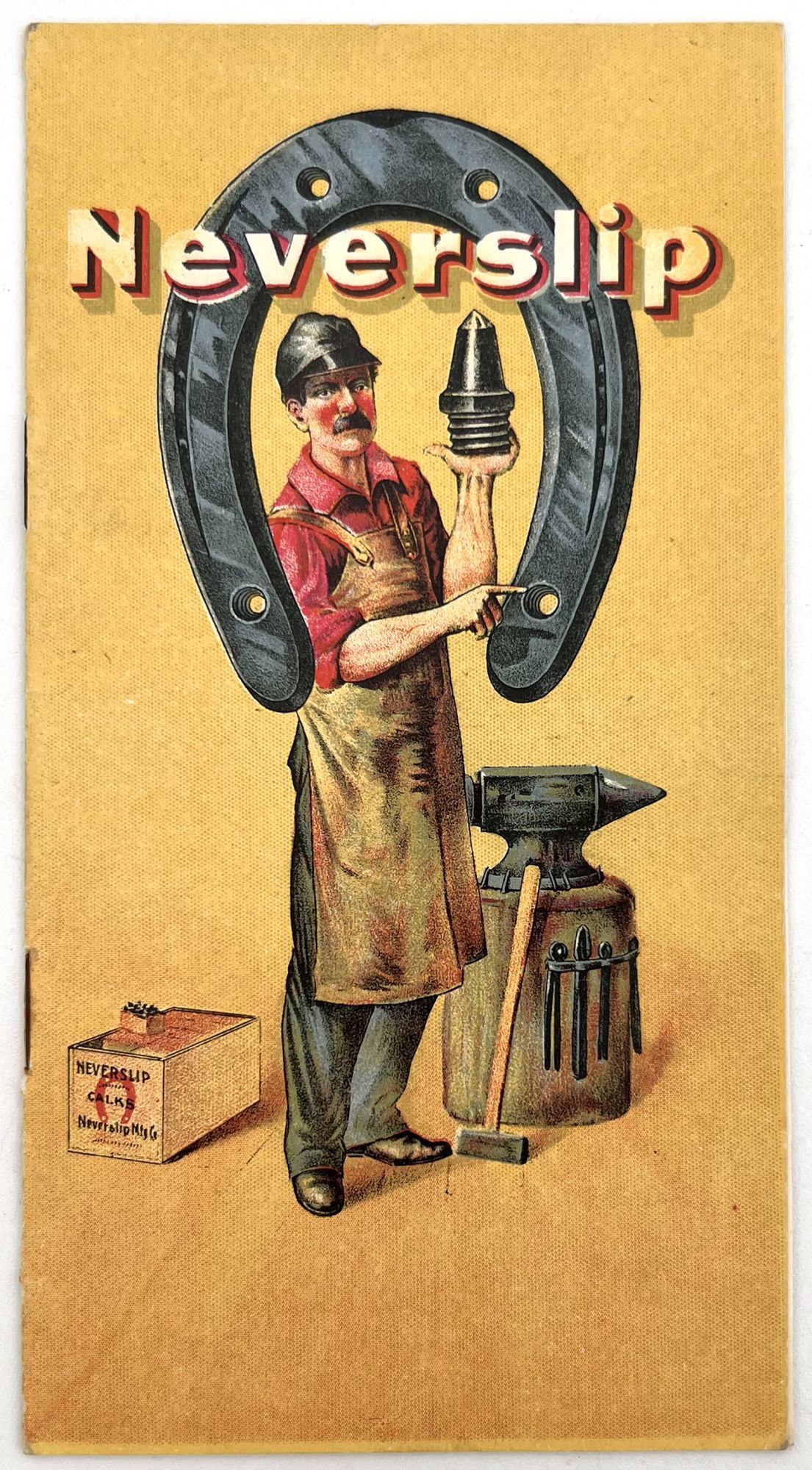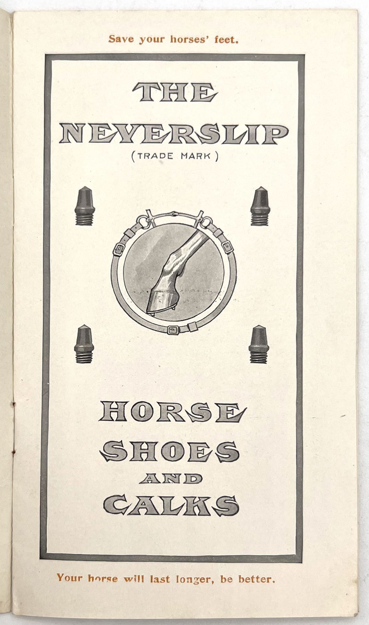 New Brunswick, New Jersey: The Neverslip Manufacturing Company, 1904. Very good. Wear to envelope. Letter folds to circular. Remnants of envelope seal to lower wrapper of booklet.. A booklet, printed circular letter, and original illustrated envelope advertising "Neverslip" brand calks and shoes to farriers in 1904. Provides interesting insight into an industry essential to equine care. The booklet features illustrations of horses at work, including pulling loads and carriages, racing, and even crossing a frozen lake. Includes a chart with shoe sizes and uses in the back. Single vol. (6.5" by 3.5"), pp. 16, illus., in original illus. wrps with image of farrier on front with large horse shoe. Printed circular sales pitch letter measures approx. 10.75" by 8.5"; envelope measures approx. 3.75" by 6.75" and features an illustration of horses surrounded by a decorative horse shoe.