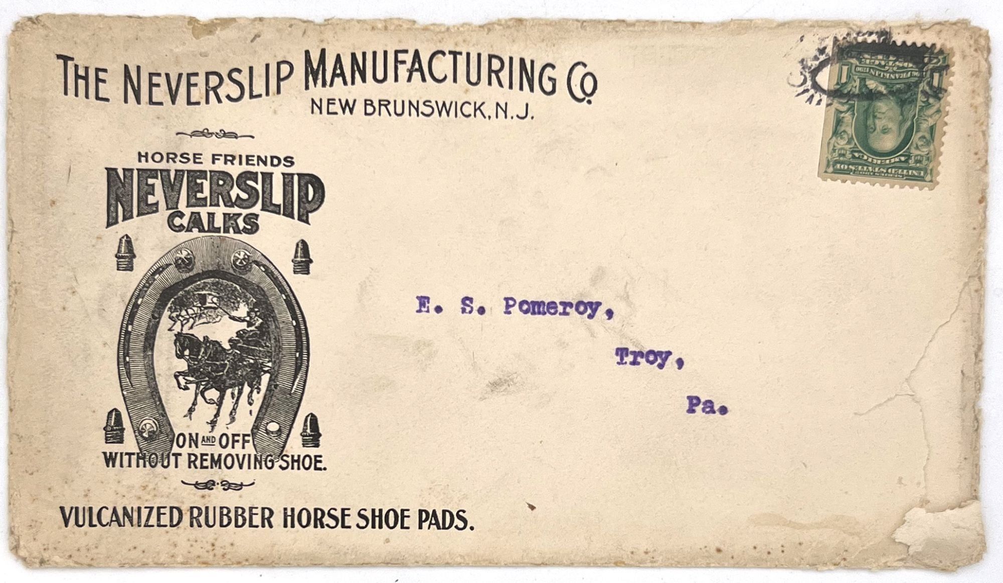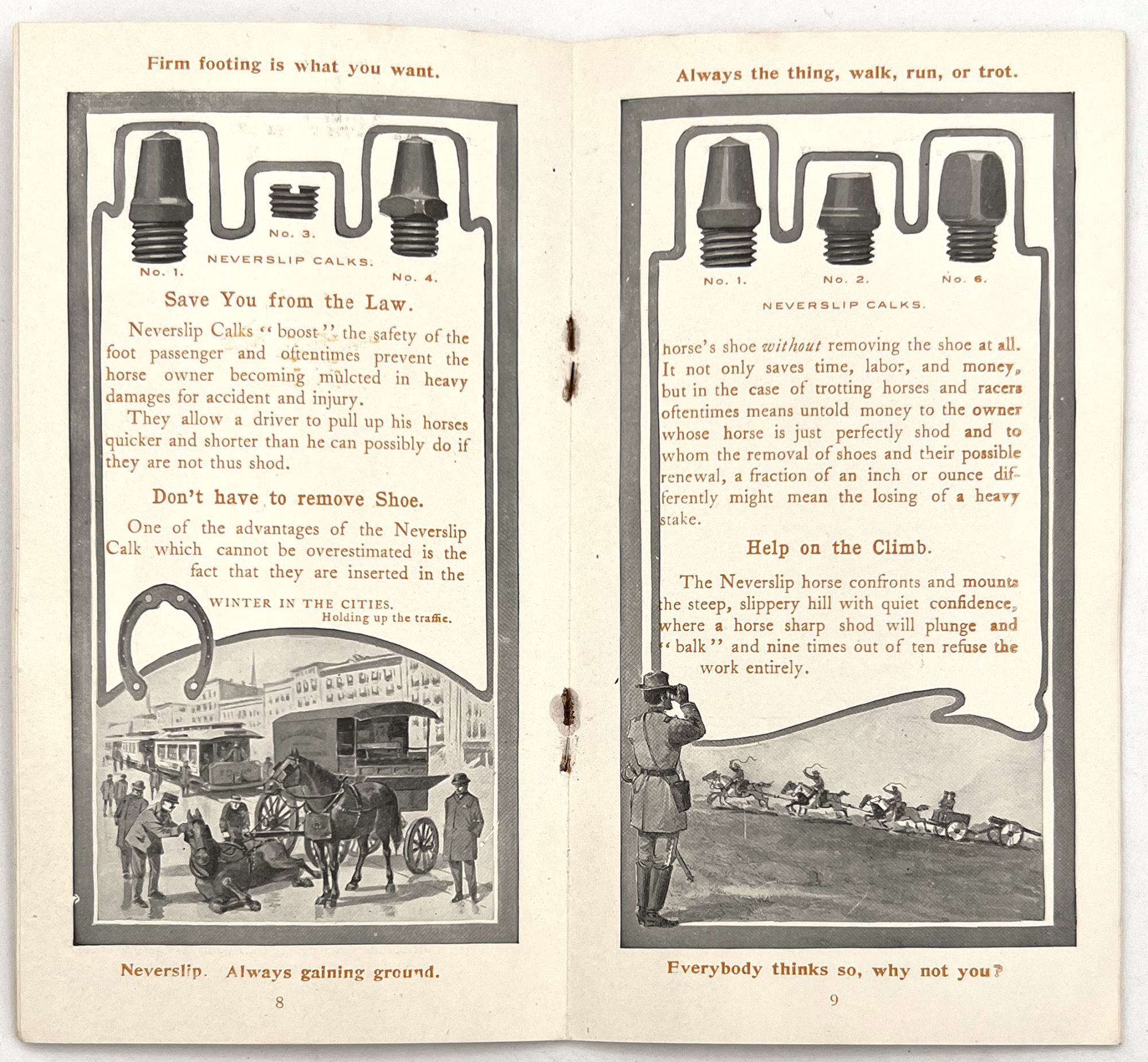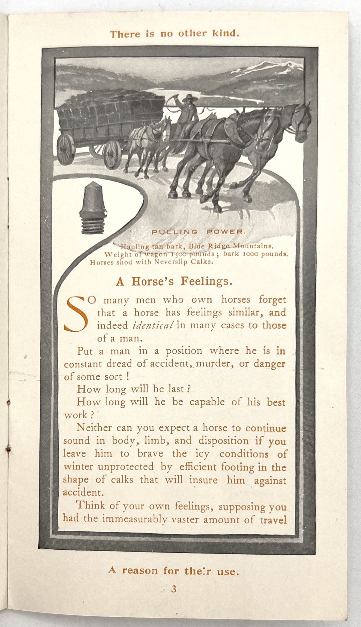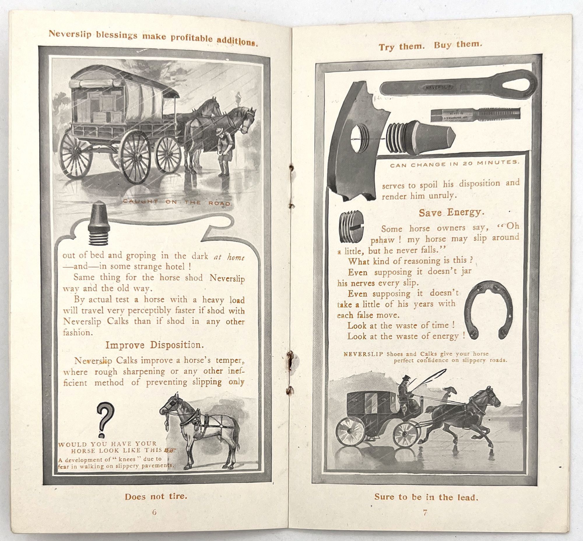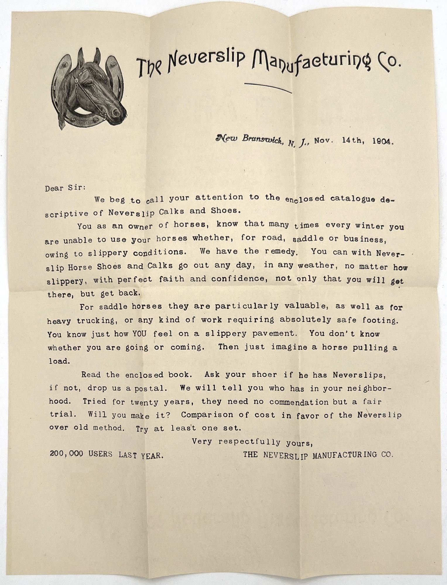 New Brunswick, New Jersey: The Neverslip Manufacturing Company, 1904. Very good. Wear to envelope. Letter folds to circular. Remnants of envelope seal to lower wrapper of booklet.. A booklet, printed circular letter, and original illustrated envelope advertising "Neverslip" brand calks and shoes to farriers in 1904. Provides interesting insight into an industry essential to equine care. The booklet features illustrations of horses at work, including pulling loads and carriages, racing, and even crossing a frozen lake. Includes a chart with shoe sizes and uses in the back. Single vol. (6.5" by 3.5"), pp. 16, illus., in original illus. wrps with image of farrier on front with large horse shoe. Printed circular sales pitch letter measures approx. 10.75" by 8.5"; envelope measures approx. 3.75" by 6.75" and features an illustration of horses surrounded by a decorative horse shoe.