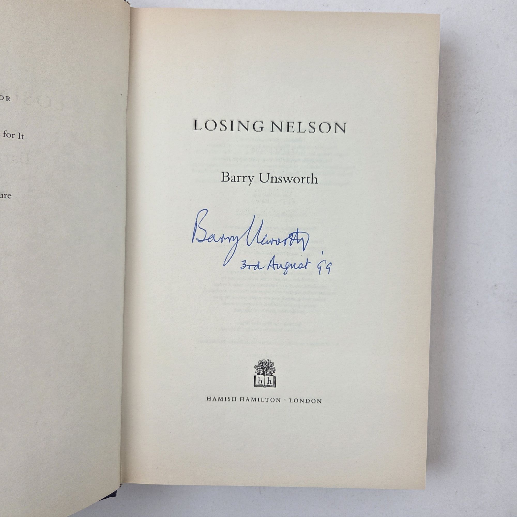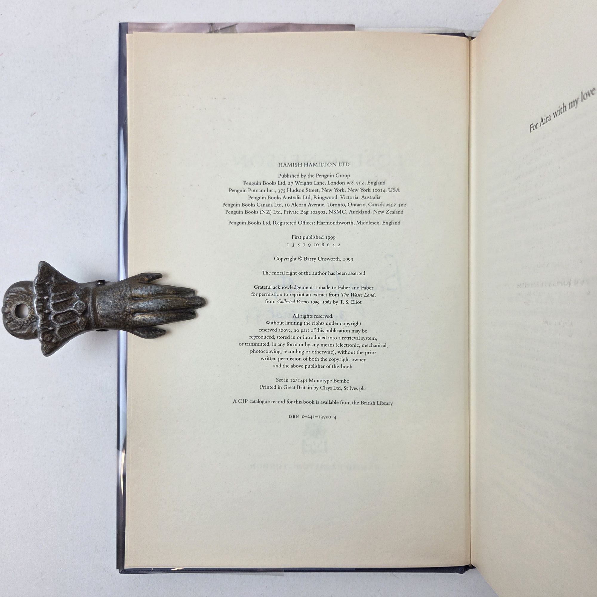 London: Hamish Hamilton, 1999. First Edition, First Printing. Hardcover. Octavo, 312 pages. In Very Good condition with a Very Good dust jacket. Spine blue with orange and white lettering. Dust jacket protected in mylar coving, sticker residue to lower spine, price uncut: "£15.99". Boards bound in blue cloth with shelf wear to upper edged and top of spine. Text block has age-toning to edges. Signed, "Barry Unsworth/ 3rd august '99" to title page. Shelved in Room C Overflow. 1405463. Special Collections.