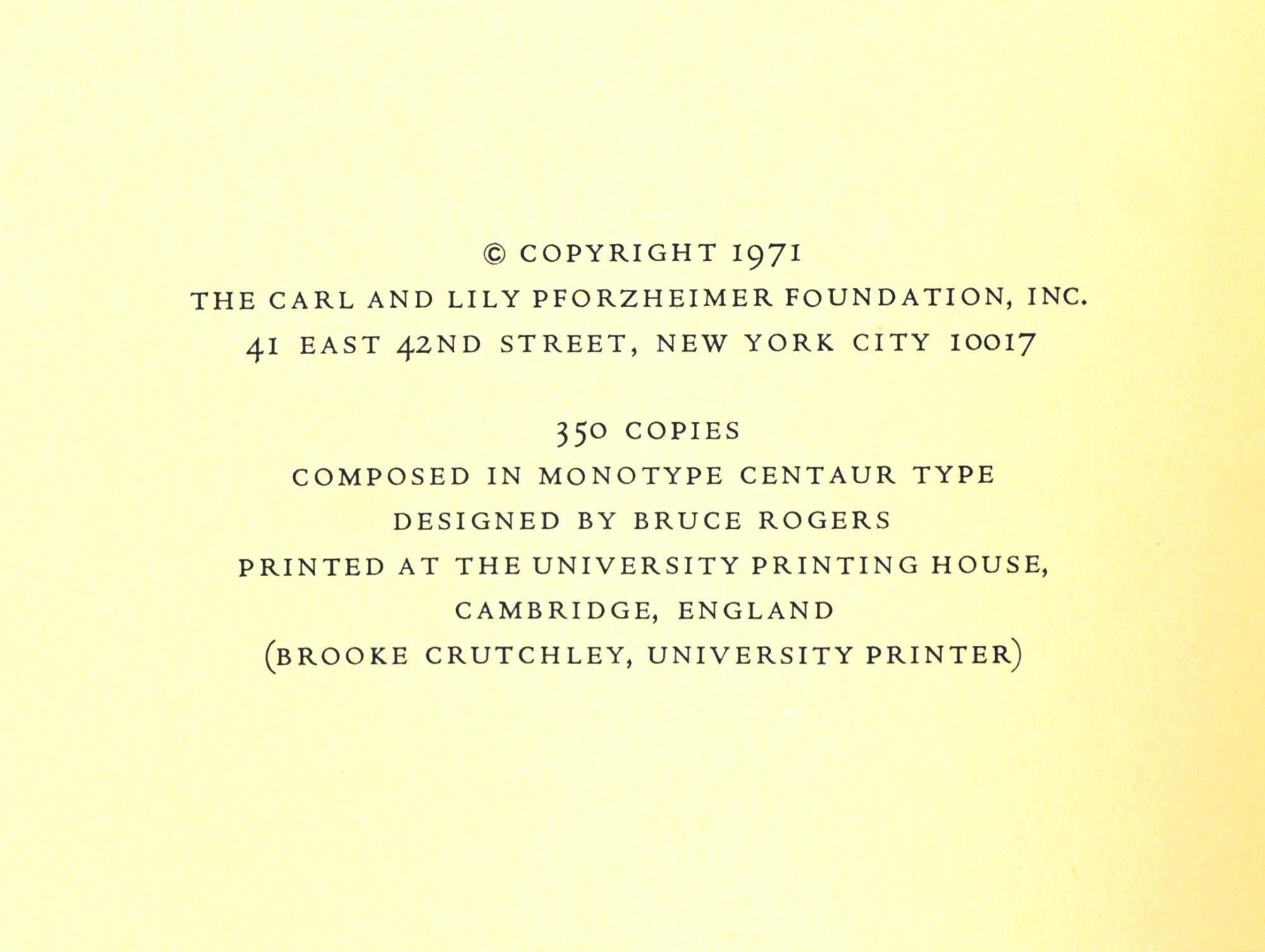 Cambridge, England: Printed for the Carl H. Pfortzheimer Library at the University Printing House, 1971. Hard Cover. Near Fine binding. Quarto; in marbled paper-covered boards backed in brown cloth and titled vertically to the spine;; with the bookplate of the Carl and Lily Pforzheimer Foundatioon on the front pastedown; there are no marks of any kind in the book; 44, [45] pages, Near Fine binding.