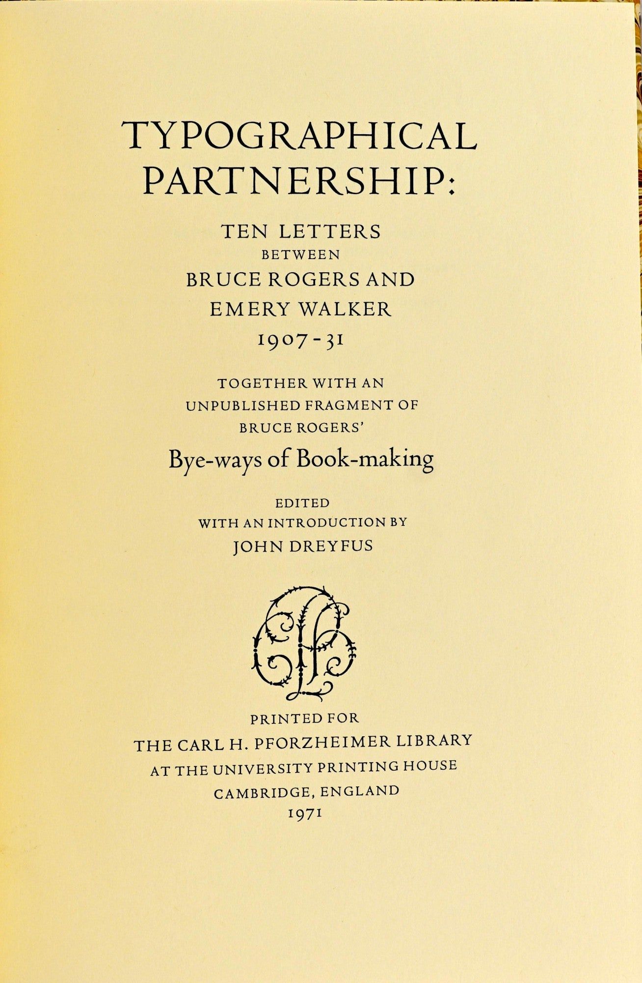 [SPECIAL PRESS] TYPOGRAPHICAL PARTNERSHIP. TEN LETTERS BETWEEN BRUCE ROGERS AND EMERY WALKER 1907-31, TOGETHER WITH UNPUBLISHED FRAGMENT OF BRUCE-ROGERS’ BYE-WAYS OF BOOK-MAKING
