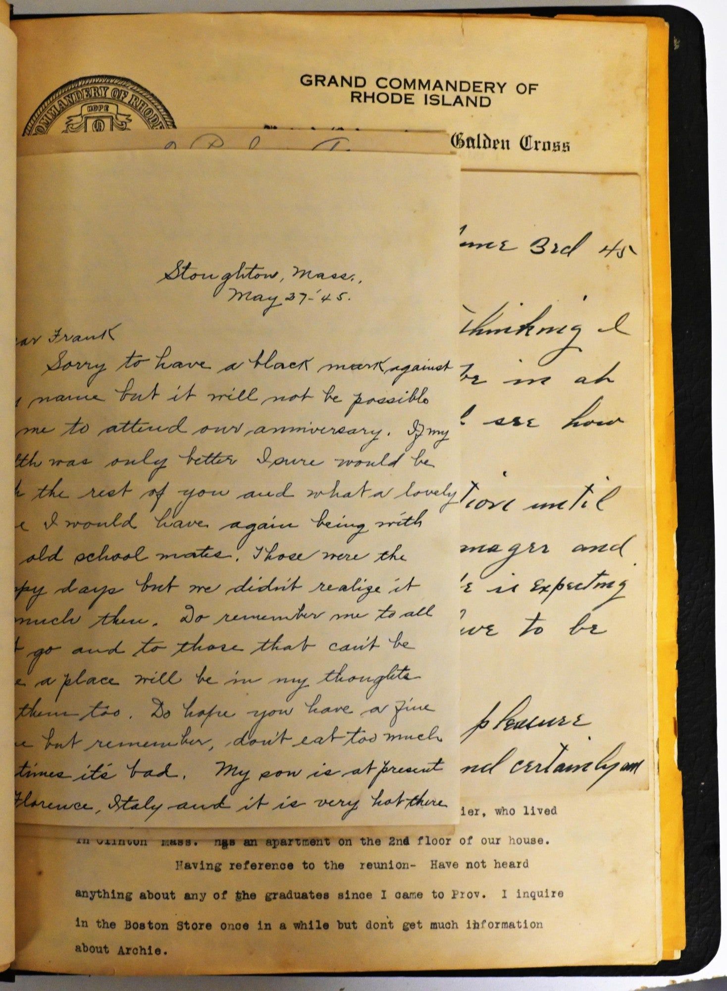 Pepperell, Massachusetts, 1945. Frank Tyler Marston (1877-1952) was the President, Salutatorian, and Class Poet of the 1895 coed graduating class of Pepperell High School in Massachusetts, on the border with New Hampshire. He created the scrapbook and included photographs of the school and Prescott Hall, where the graduations took place, a program, a clipping, his invitation, and several carte-de-visite photographs. Marston later wrote at bottom what became of them in terms of their family life. He also included a senior class statistics chart, transcribed diary notes regarding the graduation as well as class meetings.~~News clippings regarding a 20-year anniversary in 1915 and a 50-year anniversary in 1945 and souvenirs from the latter event. A letter from Frank about the event is included with all the letters of both attendees and those who had to send their regrets. The volume closes with several programs and information about graduates from other classes from 1896 to 1945.~~Marston became a newspaper editor, navy yard worker, served in WWI, and became a hotel worker. He married Minnie Stewart in 1904 and they had 4 children and 5 grandchildren, per his own later edits. ~~11 ½” x 9” black faux leather scrapbook, 40pp with numerous items laid in. Good.