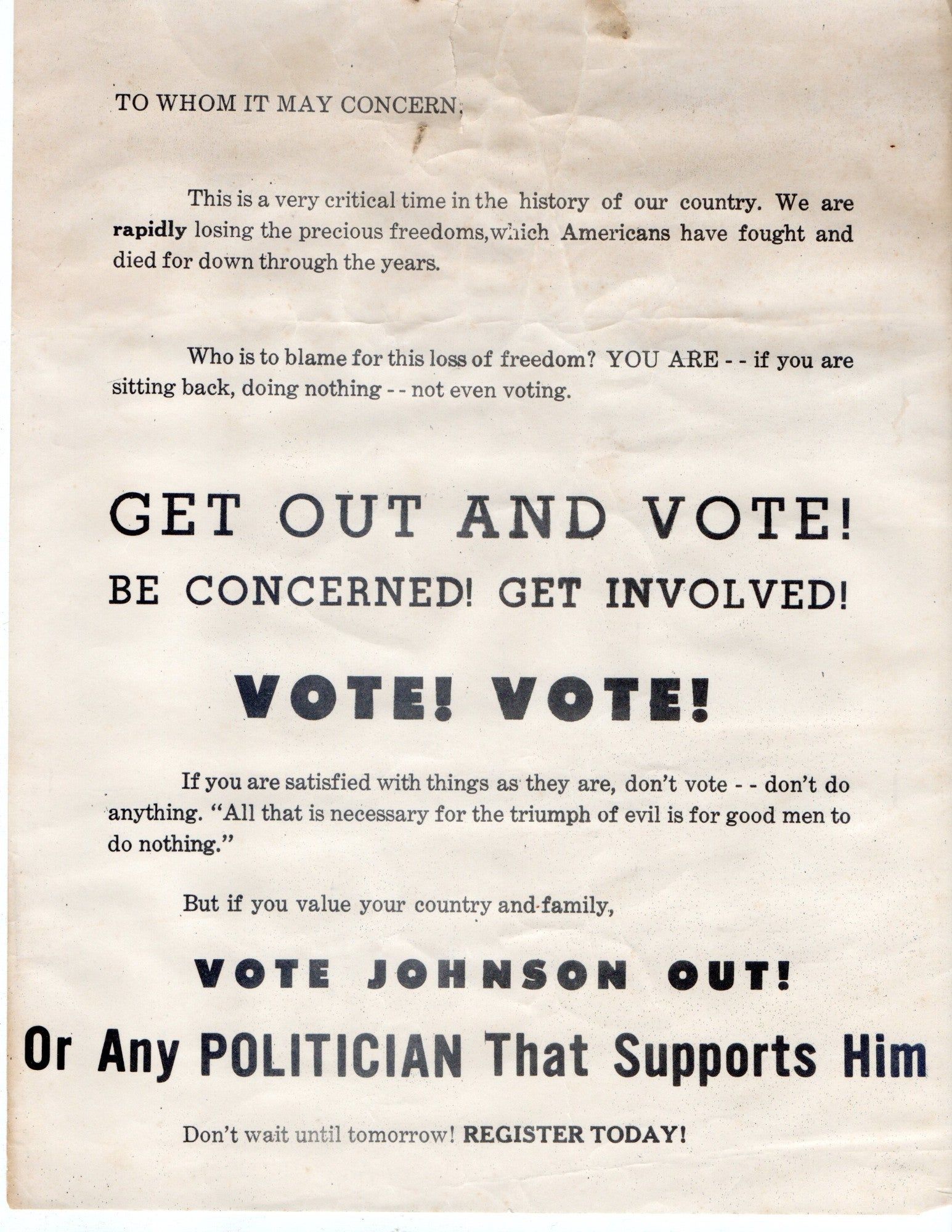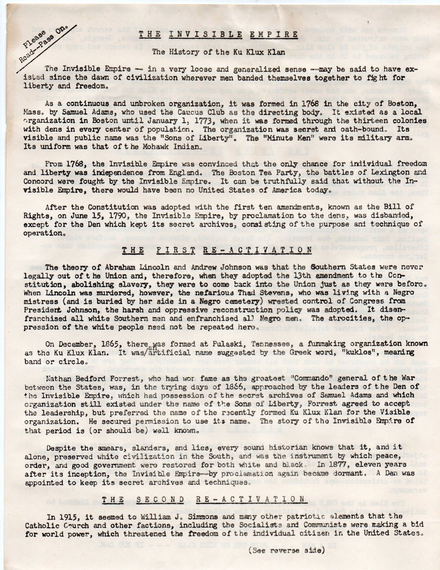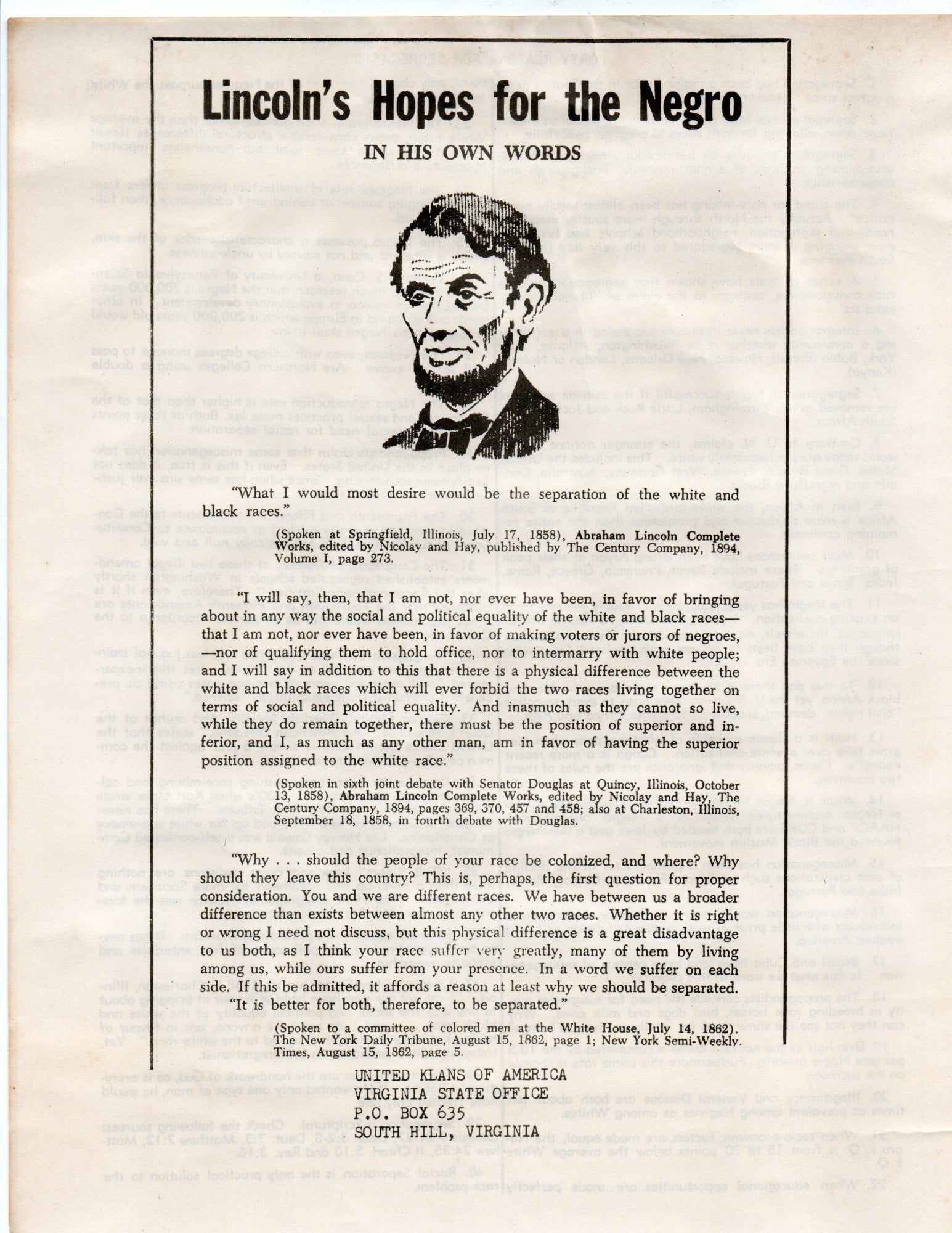 South Hill, Virginia, 1968. 4 Ku Klux Klan broadsides. Two contain a P.O. Box address for the United Klans of America, in South Hill, Virginia. One is a fairly innocuous plea for people to vote, specifically against President Lyndon B. Johnson. This was likely in response to his support of the Civil Rights movement and the Voting Rights Act of 1965, dating the broadside to the following election in 1968. The second pairs an image of Abraham Lincoln with three of his quotes to support a list of 40 reasons for racial segregation. The third is a detailed version of Klan history which conflates their founding to Samuel Adams and the Sons of Liberty in 1768. It describes the through-line between this origin story and three successive “re-activations” of the KKK to a Den of the Invisible Empire and their secret archives. The fourth broadside contains extremely offensive illustrations and text regarding the dangers of racial desegregation. Declaring that segregation “made America great”~~This propaganda generated by the KKK in southern Virginia in the late 1960s attempts to counter their representation as a disorganized and ineffective organization.~.