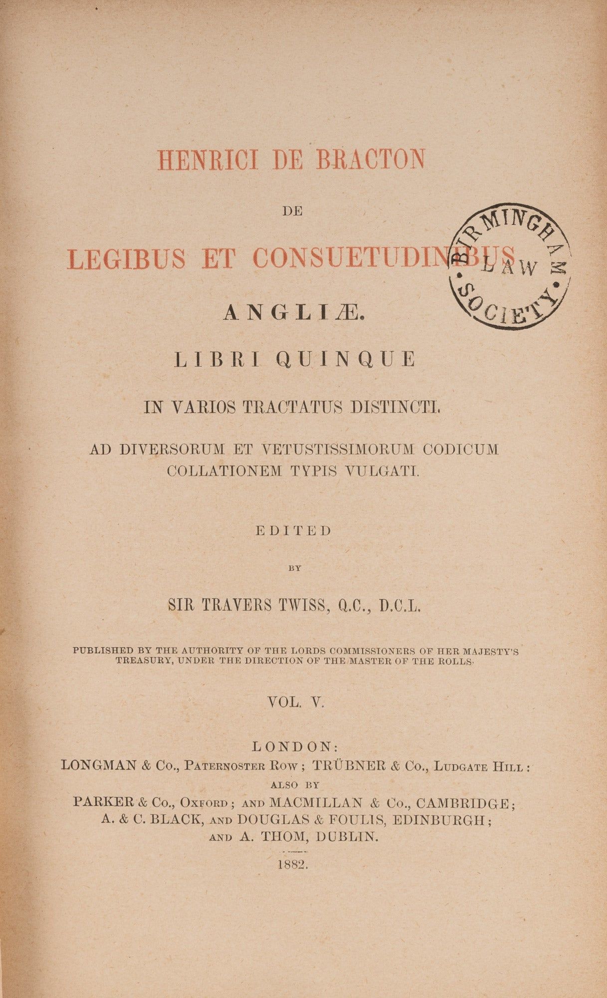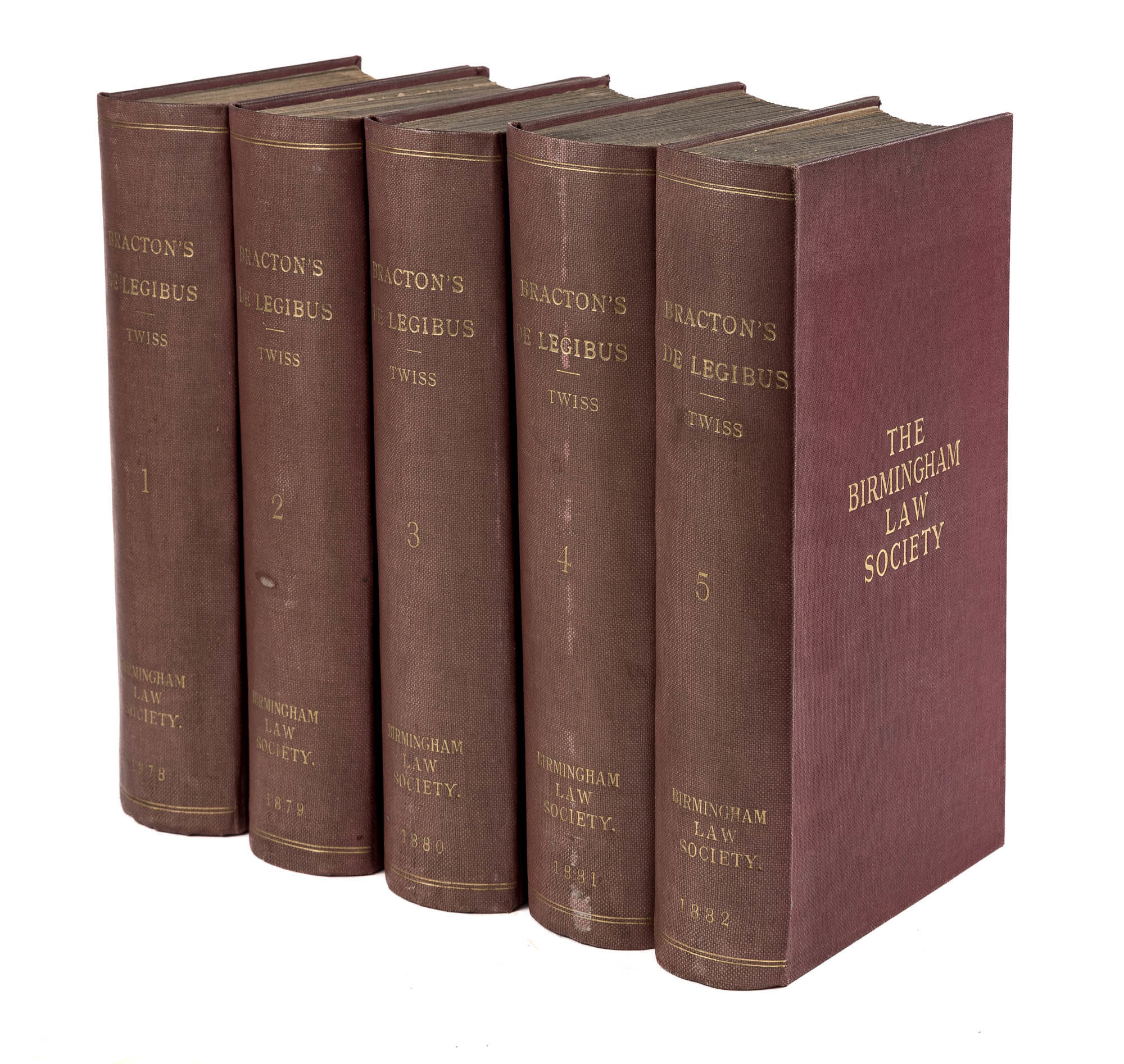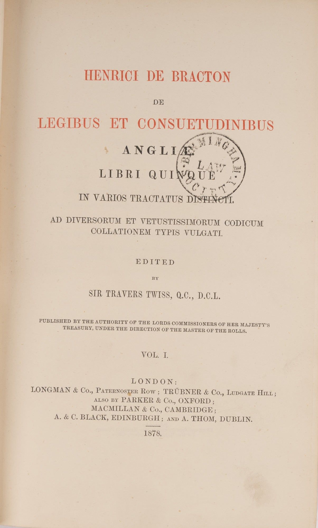 1882. Bracton, Henry de, [1210-1268]. Twiss, Sir Travers, [1809-1897], Editor. Henrici de Bracton De Legibus et Consuetudinibus Angliae. Libri Quinque in Varios Tractatus Distincti. Ad Diversorum et Vetustissimorum Codicum Collationem Typis Vulgati. London: Longman & Co., 1878-1882. Volumes 1 to 5 of 6 Volumes. Burgundy library cloth with gilt stamped spines and front covers. Moderate shelfwear with some rubbing and fading to spines and boards. Red and black ink title pages. Bookplates to front pastedowns. Property stamps to half-titles, title pages, and contents pages, otherwise internally clean. A very good set. $150. * Volumes One to Five of six volumes. Latin text on verso, English translation on recto. Contents: Vol. 1. On the Division of Things, Book I; On Acquiring the Dominion of Things, Book II, As Far as Chapter xxxvi; Vol. 2. Of Acquiring the Dominion of Things, Book II, Chapter xxxvii; Of Actions, Book III, Treatise I; Of the Crown, Book III, Treatise II; Articles of the Eyre, 2 Edward I, Appendix I; Articles of the Eyre, 3 Edward I, Appendix II; Plea-roll, 18 Henry III, Appendix III; Vol. 3. Of Assises of Novel Disseysine, Book IV, Treatise I; Vol. 4. Of an Assise of Last Presentation, Book IV, Treatise II; Of an Assise of Mortdancester, Book IV, Treatise III; Of a Writ of Cosinage, Book IV, Treatise IV; Of an Assise of Utrum, Book IV, Treatise V; Of an Action for Dower, Book IV, Treatise VI; Vol. 5. Of an Action of Entry, Book IV, Treatise VII; Of a Writ of Right, Book V, Treatise I; Of Essoins, Book V, Treatise II; Of Defaults, Book V, Treatise III.