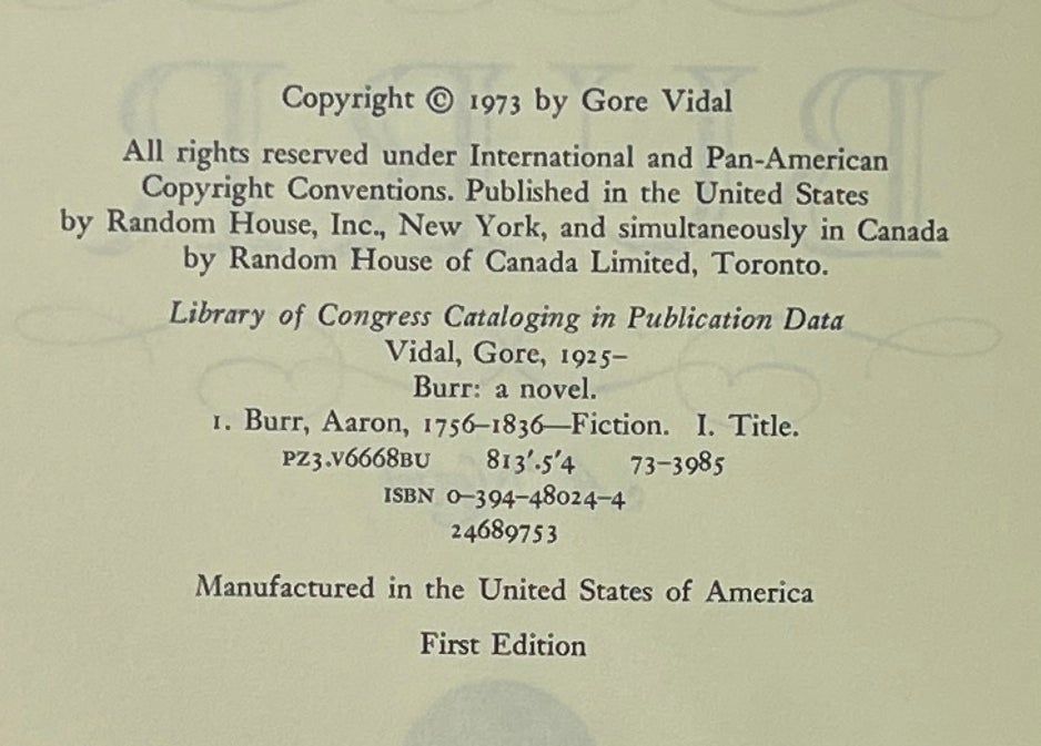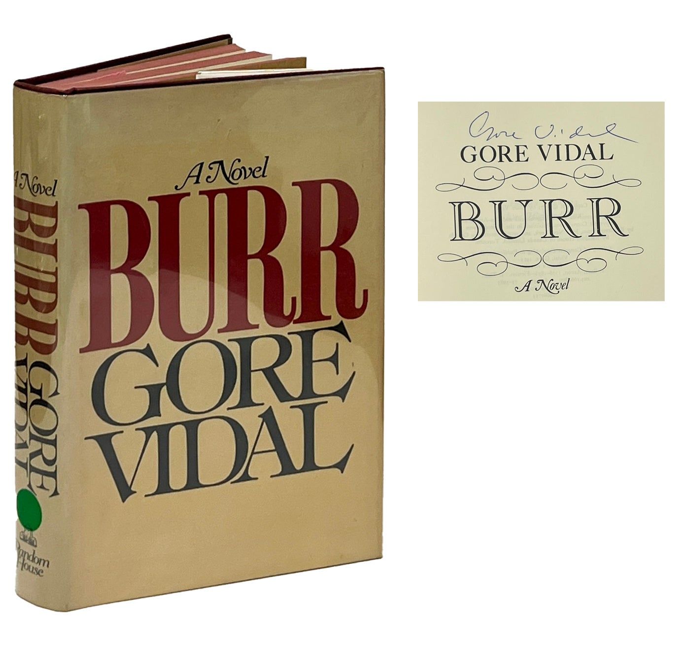 New York: Random House, 1973. First Edition. Hardcover. Fine/Near Fine. Signed by Vidal on the title page. About Fine in a Near Fine jacket, clipped. Brown cloth, a few scratches, with gilt lettering on the spine and front board. Square and firmly bound with a red topstain, clean internally. Vidal's National Book Award-nominated novel-as-memoir about Burr and "the founding struggles and the endless intrigues of the new United States.