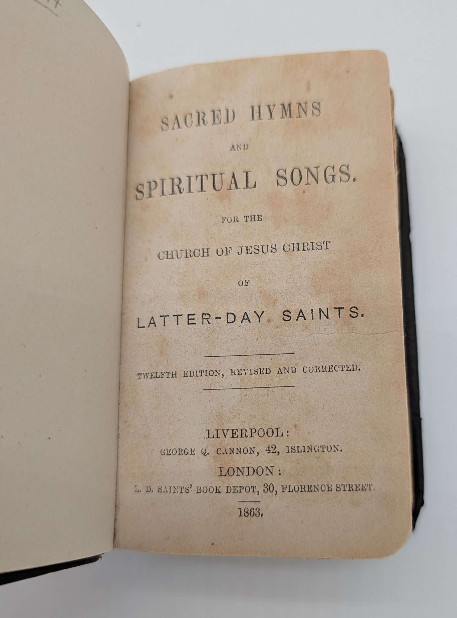 Liverpool & London: George Q. Cannon, 42, Islington & L. D. Saints' Book Depot, 30, Florence Street, 1863. Twelfth edition, revised and corrected. Leather Bound. Good. [1-5], 6-415, [416] pp. 12 cm. Full brown leather with decorative blind ruling, patterns, and designs to the boards and spine. Spine label with "L.D.S. HYMNS" stamped in gilt (which is now faded but still visible).