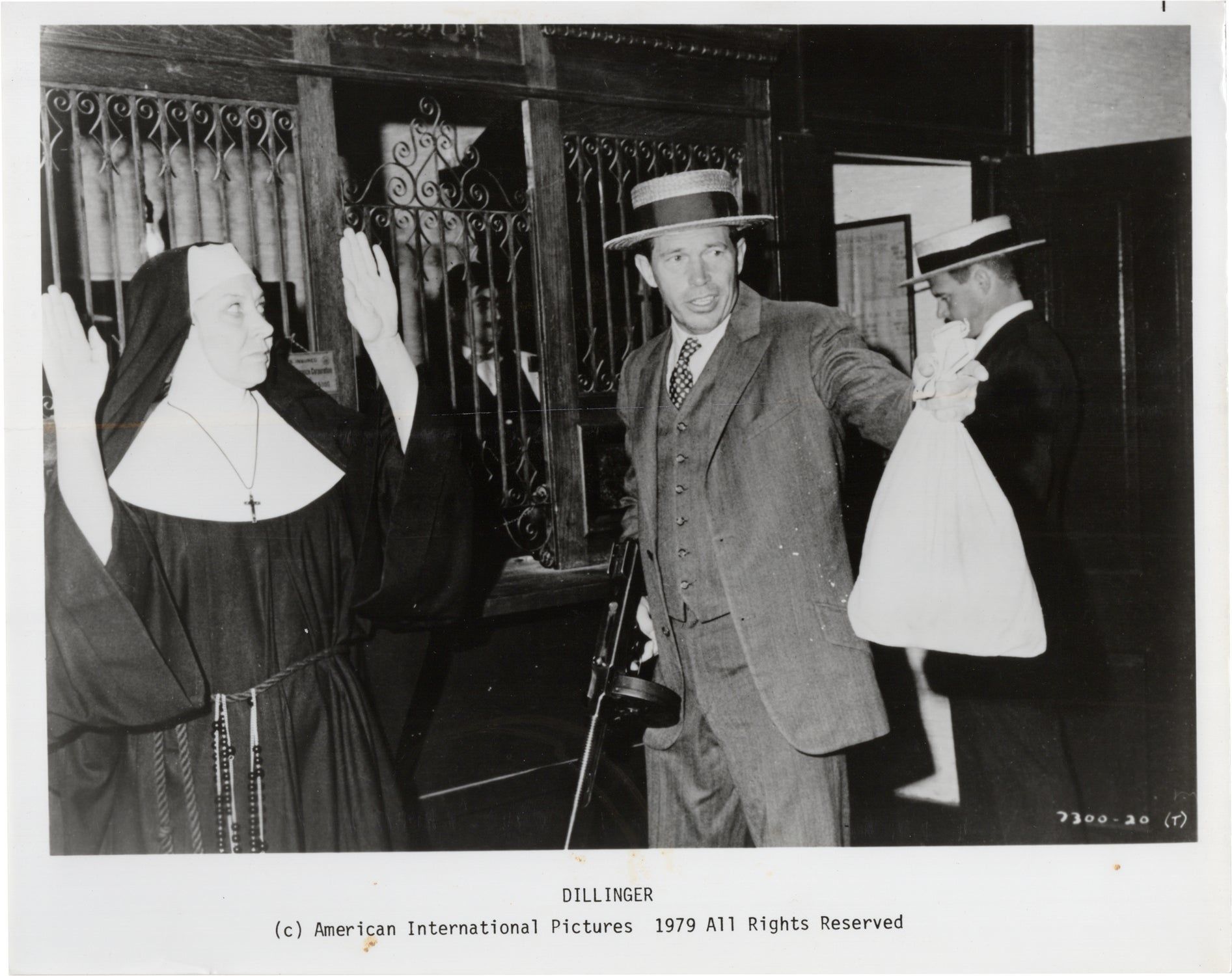Los Angeles: American International Pictures [AIP], 1979. Vintage studio still photograph from a 1979 re-release of the 1973 film, showing Warren Oates mid-holdup, with a nun looking on with judgment on the left.