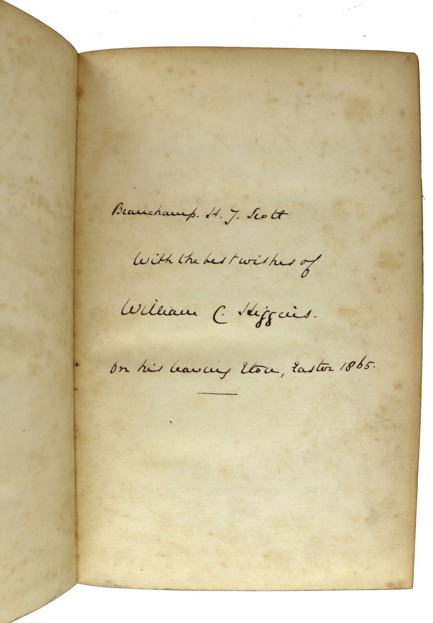 Contemporary gift inscription on front flyleaf to Beauchamp H.J. Scott, "on his leaving Eton, Easter 1865." Also with 20th century ex libris of Virginia World War I and II veteran Captain William Aylett Callaway (1894-1958) to front pastedown.