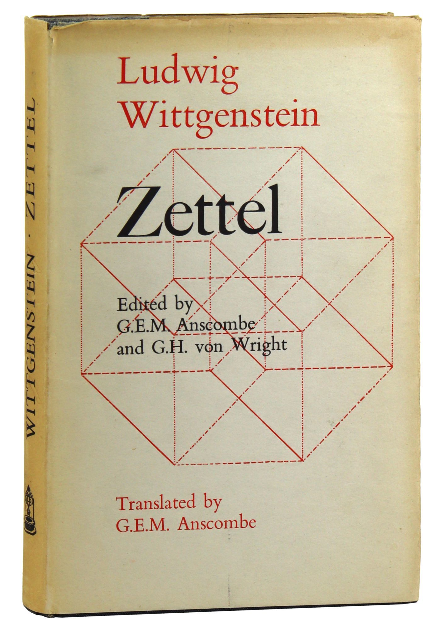First English language appearance of the 717 typescript slips (zettel) discovered in a box after the philosopher's death in 1951. "It can be conjectured that he preserved them in this way for incorporation into some future work. Since they received such special attention and separate preservation, and make a distinctive contribution to his later thought, they are here presented in an arrangement according to subject matter" (upper jacket flap).