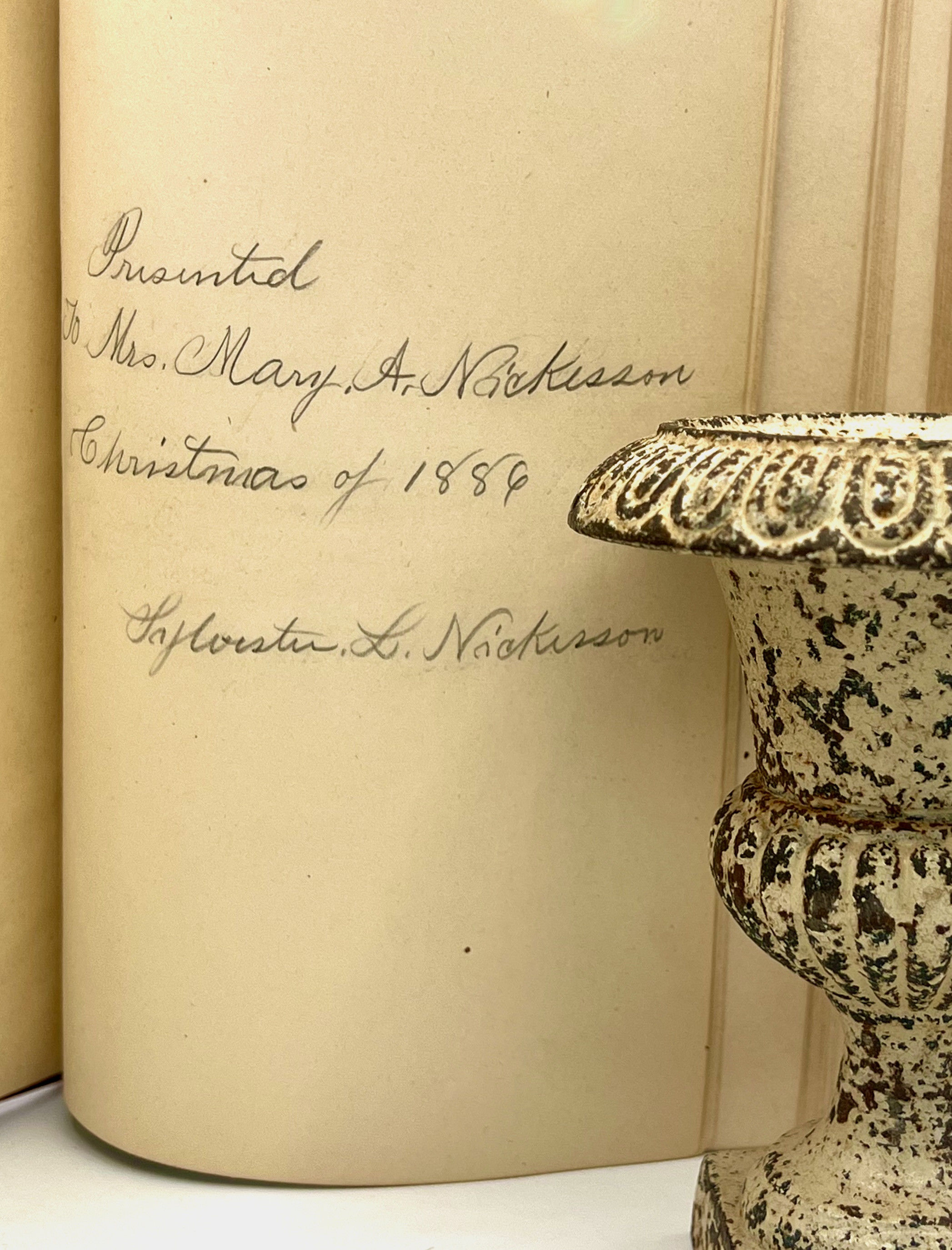 HOLYOKE, MASS: Transcript Publishing Company, 1886. First Edition. Hardcover. Maroon cloth covered boards, title embossed in gilt. Very good. 108 pages. 22 x 14.5 cm. Recipes attributed to church members. Recipes include: Fish Chowder, Escalloped Oysters, Dressing for Turkey, Cold Mutton, Saratoga Potatoes (potato chips), Fritters, Puddings, Connecticut Doughnuts, Molasses Candy, Hop Beer, Food for the Sick, etc. On page 73, there seems to a typo and the owner of this book crossed out two cups baking powder and wrote "flour". Other alterations written in neat script - interior clean, boards toned and lightly rubbed. Presentation signature on front free end paper, "Presented to Mrs. Mary A. Nickesson Christmas of 1886 - Sylvester L. Nickesson". [BROWN 1284].