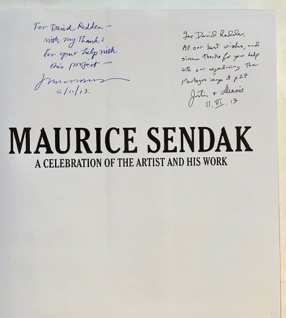 New York: Harry N. Abrams, 2013. Boards. Near Fine/Near Fine. Maurice Sendak. A wonderful Association copy. INSCRIBED BY ALL 3 KEY PARTICIPANTS (INCLUDING THE RENOWNED CHILDREN'S RARE BOOKSELLER JUSTIN SCHILLER) TO LEGENDARY SOTHEBYS AUCTIONEER DAVID REDDEN. A very sharp copy to boot of the 1st edition of the catalogue based on the June-August 2013 exhibition at New York's Society of Illustrators. The show was curated by Justin Schiller and Dennis David, and edited by Leonard Marcus, the 3 figures who inscribed this copy to David Redden. Clean and Near Fine in a bright, Near Fine dustjacket. Quarto, hundreds of crisp color (and black-and-white) reproductions throughout. A major examination of the work of the great Maestro Sendak.