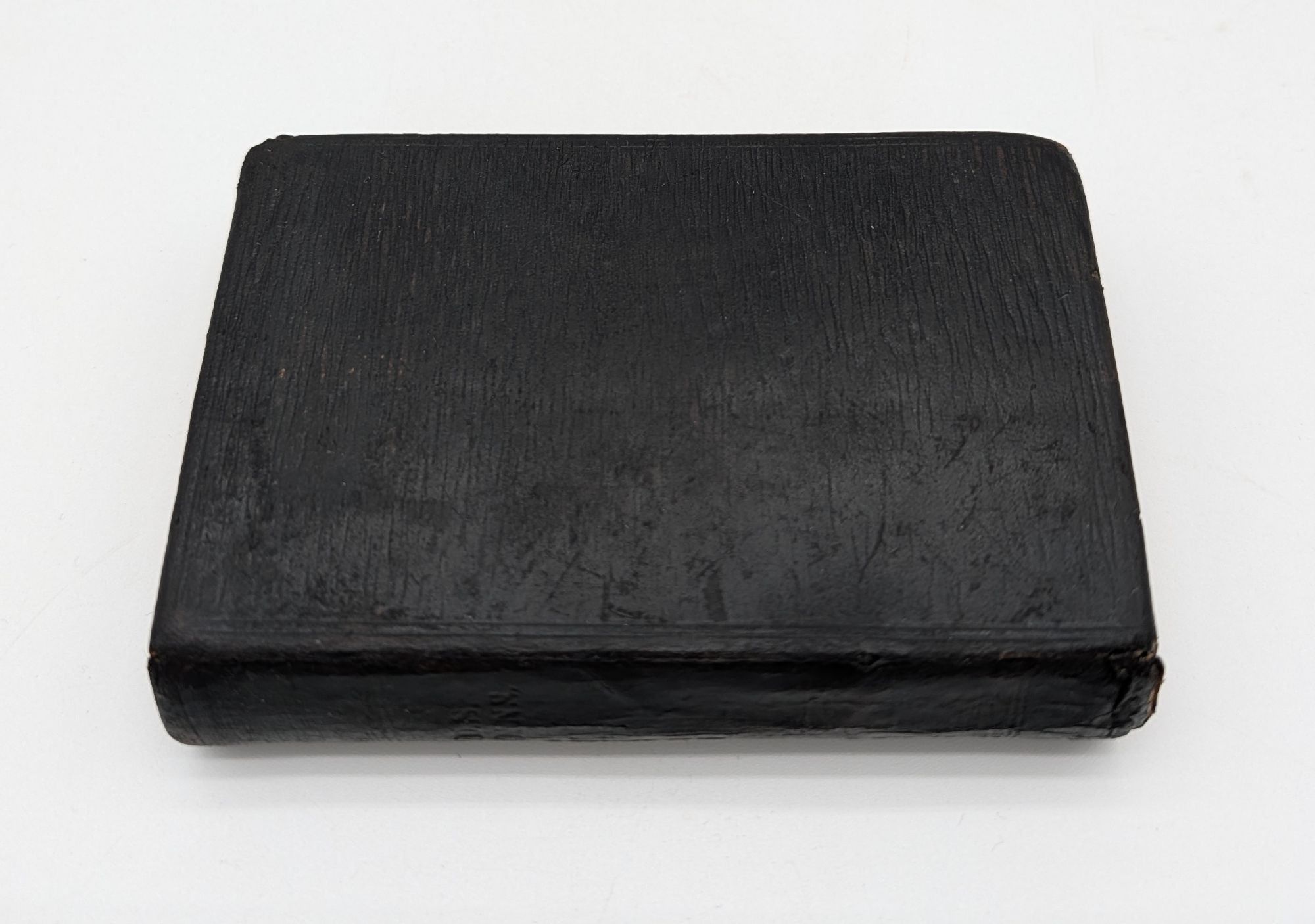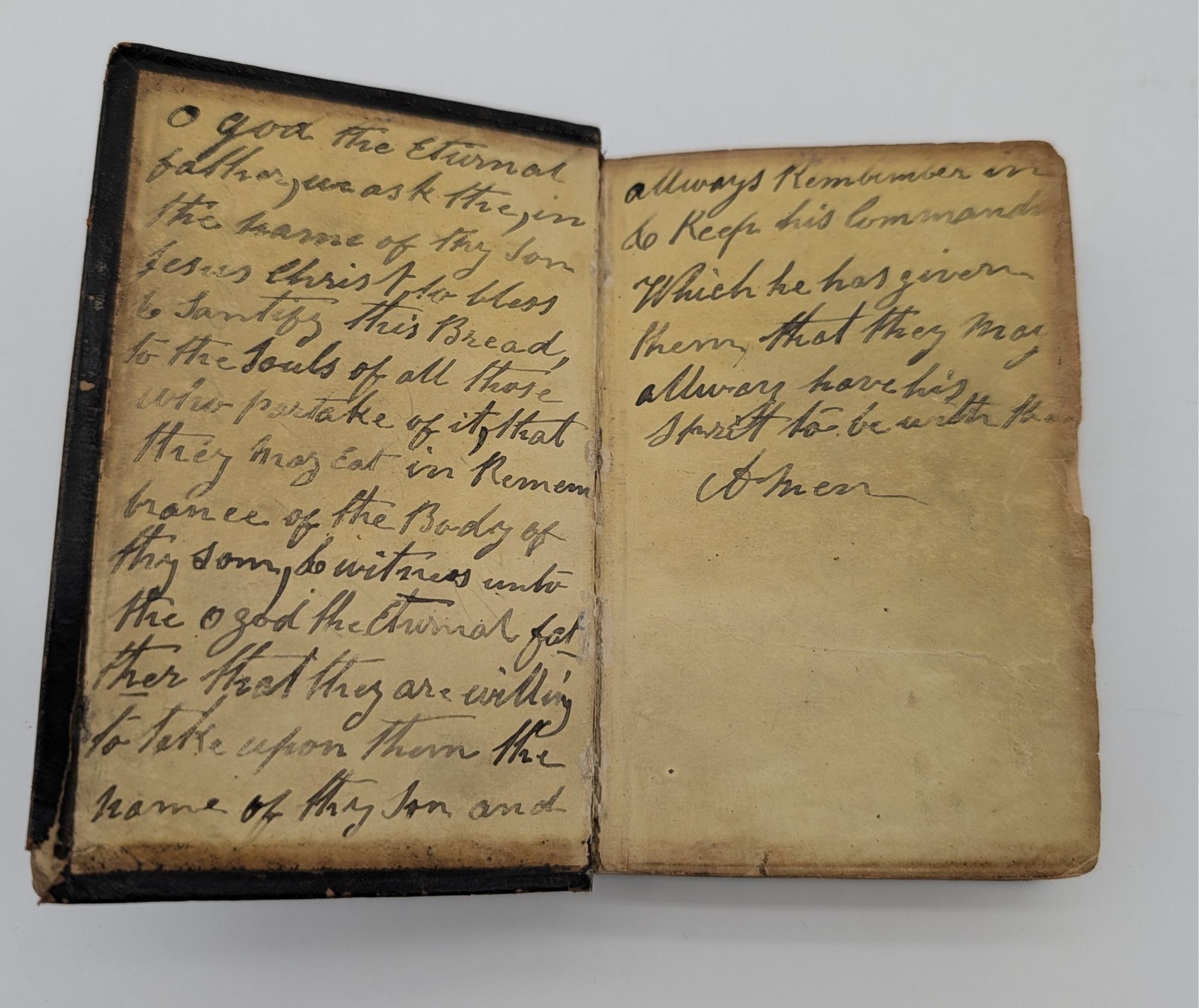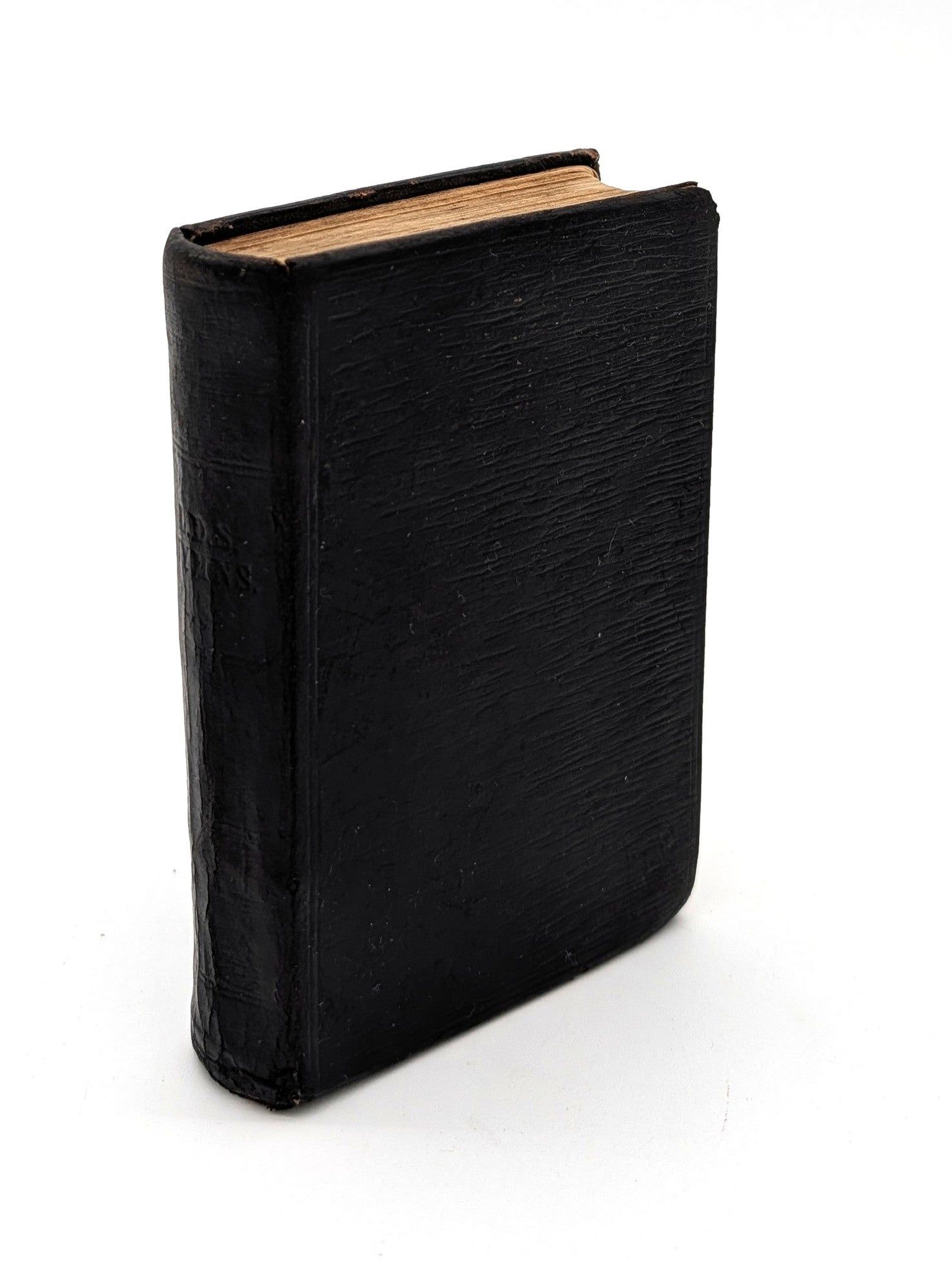 Liverpool & London: Albert Carrington, 42, Islington & L. D. Saints' Book Depot, 20, Bishop's Grove, 1877. Sixteenth Edition. Leather Bound. Very Good. [5]-432 pp. 12 cm. Full black striated leather with blind ruled borderlines to boards and backstrip. Title stamped on backstrip ("L.D.S. HYMNS"). Any gilt to the stamping has faded. The foot of the backstrip has been professionally repaired, glued, and toned. Edges and corners of the boards are rubbed, bumped, with underlying boards occasionally peeking through. Binding is solid and tight throughout, but the endsheets are beginning to crack at the hinge. Internally, a touch of age toning, soiling, and a few sporadic short notes in pencil. Page edges occasionally bumped or worn. Collated, complete. Previous owner's name ("J. T. Clements") is neatly written in pencil on the rear free endpaper and on the rear flyleaf. The LDS sacramental prayers are both written in a neat cursive hand in black ink to the yellow coated endsheets (the bread/body prayer at the front, and the wine/water/blood prayer at the rear).