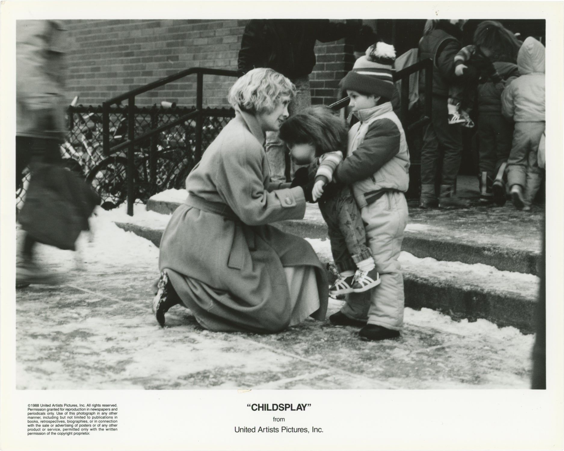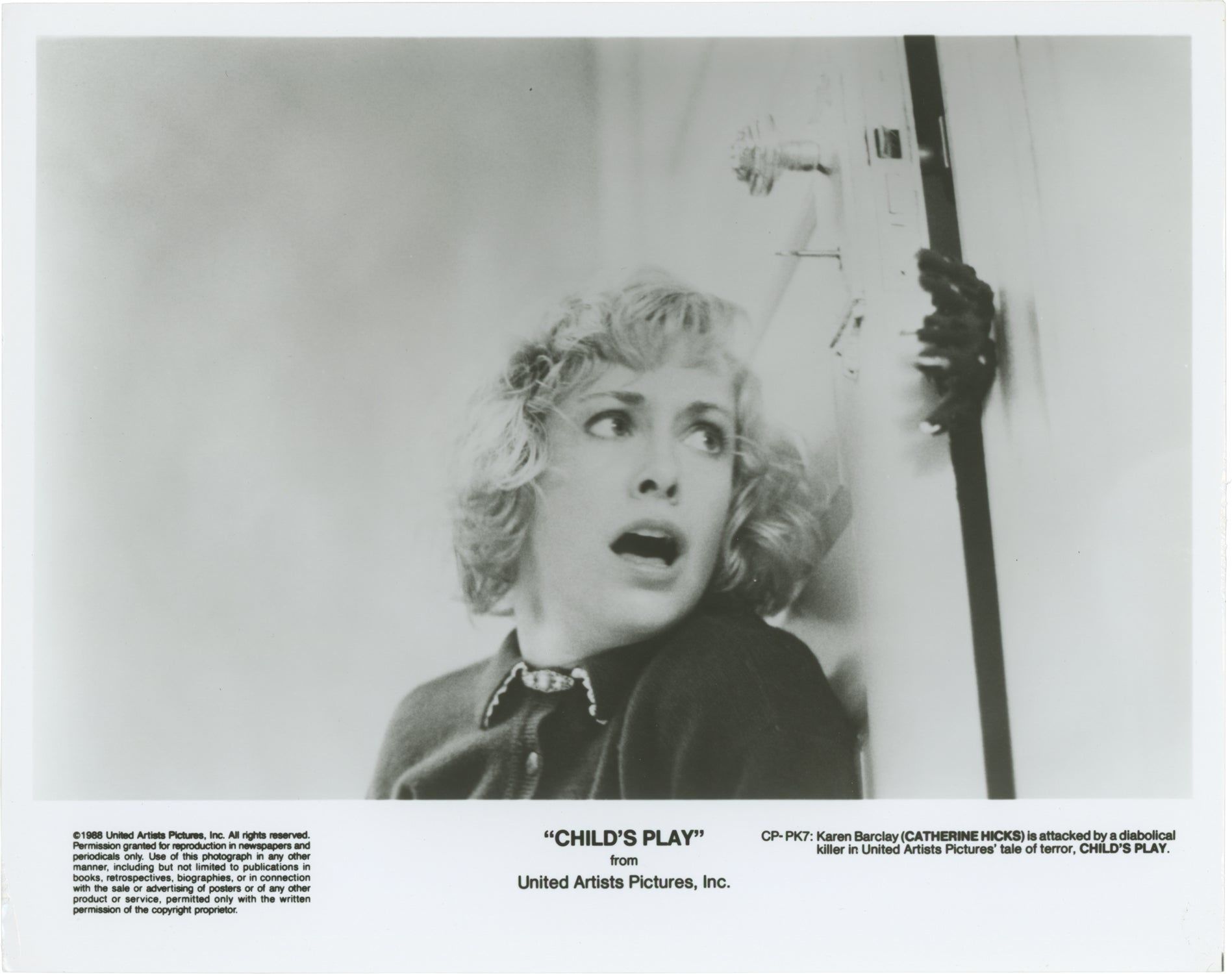 Beverly Hills, CA: United Artists, 1988. Two vintage studio still photographs from the 1988 film [here with an early spelling of the title as "Childsplay," one showing actors Catherine Hicks and Alex Vincent with Chucky, the other showing Hicks screaming in fear.