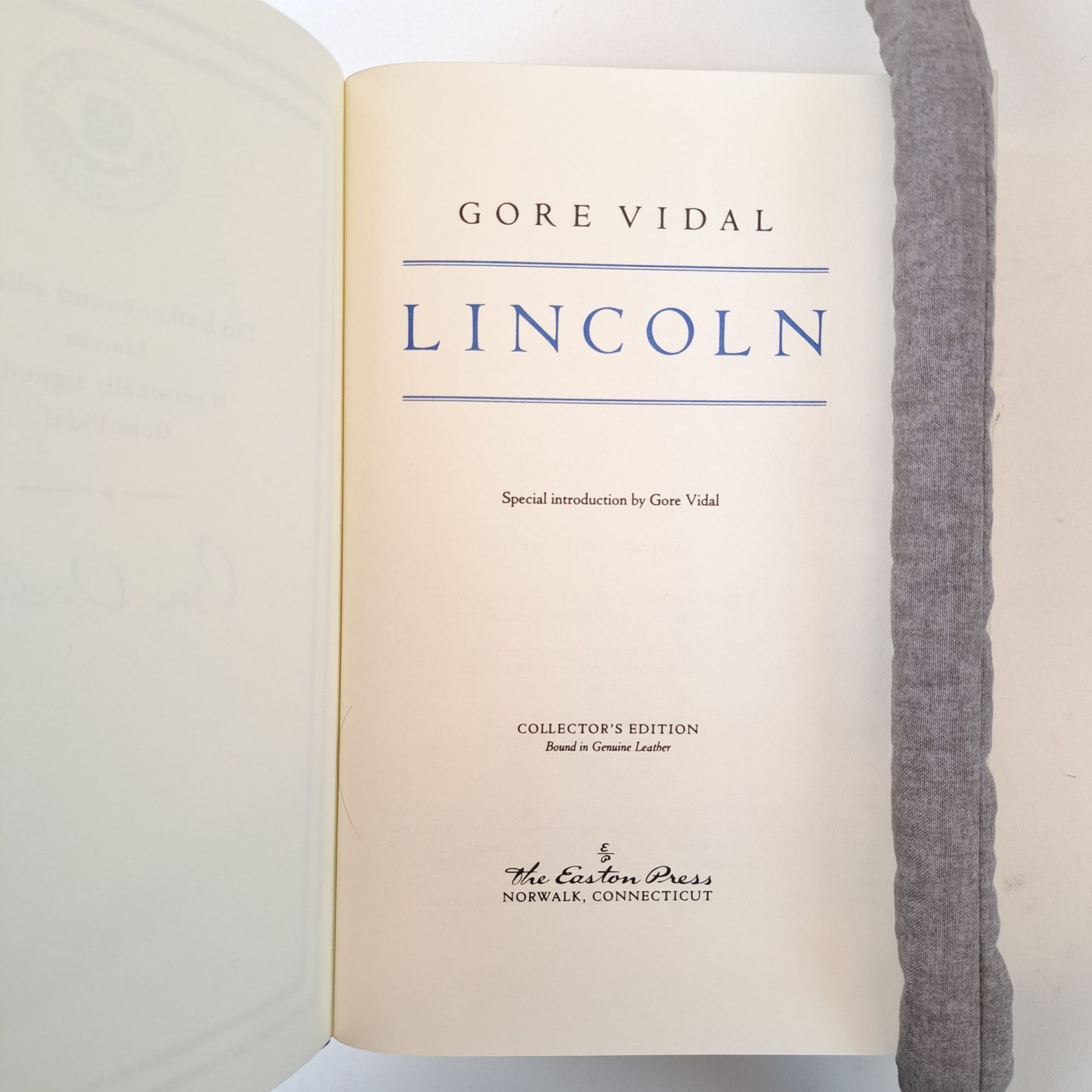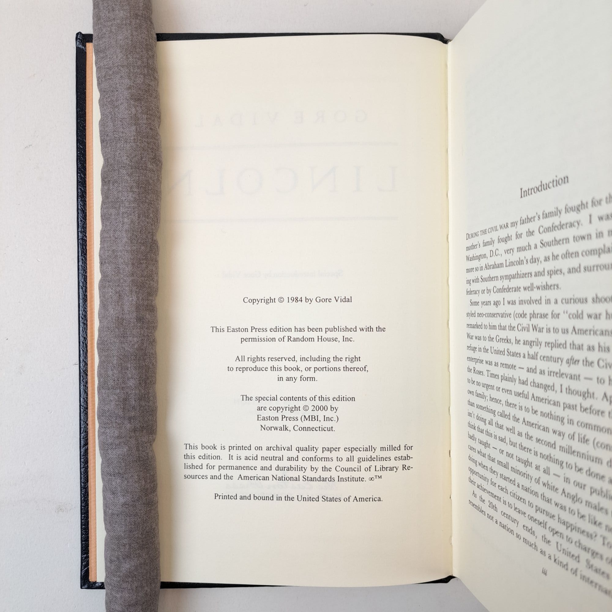 Norwalk: Easton Press, 1984. Collector's Edition. Hardcover. Quarto, v, 657 pages. In Very Good condition. Bound in publisher's dark blue leather with gilt ornamentation. Paneled spine with gilt titling. Boards have light denting to the rear top edge, and light wear to edges. Textblock has silk moiré end papers, a silk ribbon, and gilt edges. Signed flat by Gore Vidal on the signature page. Shelved in Room A. 1405666. Special Collections.