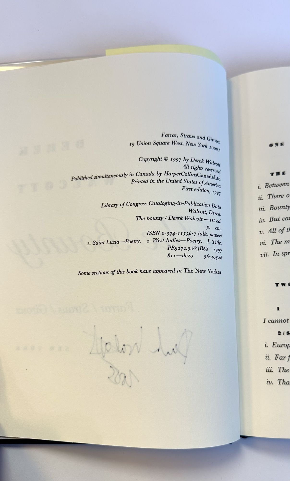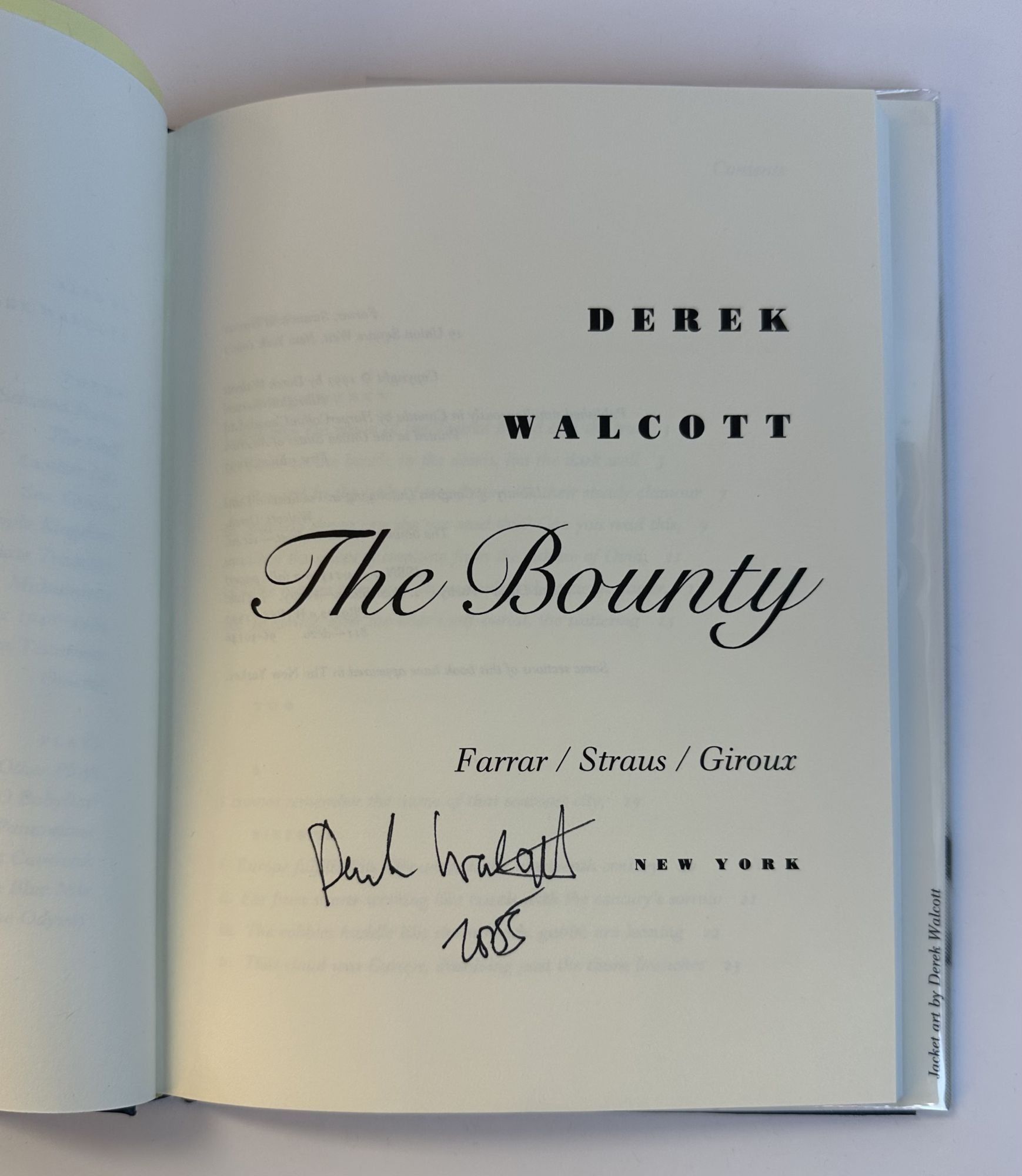 New York: Farrar, Straus and Giroux, 1997. First Edition, First Printing. Hardcover. Octavo, 77 pages. In Very Good condition with a Very Good dust jacket. Spine white with black lettering. Dust jacket protected in mylar covering, spice uncut: "$18.00" Minor shelfwear. Title page signed by Derek Walcott and dated "2005," pages otherwise clean. Shelved in Poetry. 1405677. Shelved Dupont Bookstore.