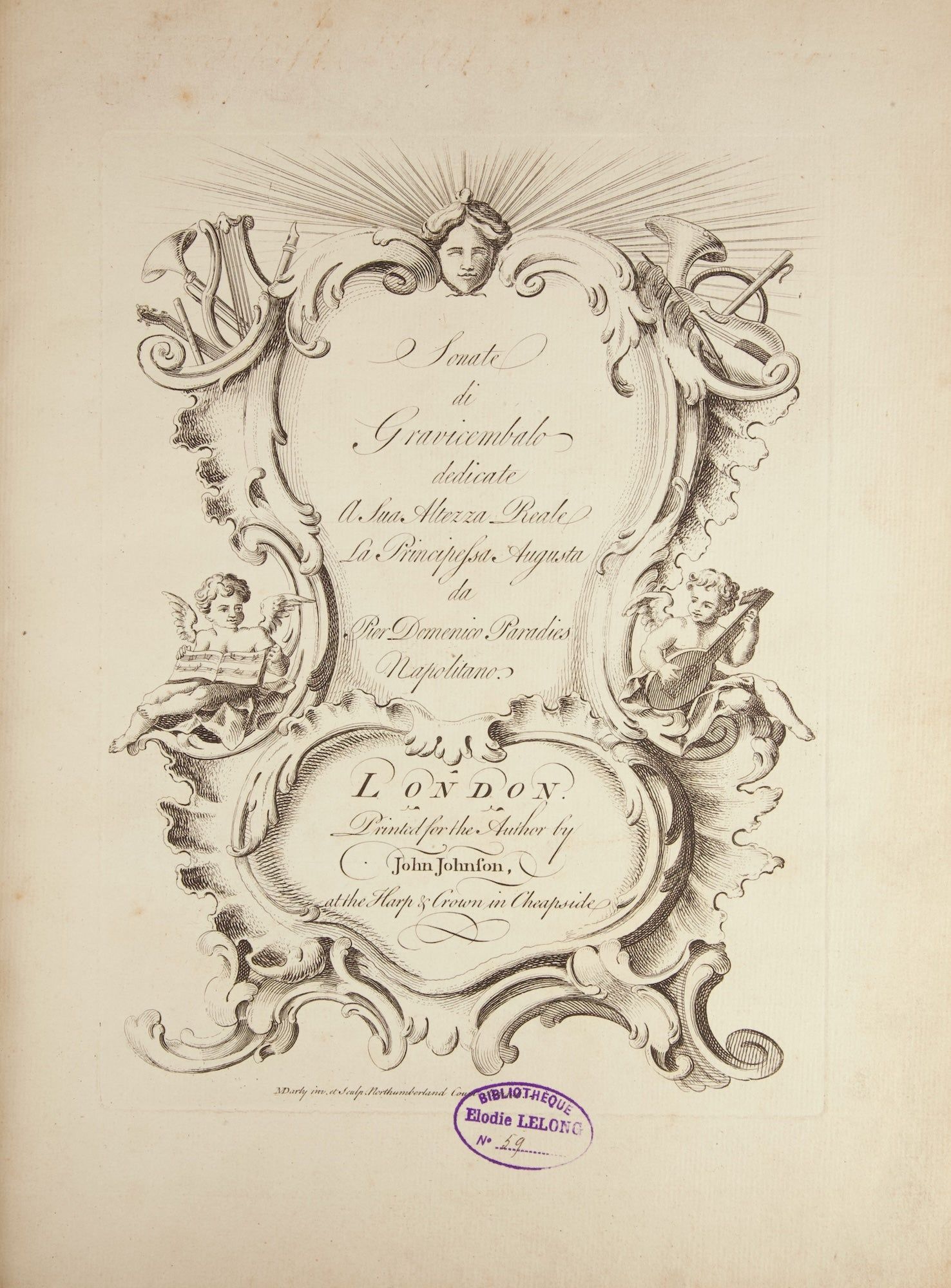 Sonate di Gravicembalo dedicate A Sua Altezza Reale la Principessa Augusta da Pier Domenico Paradies Napolitano ... M. Darly inv. et Sculp. Northumberland Court. [Harpsichord sonatas]