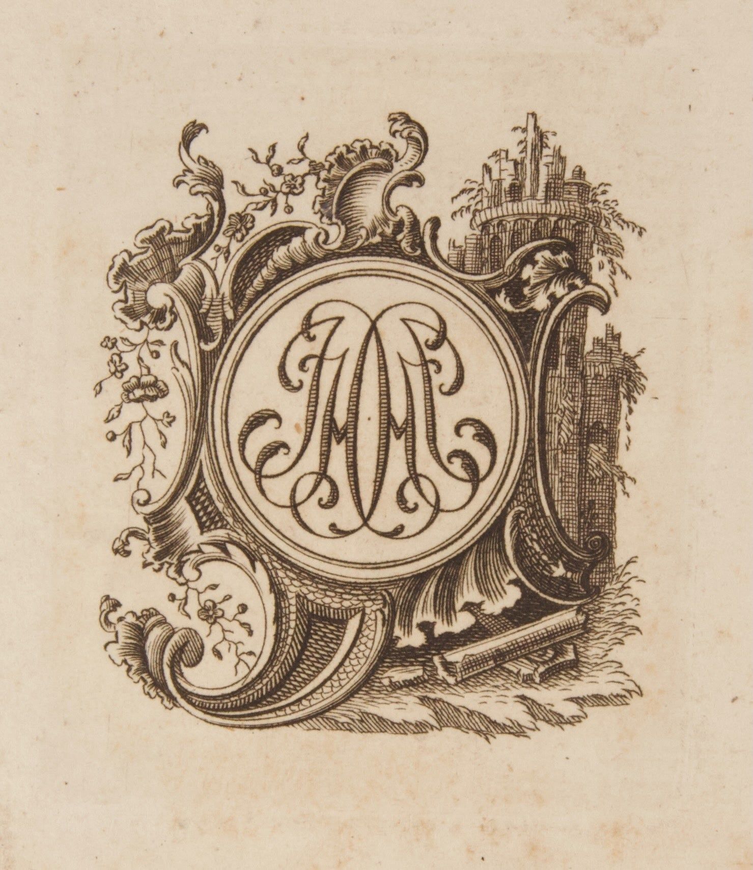 London: Printed for the Author by John Johnson at the Harp & Crown in Cheapside, 1754. Folio. Contemporary mid-tan leather-backed marbled boards with decorative dark red title label gilt to upper., raised bands on spine. 1f. (recto elaborately engraved title within decorative border incorporating a violin, horn, trumpet, bassoon, violin, lyre, putti holding an open book of music and a lute, with a face emanating rays of light, verso blank). 1f. (recto dedication, verso blank), 1f. (recto privilege, verso blank), 47 pp.