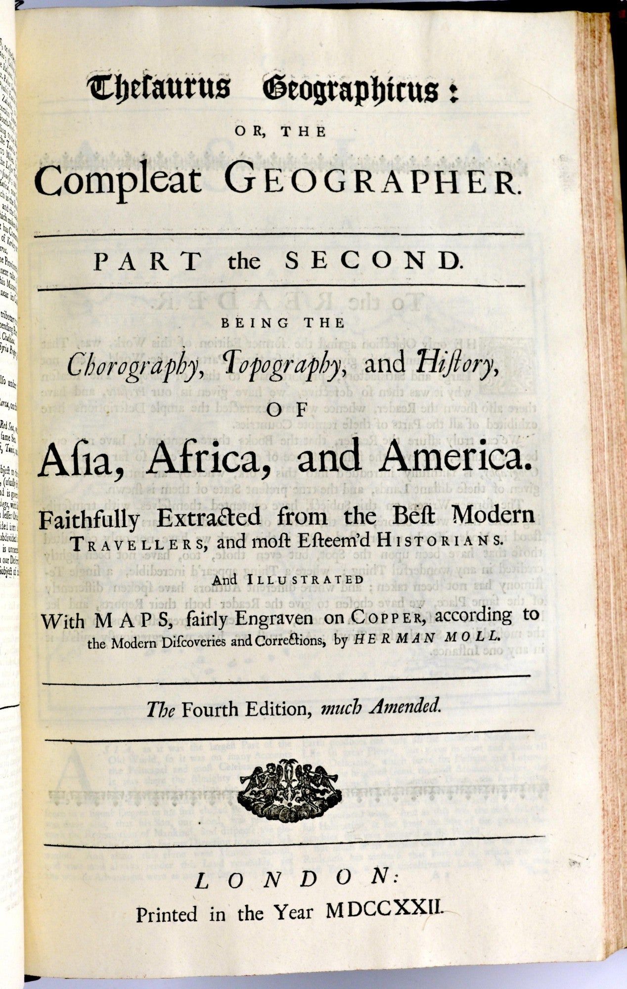 London: J. Knapton, et al., 1723. Fourth Edition. Full Leather. Very Good binding. Folio; in full speckled calf, with raised bands, decorations in gilt and morocco label letters in gilt; li, [lii-liv]; [5], 402 pages; 288 pages; followed by An Alphabetical Table xx pages; with engraved frontispiece.~~Bound in two parts, the first part comprised of Europe; the second part comprised of Asia, Africa, and America; the first part has 18 maps along with a small map inset; the second part has 25 maps, including 4 smaller maps on 2 pages, and a single folding map.~~The joints are beginning to crack but are holding well; lacking a front endpaper; the frontispiece is beginning to detach but is still holding.~~Overall a nice copy of the Fourth Edition of Moll’s Geographer. The first was printed in 1709. Moll was an important London mapmaker in the first half of the 18th century. Very Good binding.