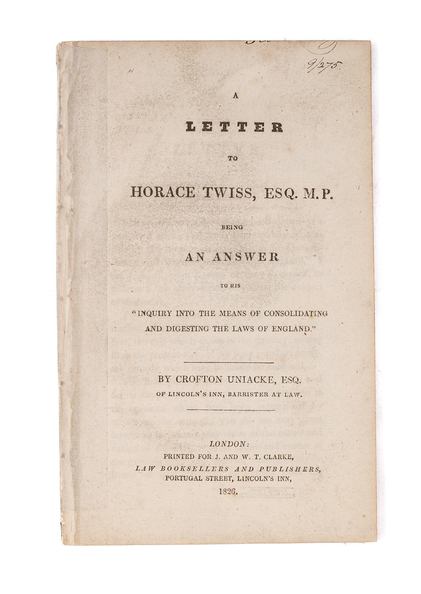 1826. Uniacke, Crofton. A Letter to Horace Twiss, Esq. M.P., Being an Answer to his "Inquiry into the Means of Consolidating and Digesting the Laws of England". London: J. and W.T. Clarke, 1826. 68 pp. Octavo (8" x 5"; 20.3 x 12.7 cm). Disbound stab-stitched pamphlet, spine reinforced with archival tape. Moderate toning, light soiling to exterior, finger smudges to a few leaves, fragment of early signature and annotation to upper-outside corner. A very good copy. $250. * Only edition. OCLC locates 2 copies in North American law libraries (UC-Berkeley, University of Pennsylvania).