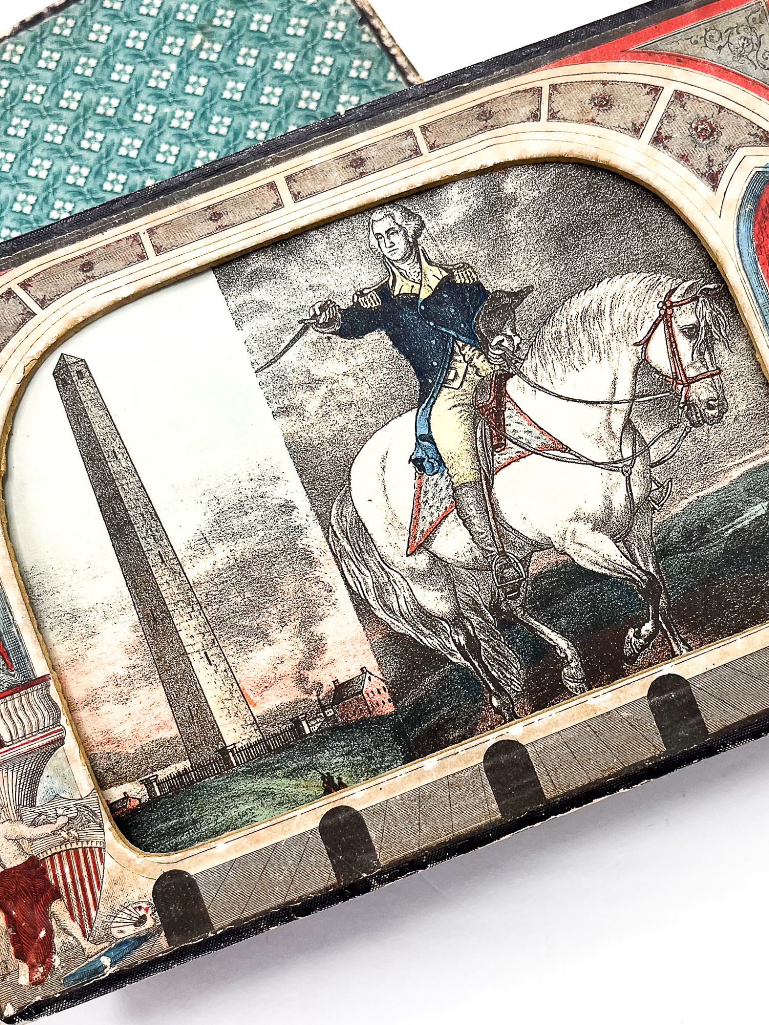 A beautiful example of American mythologizing in the form of visual education. 5.25'' x 8.25'' x 2.25'' (proscenium); 5.5'' x 8.5'' x 2.5'' (box). Original black cartonnage proscenium with viewing window. Hand-colored lithograph of theater curtains and figures pasted on. Hand-colored lithograph panorama on two rollers. Lacking original turnkey (still operable), original 7-page script, sheet of admission tickets, and advertising poster, as typical. With original black cartonnage box bottom (lacking lid). General edgeware and rubbing. Roll with repairs and reinforced backing added to a few scenes; final scene with extended tear and loss at bottom margin. A functional piece with vibrant colors.