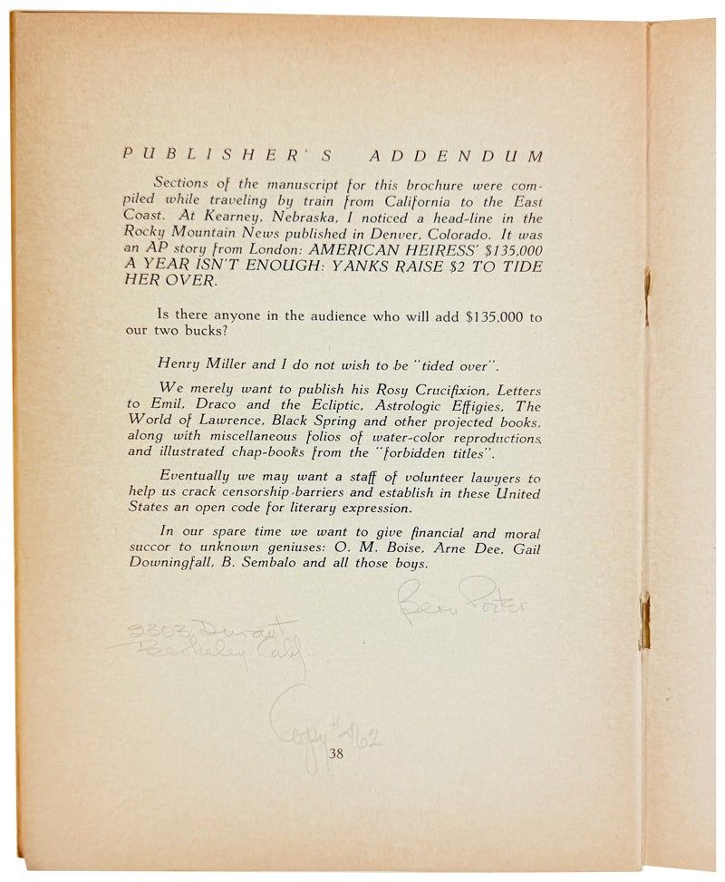 Houlton, ME: Bern Porter, 1944. Very Good/Very Good. [Houlton, ME: Bern Porter, 1944]. First Edition, Limited to 950 copies of which this is no. 462. Octavo; publisher's staplebound self-wrappers in yellow printed dust jacket; 38pp.; Light wear to wrapper margins, textblock uniformly toned, else Very Good and sound. Signed by the publisher with limitation provided in pencil on p. 38.