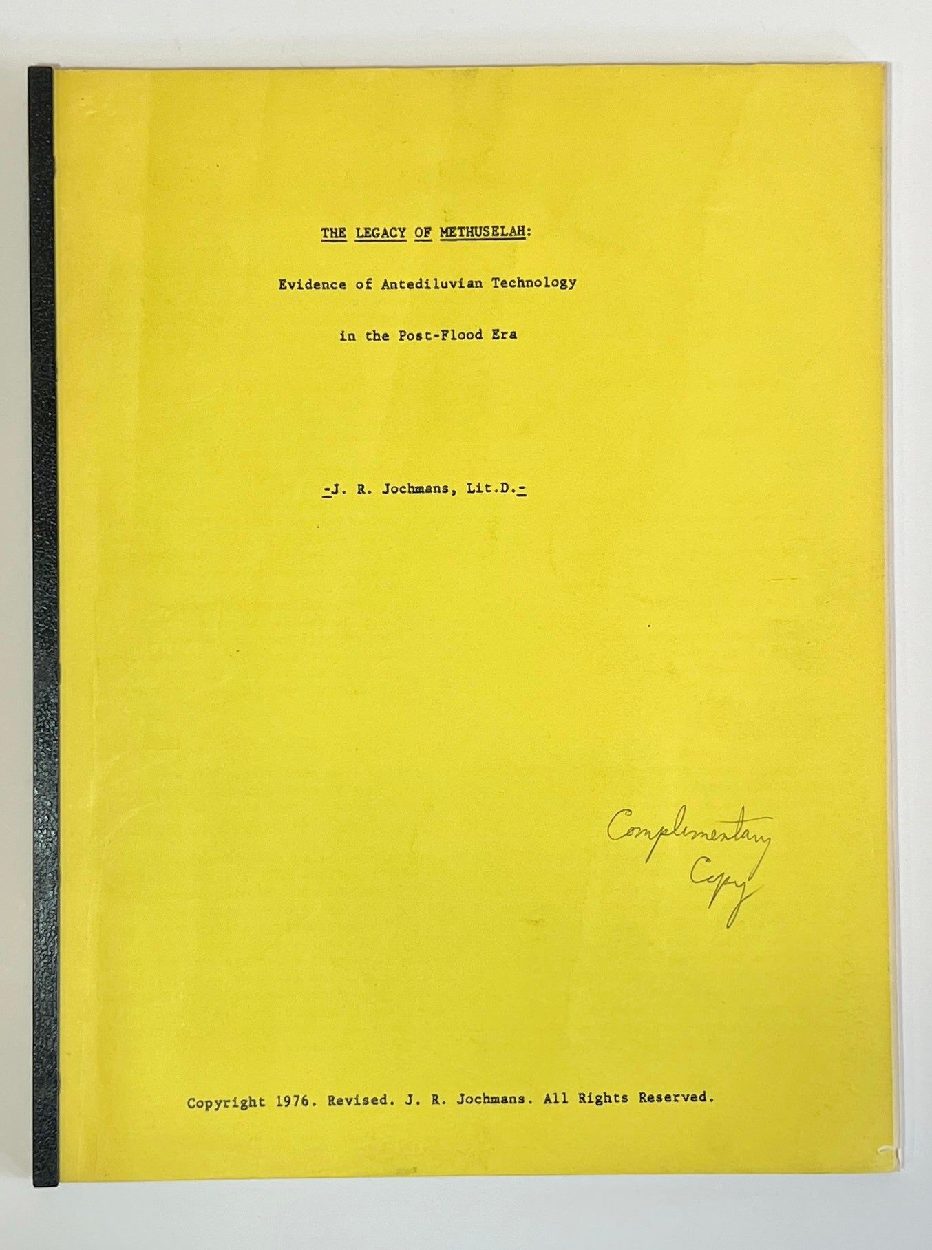 [n.p.]: J.R. Jochmans, 1976. First Edition. Paperback. Very Good. 43p. Very Good. Yellow card covers, lightly soiled, a small tear at the bottom-right corner of the front cover. Firmly bound with a fast-back binding, toned pages, clean otherwise. Jochmans's monograph that argues against von Daniken's theory of ancient astronauts to explain out-of-place artifacts. Two copies located in OCLC. From the collection of ufologist Tom Benson.