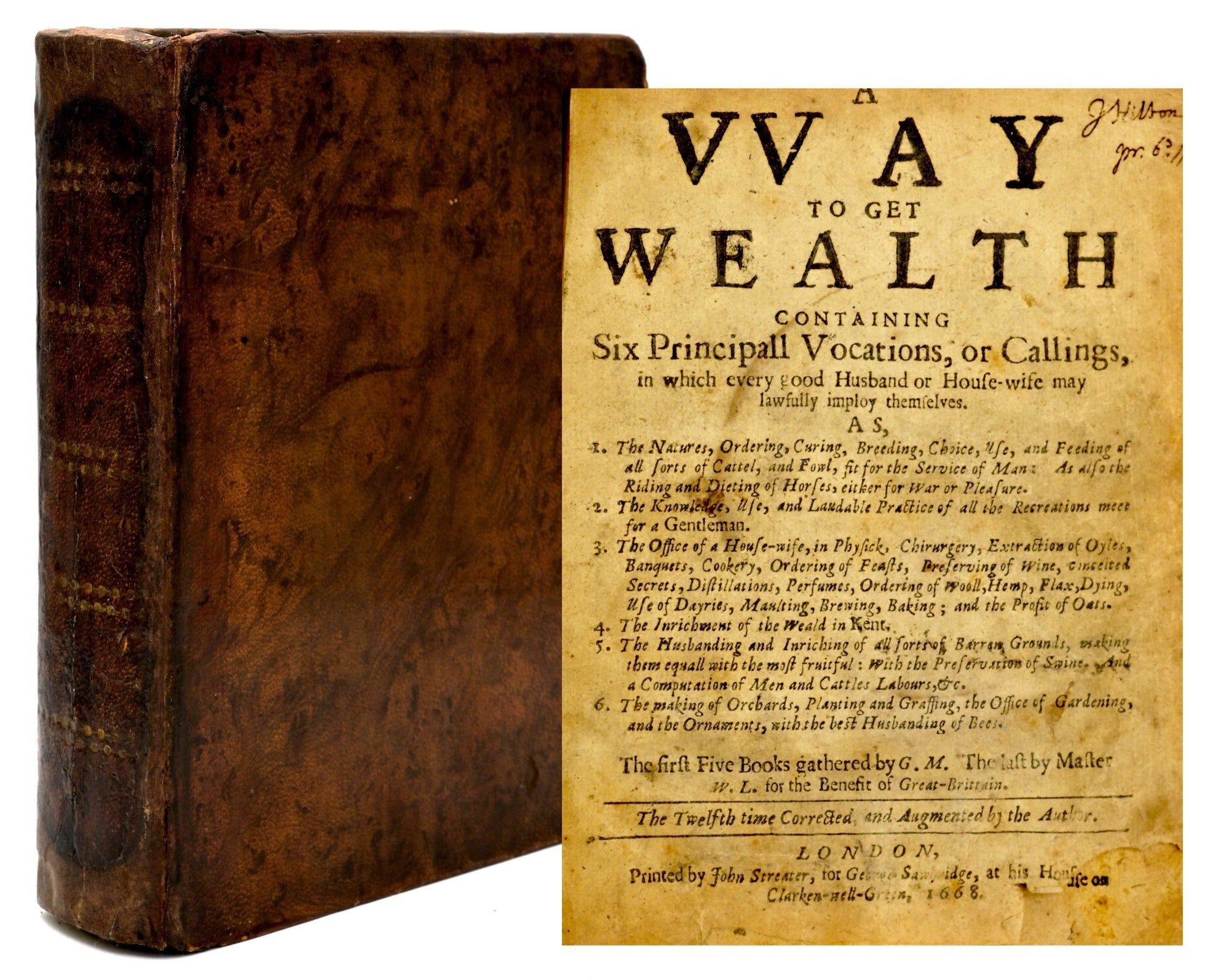 London: Printed by John Streater, for George Sawbridge, 1668. Twelfth Edition. Full Leather. Very Good binding. The twelfth edition of Gervase Markham’s A VVay to Get Wealth was a popular handbook for gardening, outdoor sports, and agriculture, which Poynter in his bibliography states “must have received a great deal of ill-usage and it is not surprising that so few copies of the various editions have survived” (pp. 153-154). ~~With engraved illustrations, tables, headpieces, tailpieces, initials, and some title pages illustrated; general title page and divisional title pages; separate pagination for the six sections, with an additional title page for the House-Wife’s Garden. Cheap and Good Husbandry; Country Contentments; The English House-Wife; The Inrichment of the Weald of Kent; Markham’s Farewell to Husbandry; A New Orchard and Garden; and The Country House-Wife’s Garden. Lacking the final leaf, else collates complete against the ESTC: [12], 146, [14], 92, [12], 188, [4], 19, [7], 126, [10], 102 pp.~~Small chip to the bottom corner of the title page, affecting two characters only of the publication. Previous owners’ names on the front endpapers, and one on the title page; nameplate on the front flyleaf. Some trimming to the top edge, not affecting the text. Full mottle calf, with Japanese tissue on the joints and extremities of the spine. (ESTC R32527. Poynter Bibliography of Gervase Markham, 153-154. Fussell Old English Farming Books, 29-31. Aslin Books on Agriculture, 87. Bitting Gastronomic Bibliography, 309. Cecil Bibliography of Works on Gardening, 11-12.). Very Good binding.
