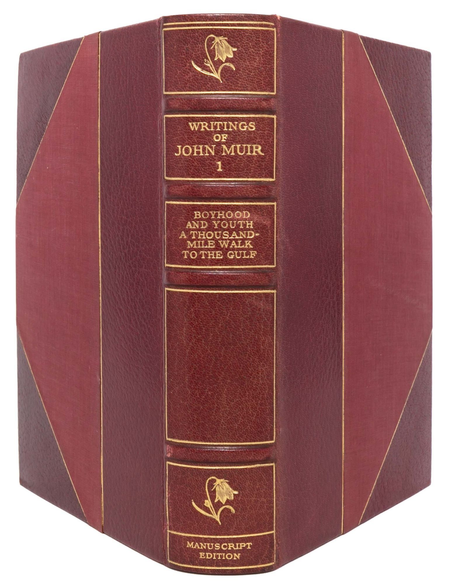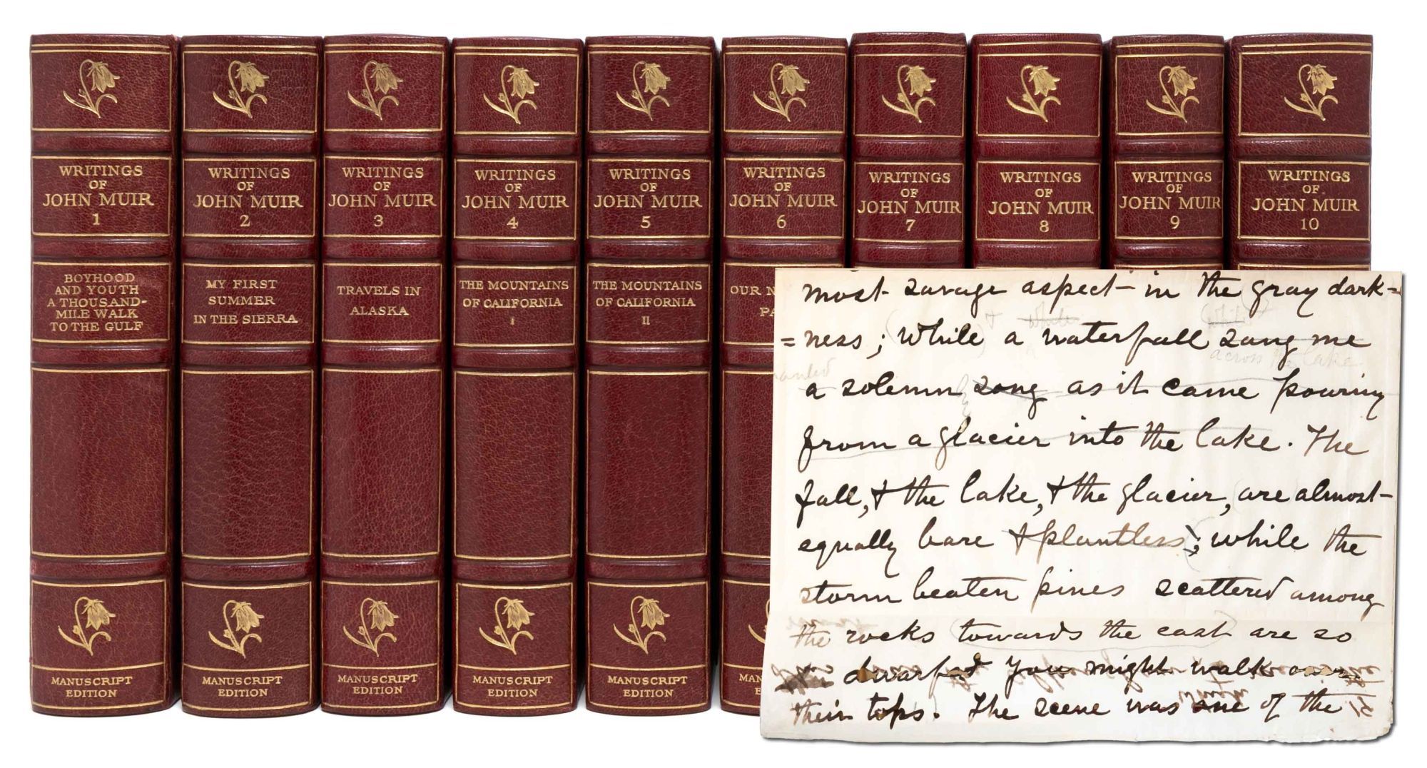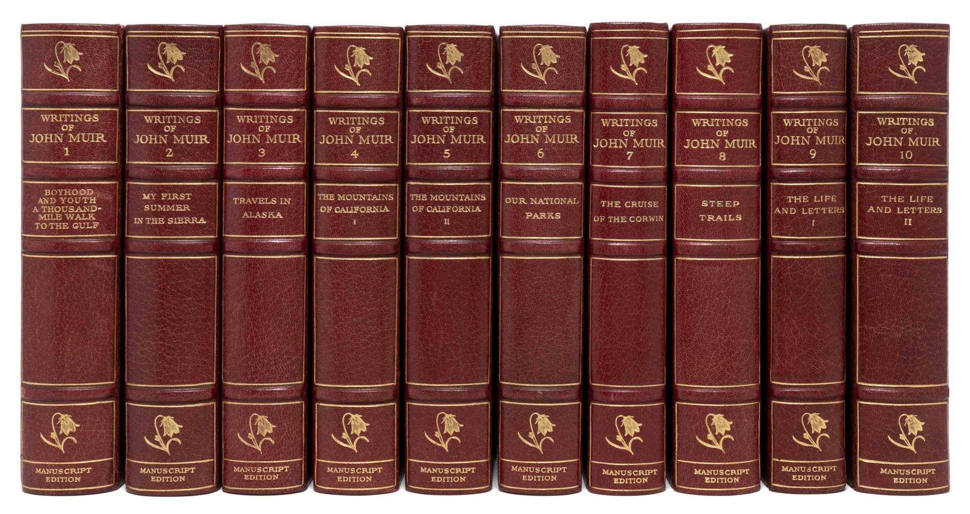 Boston: Houghton Mifflin, 1916. Limited edition. Fine. One of 750 numbered copies, this being copy 153, with a leaf of ink manuscript (195 x 155 mm.), heavily edited in pencil by Muir. A Fine set. Ten volumes, octavo (145 x 213 mm)., occupying 385 mm. (15.5 inches) of shelf space. With hand-colored frontispieces in each volume, plus many other plates. Publisher's three-quarter red morocco over red cloth, ruled in gilt. Top edge gilt. Red marbled endpapers. Small twentieth-century bookplates (L.W. Jordan Jr.) to each pastedown. Red ribbon bookmark in each volume. A lovely example of this beautiful set.