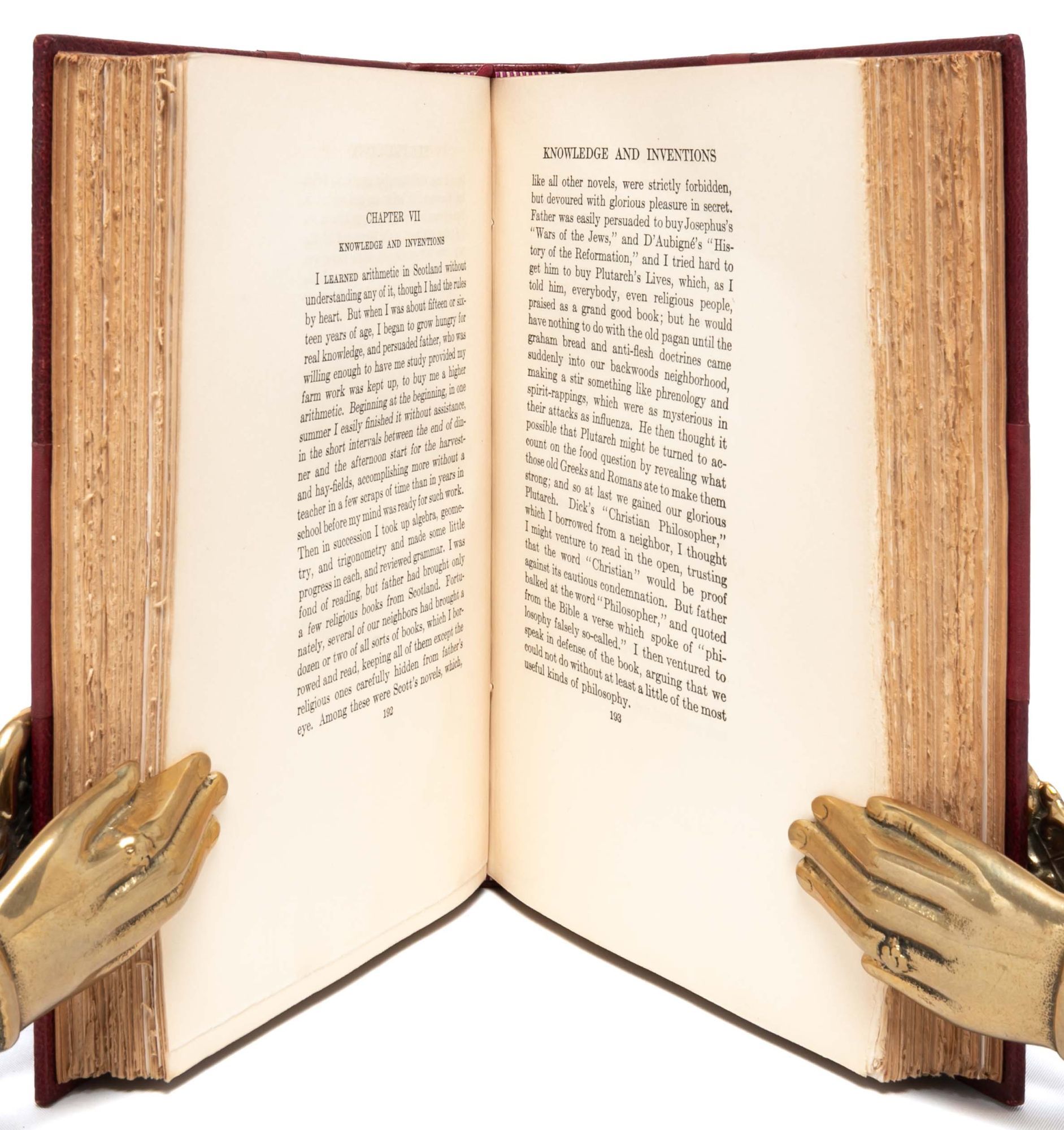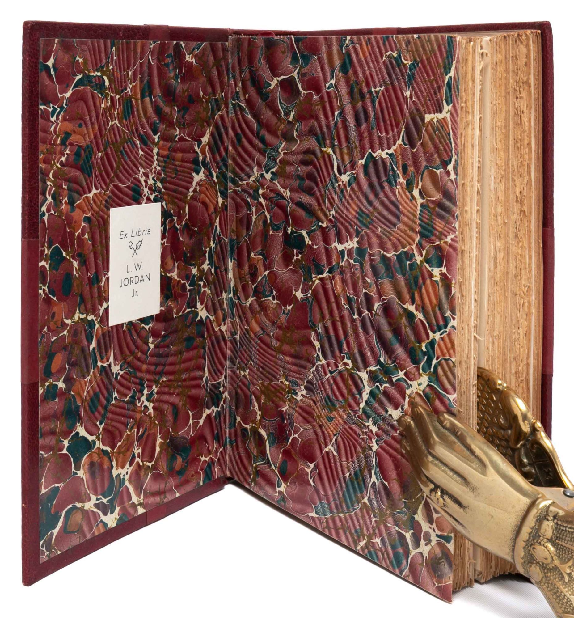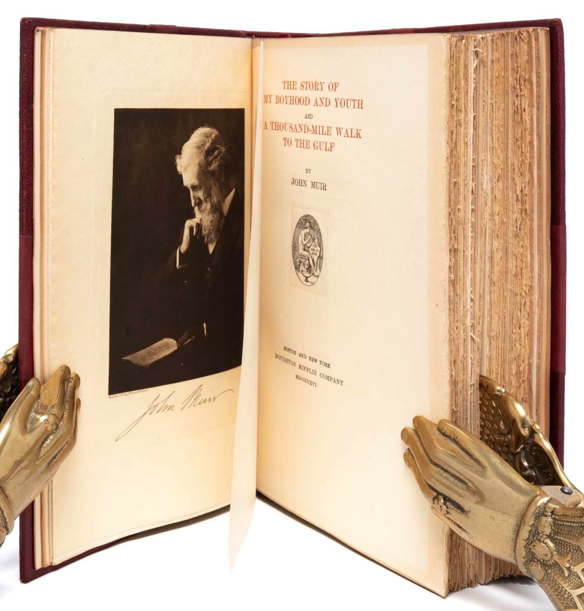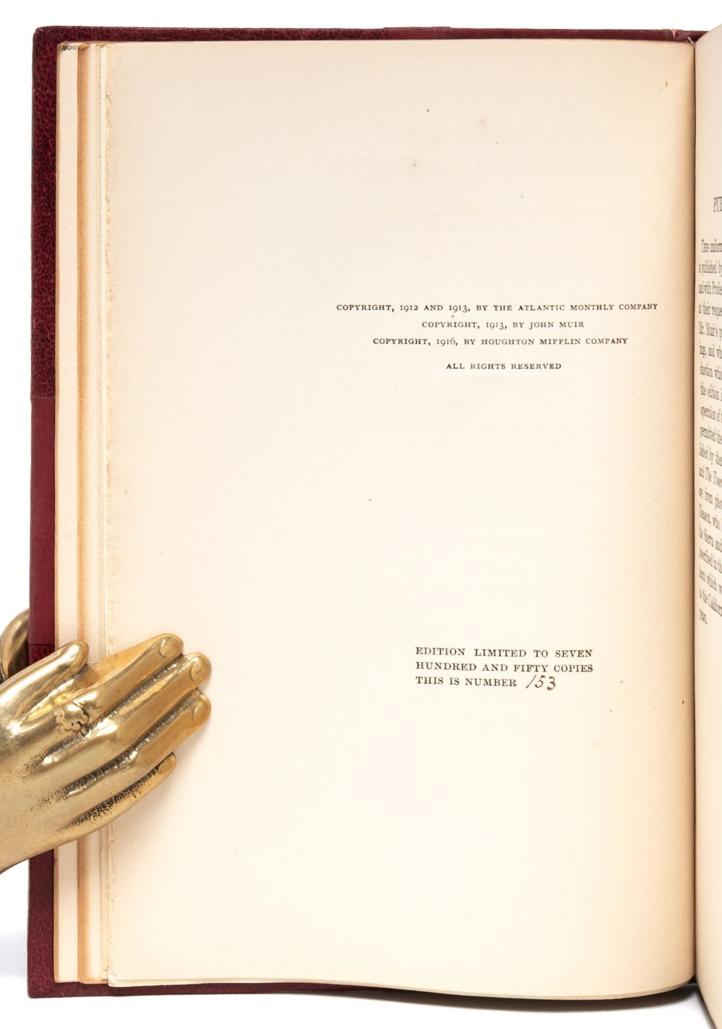 Boston: Houghton Mifflin, 1916. Limited edition. Fine. One of 750 numbered copies, this being copy 153, with a leaf of ink manuscript (195 x 155 mm.), heavily edited in pencil by Muir. A Fine set. Ten volumes, octavo (145 x 213 mm)., occupying 385 mm. (15.5 inches) of shelf space. With hand-colored frontispieces in each volume, plus many other plates. Publisher's three-quarter red morocco over red cloth, ruled in gilt. Top edge gilt. Red marbled endpapers. Small twentieth-century bookplates (L.W. Jordan Jr.) to each pastedown. Red ribbon bookmark in each volume. A lovely example of this beautiful set.