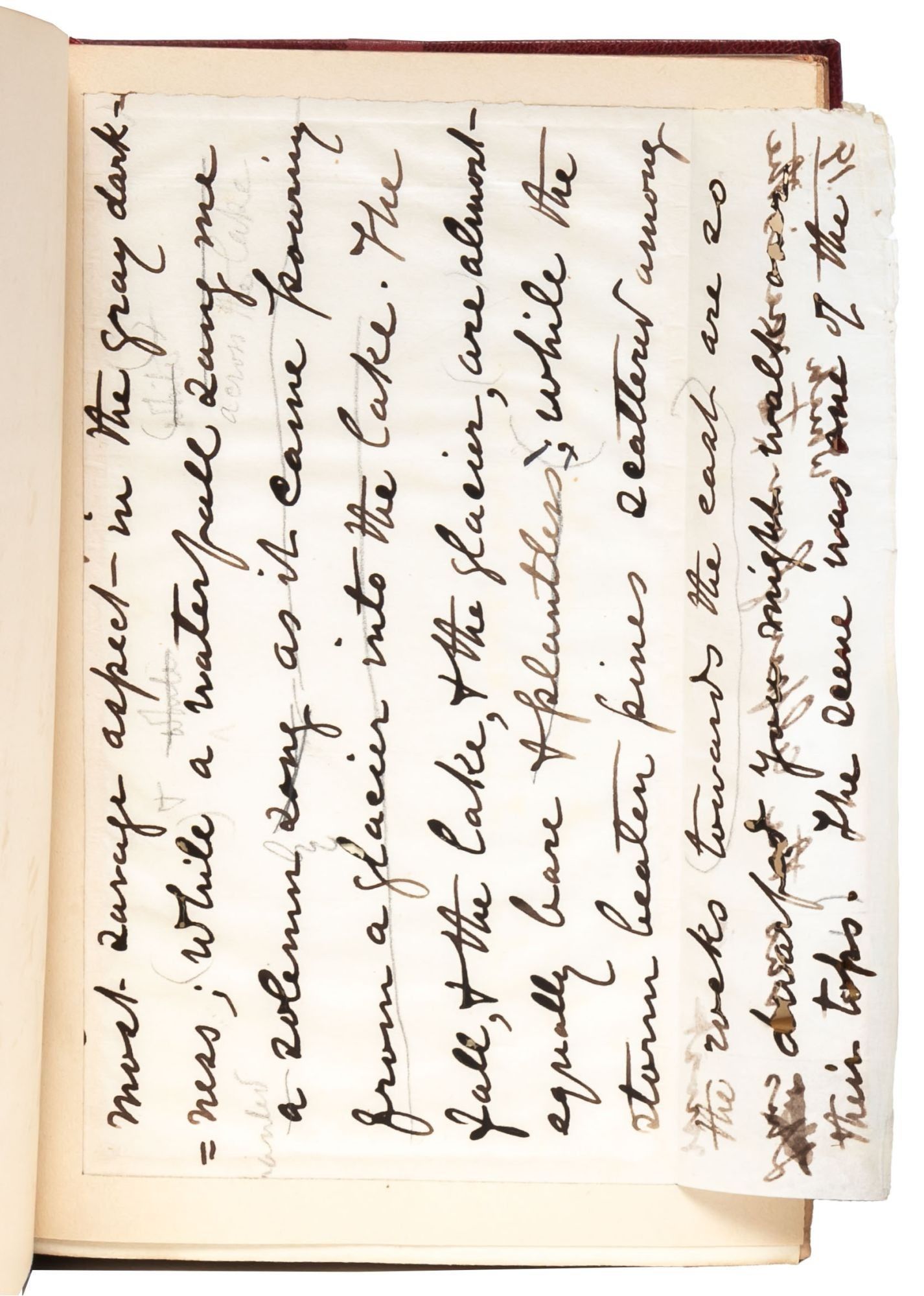 The manuscript leaf comprises material that may have figured into The Mountains of California. The excerpt reads, "...most savage aspect – in the gray darkness; while a waterfall sang me a solemn song as it came pouring from a glacier into the lake. The fall, + the lake, + the glacier, are almost equally bare + plantless, while the storm beaten pines scattered among the [?] toward the east are so dwarfed you might walk among their tops. The scene was one of the..."
